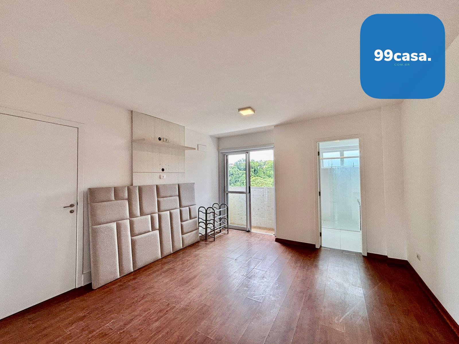 Suíte com armários planejados, banheiro espaçoso e sacada privativa