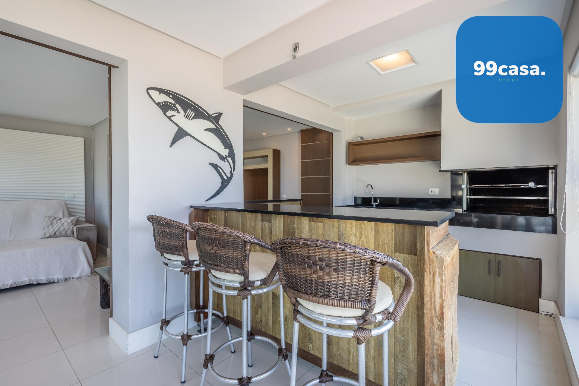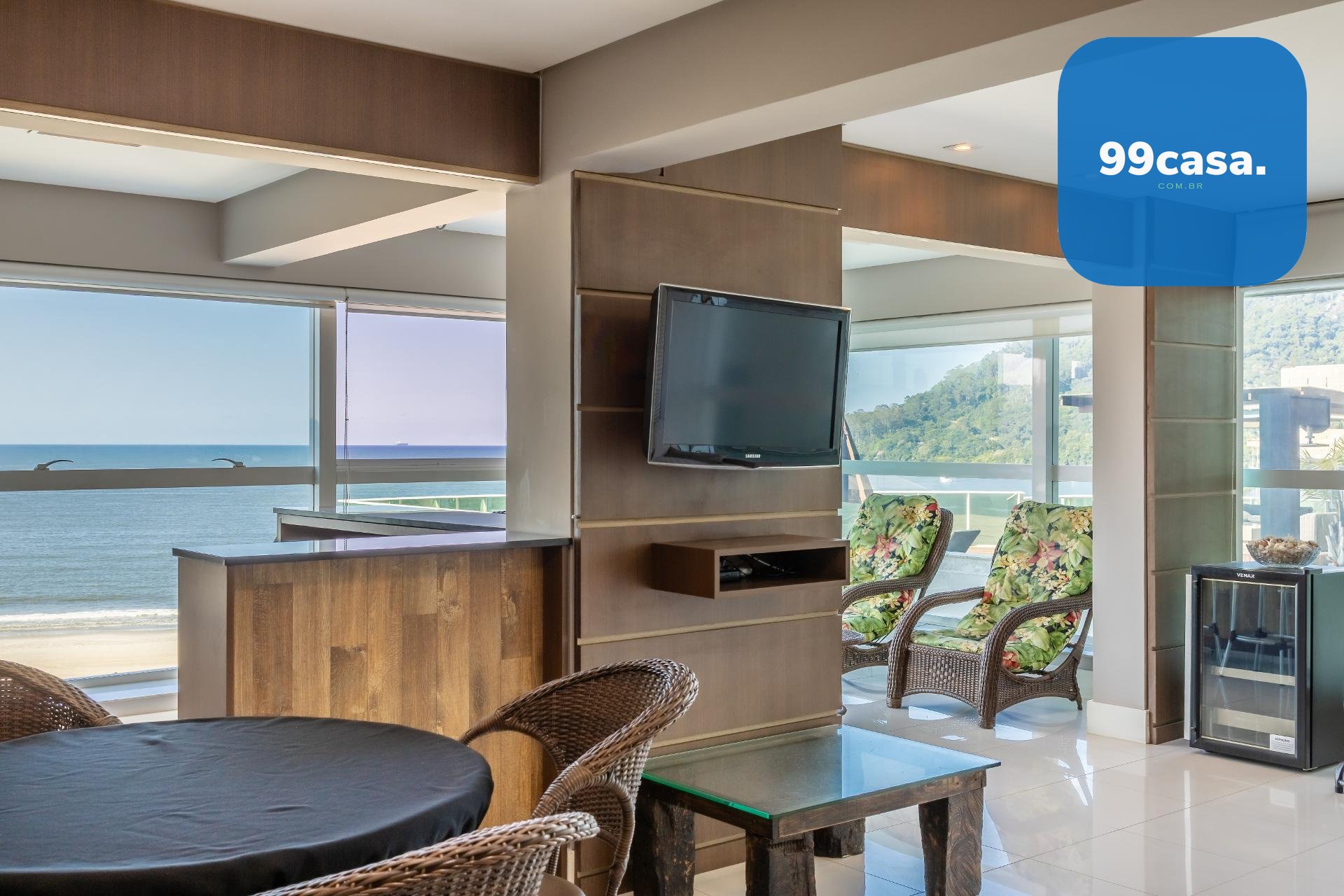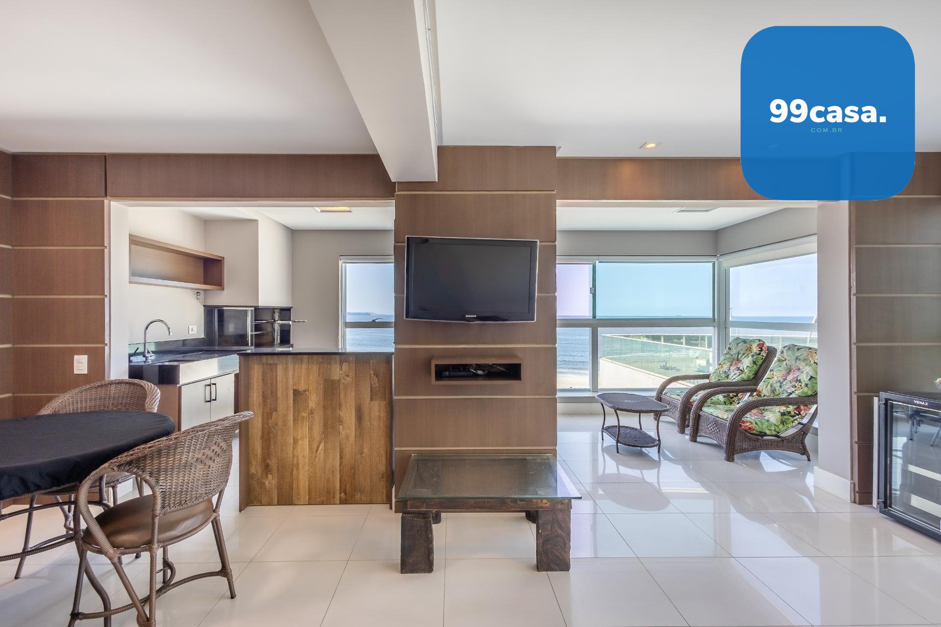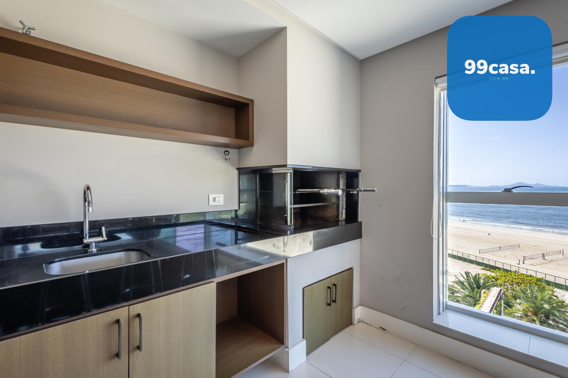 Varanda gourmet com churrasqueira a carvão e integrada a área social, proporcionando uma vista definitiva do mar. A cozinha e ampla e conta com espaço para mesa de café e refeições rápidas. Há ainda área de serviço independente e dependência de empregada.