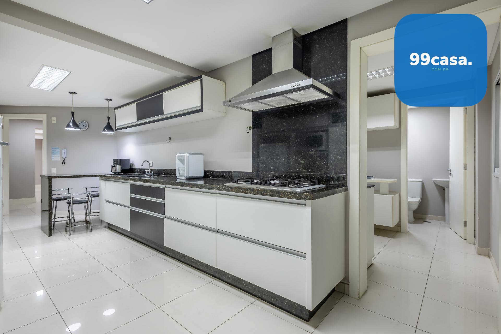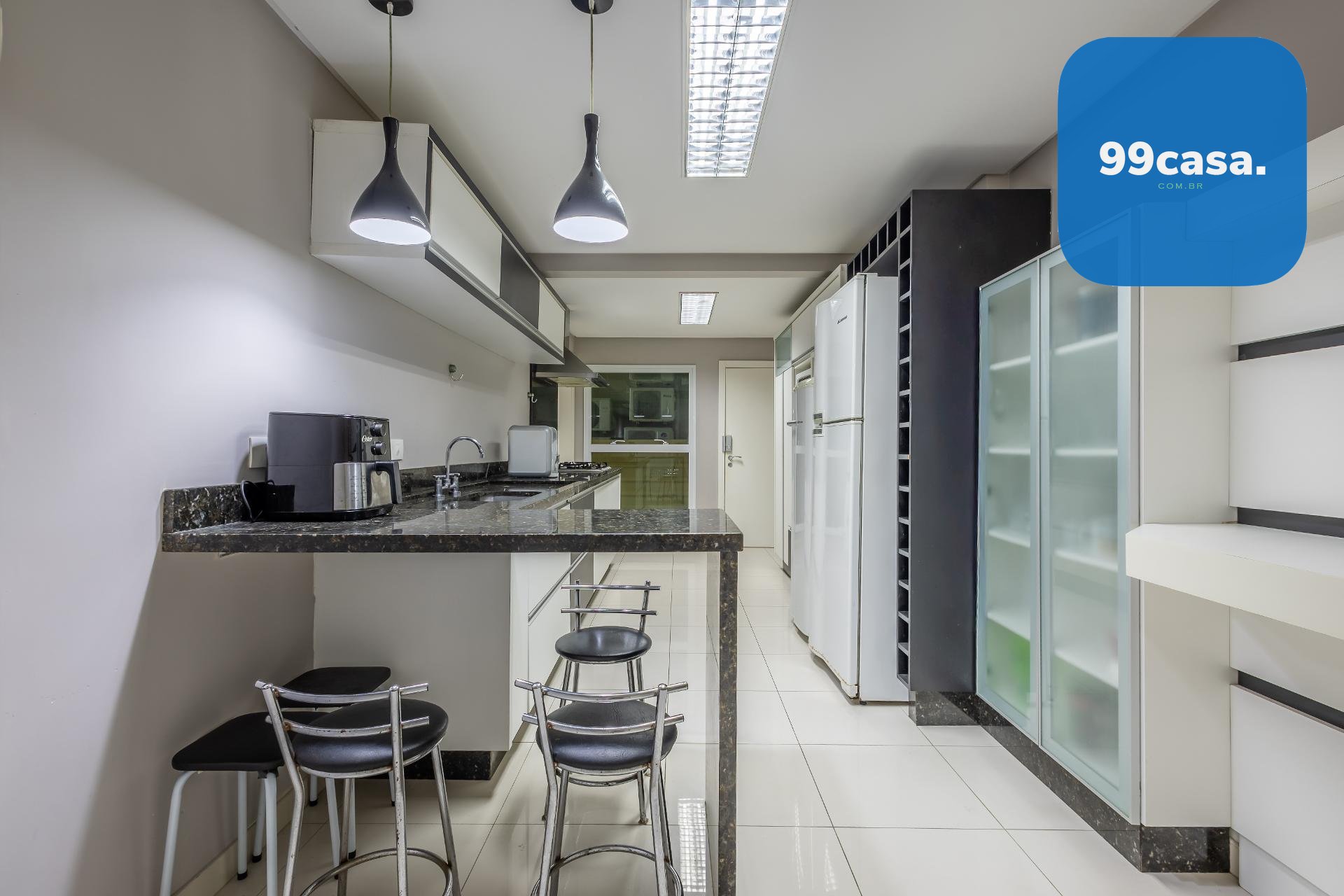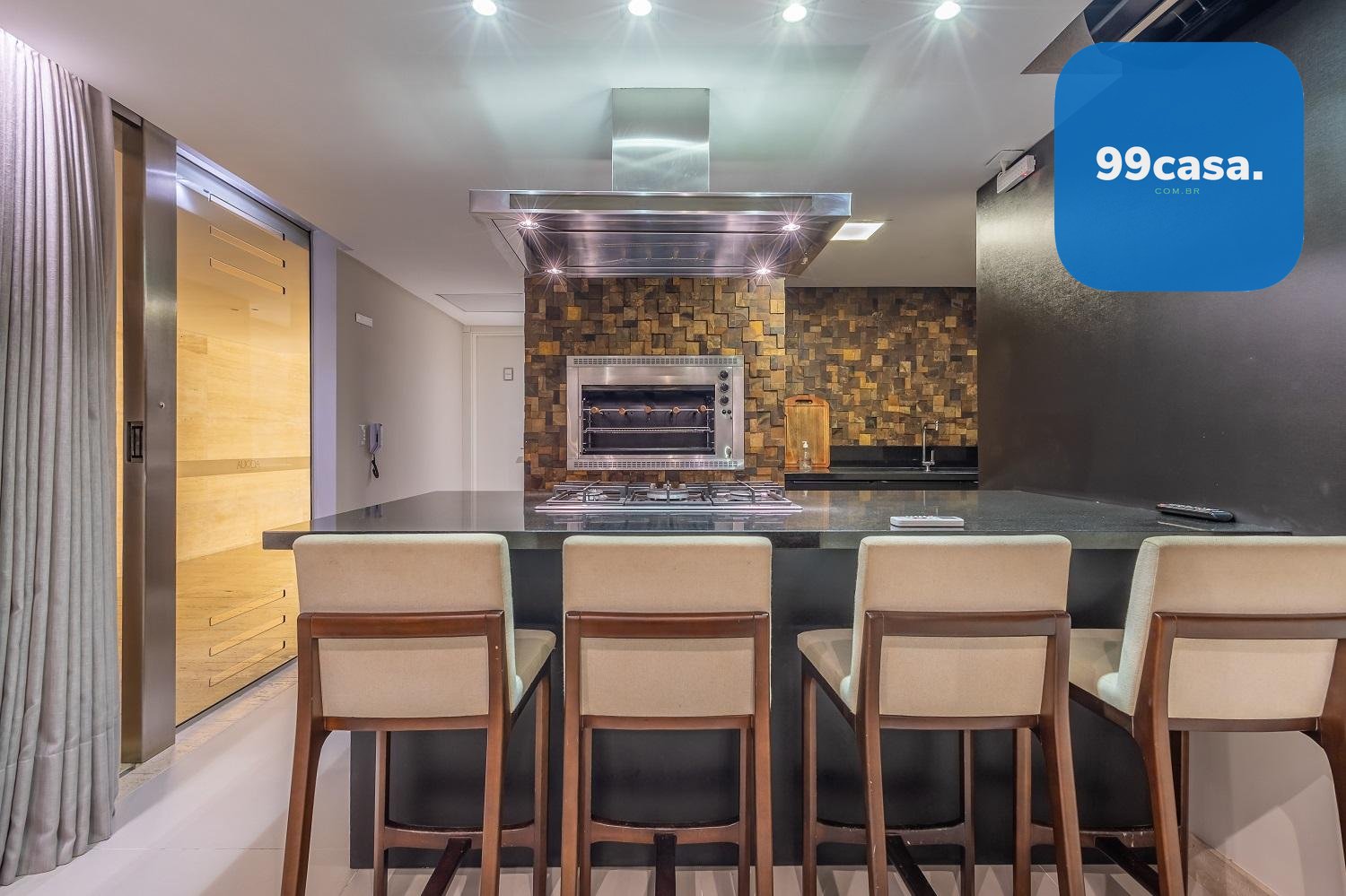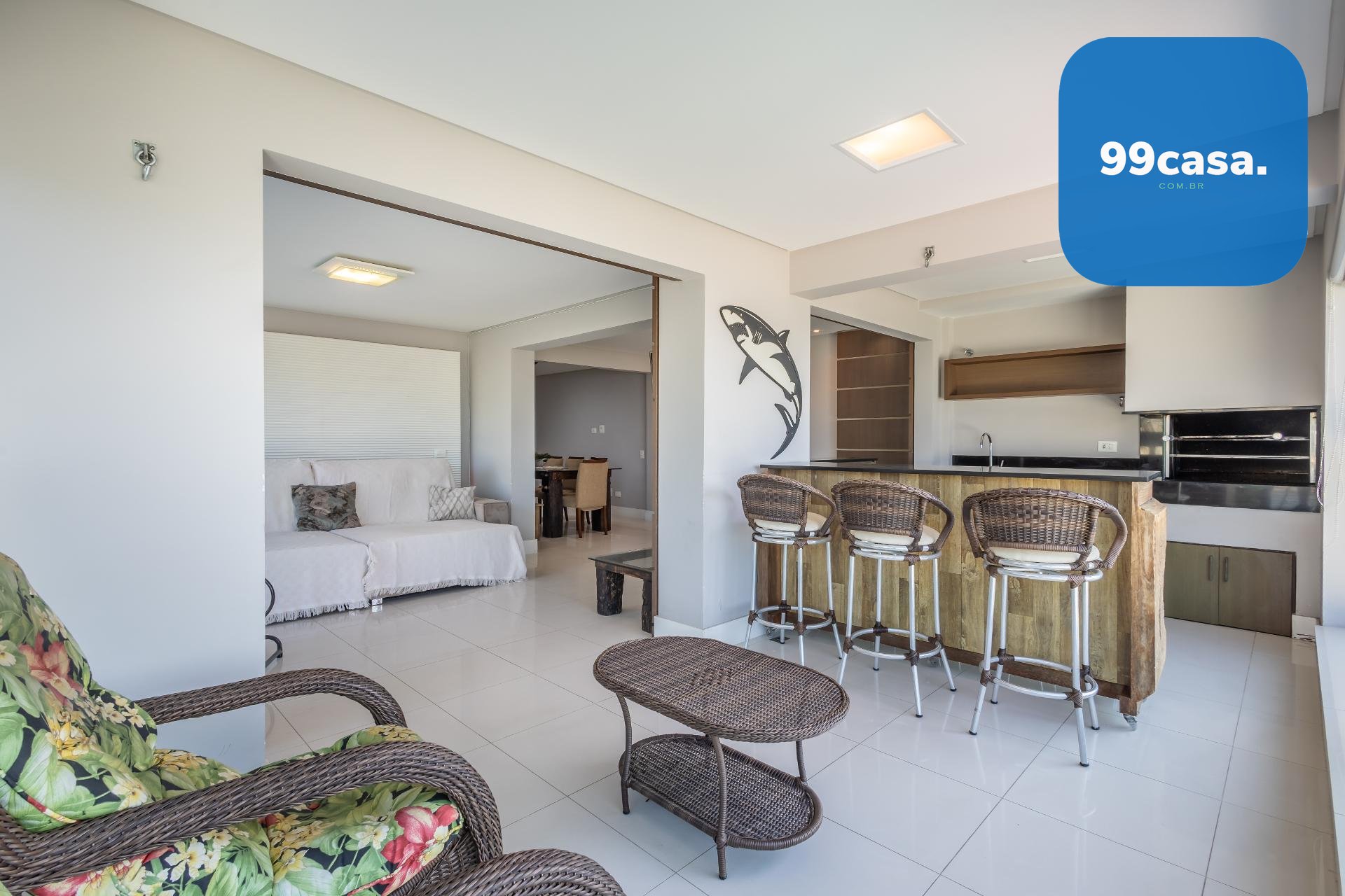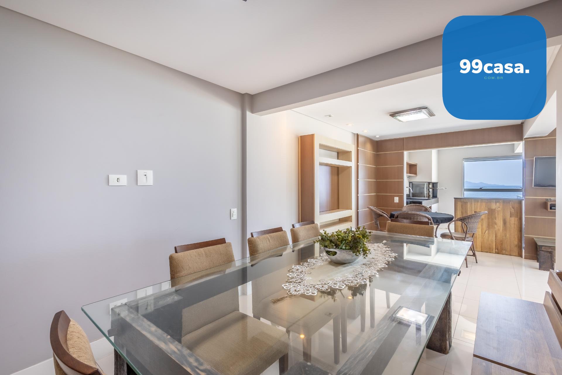 Varanda gourmet com churrasqueira a carvão e integrada a área social, proporcionando uma vista definitiva do mar. A cozinha e ampla e conta com espaço para mesa de café e refeições rápidas. Há ainda área de serviço independente e dependência de empregada.