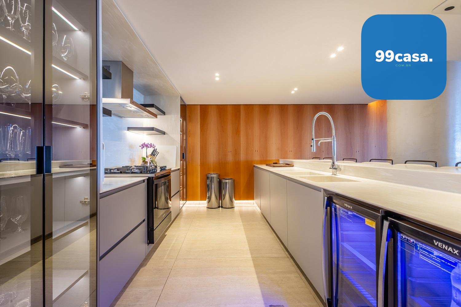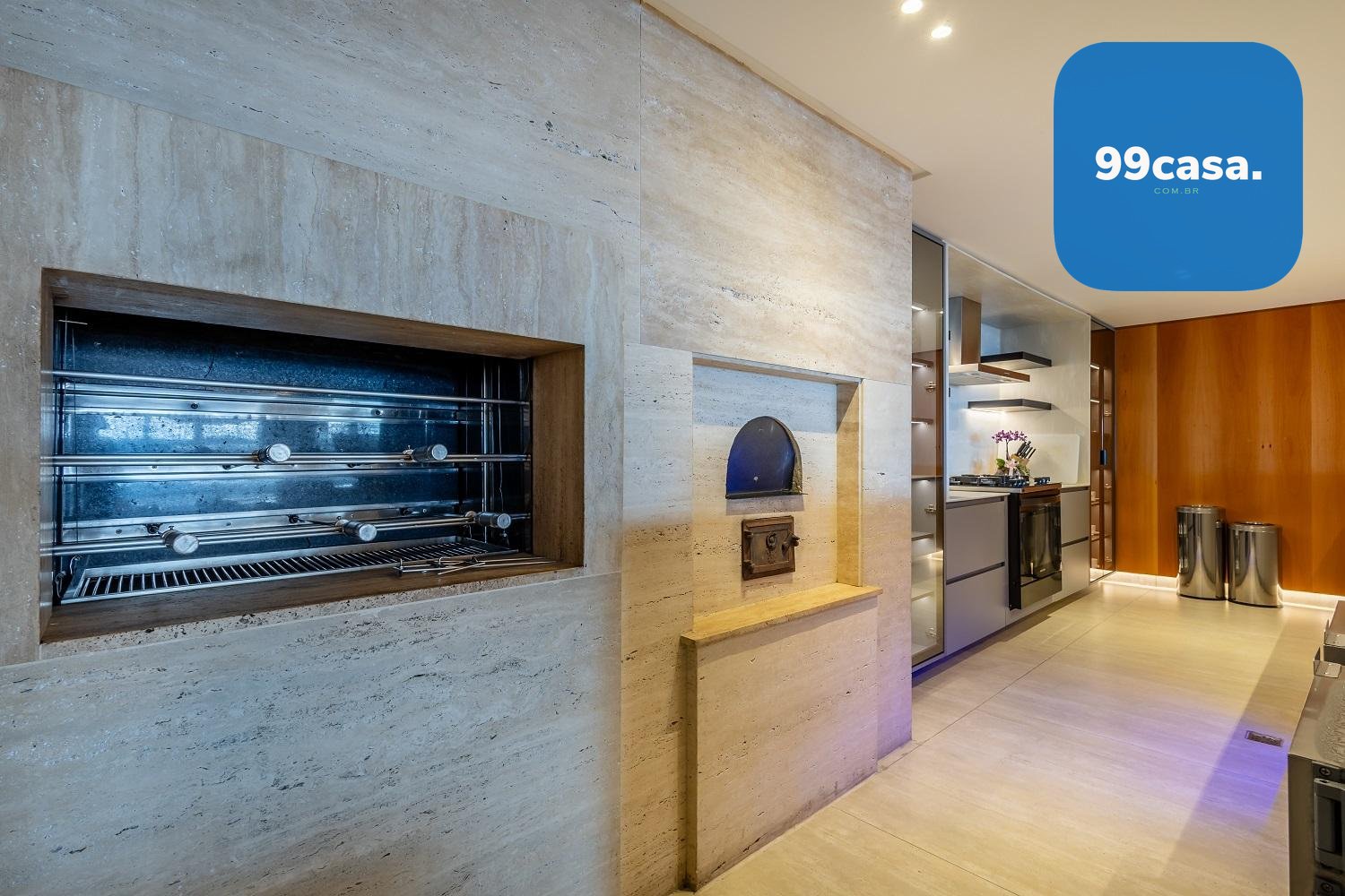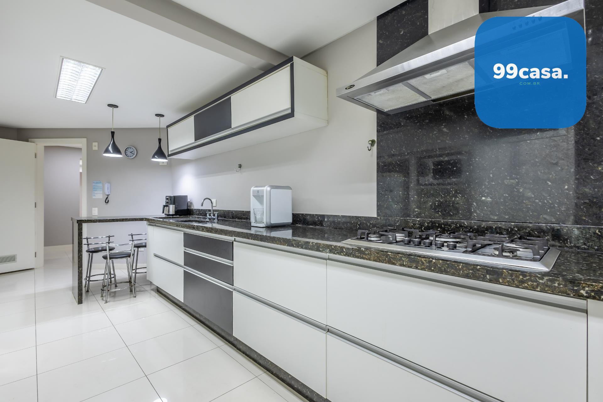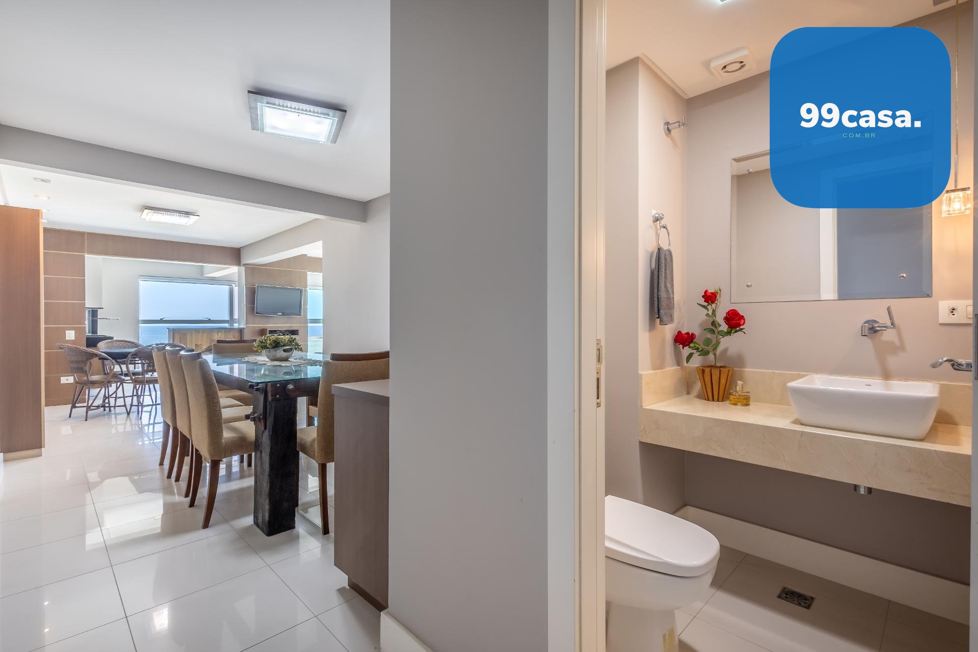 Varanda gourmet com churrasqueira a carvão e integrada a área social, proporcionando uma vista definitiva do mar. A cozinha e ampla e conta com espaço para mesa de café e refeições rápidas. Há ainda área de serviço independente e dependência de empregada.
