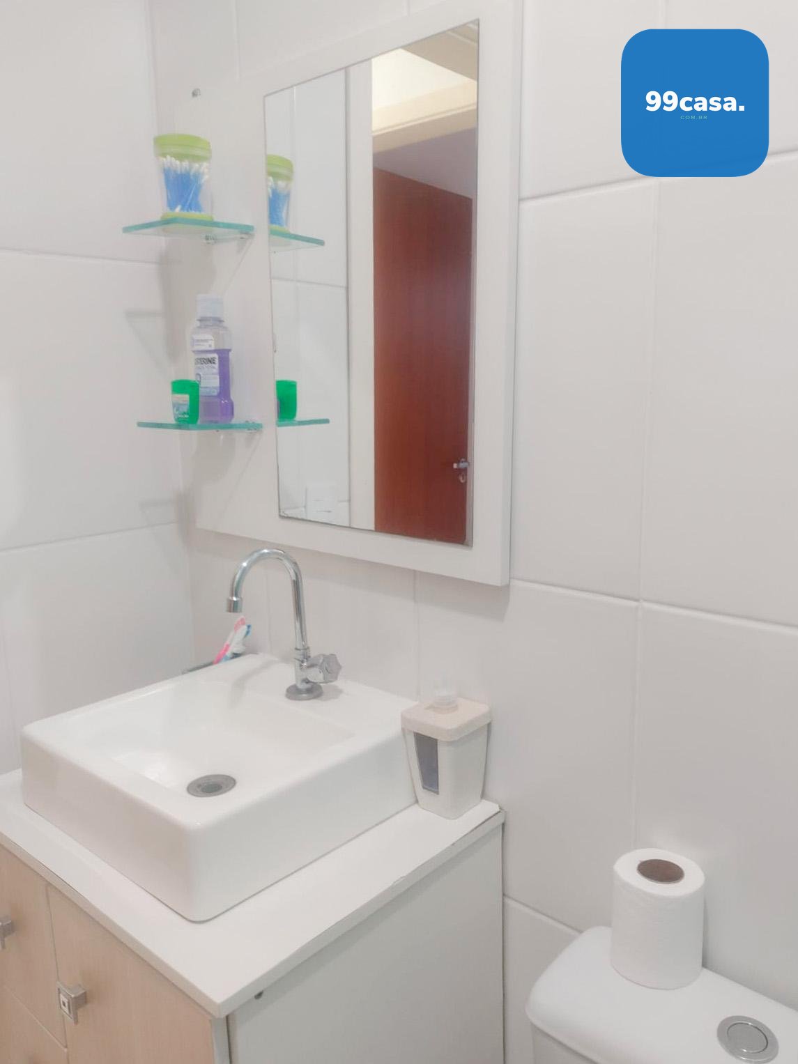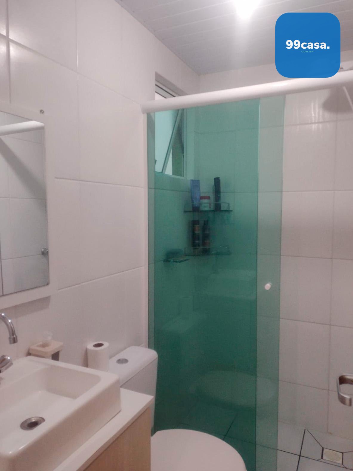 Banheiro completo com box de vidro, armário, espelheira e prateleiras.