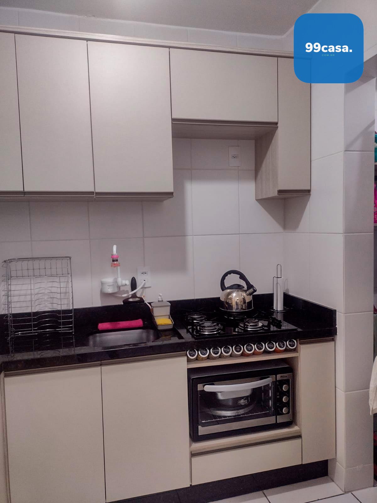 Cozinha com móveis sob medida, bancada e rodapé em granito, integrada à lavanderia com armários e tanque.