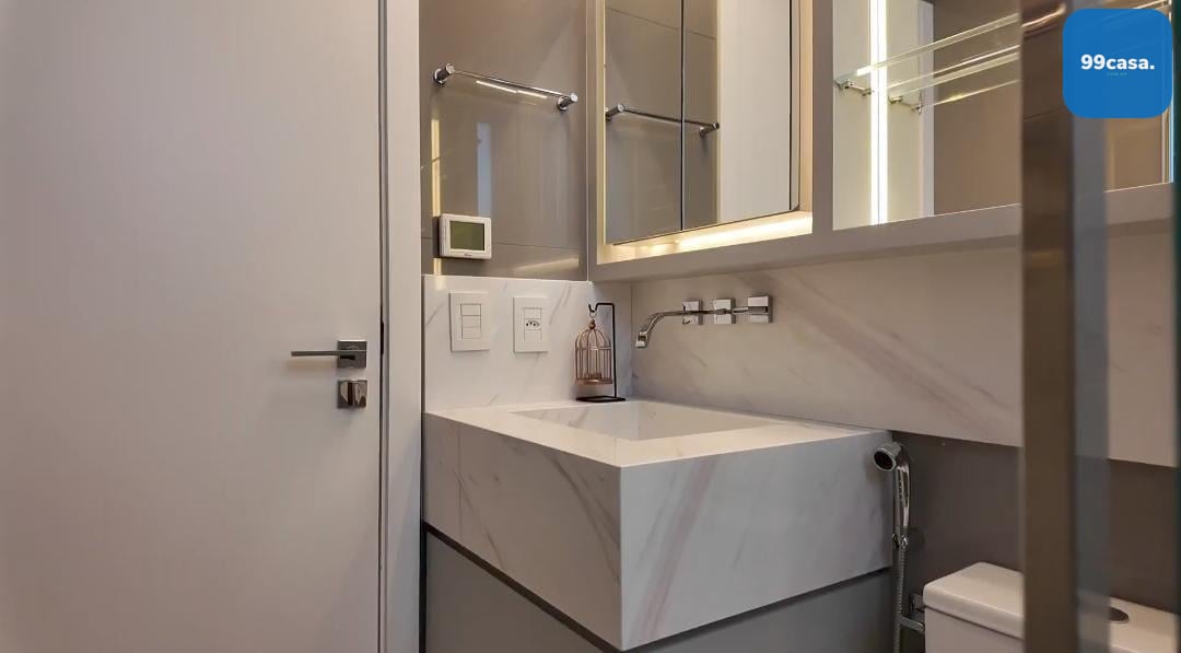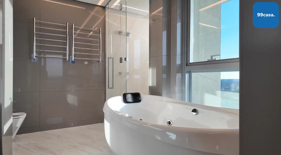 Acabamentos Distintos: Piso aquecido Hotfloor, móveis decorativos de grife, como Ton Sour e Artefacto, e mármores Griss Armani e Onyx.