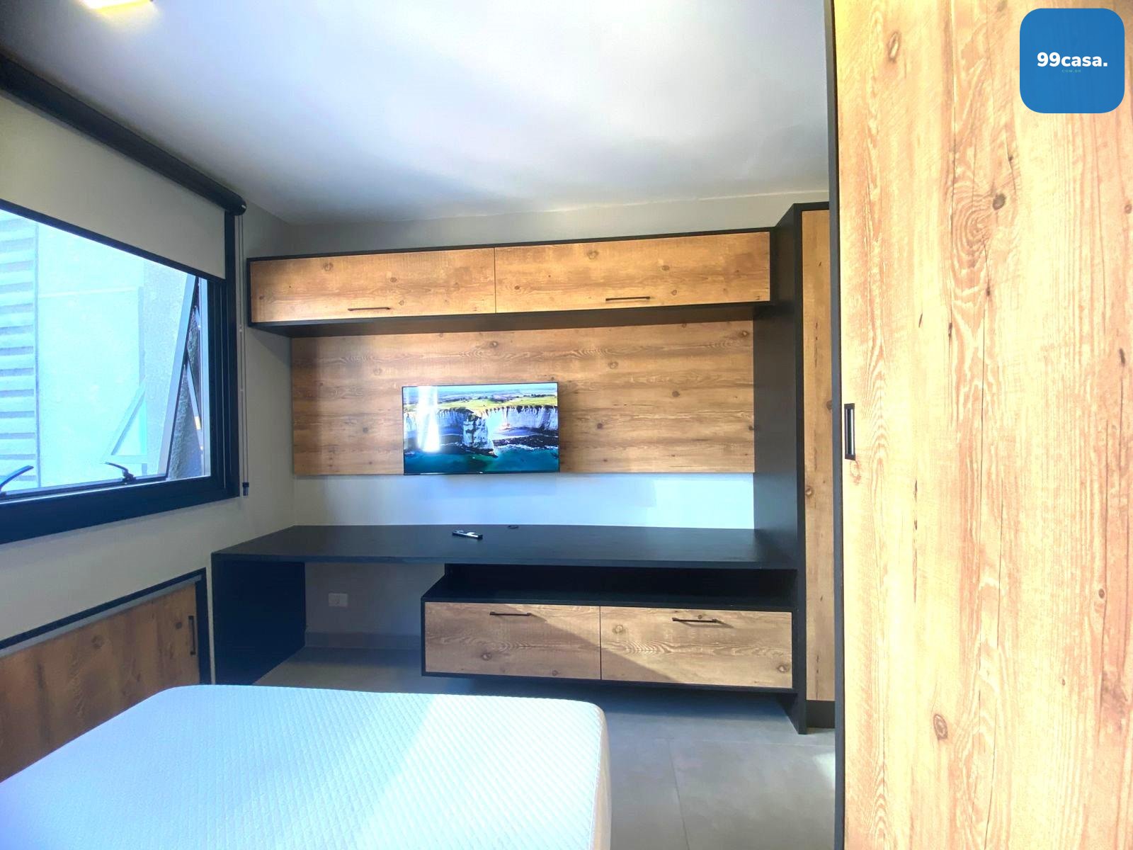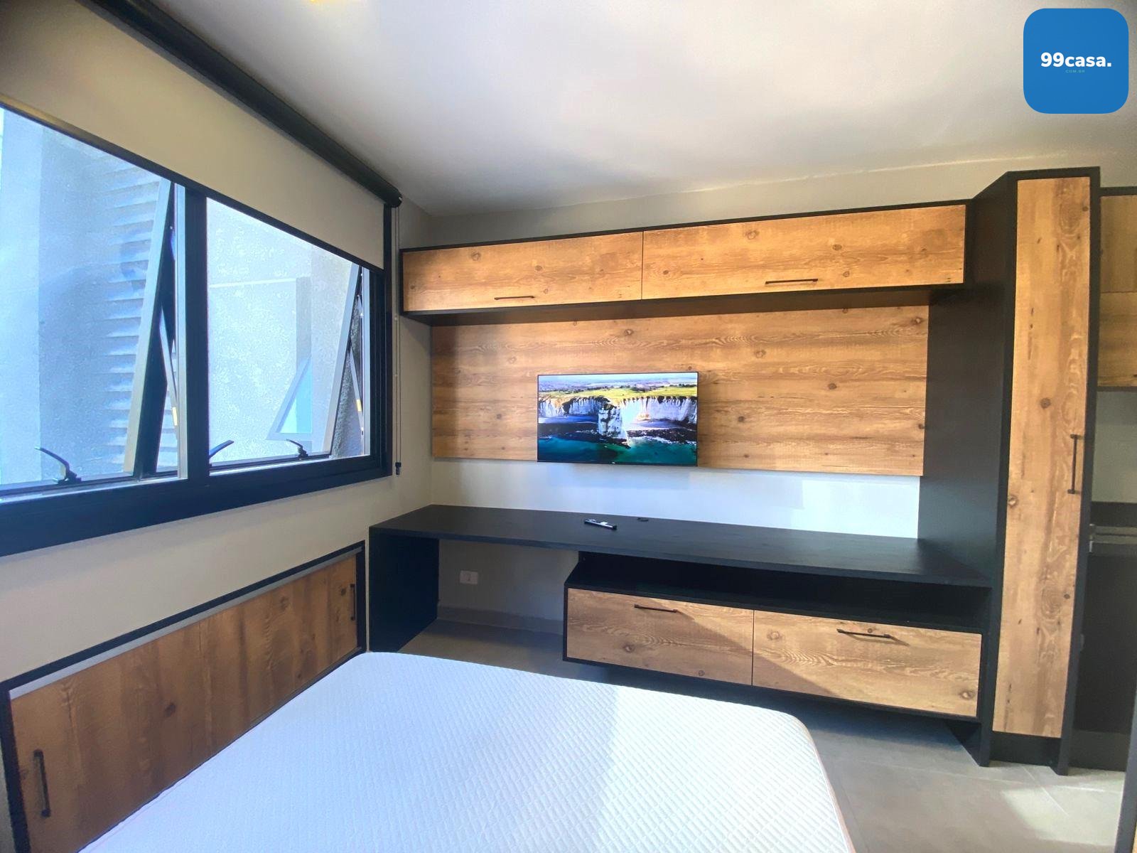 Cama de casal e guarda roupas.