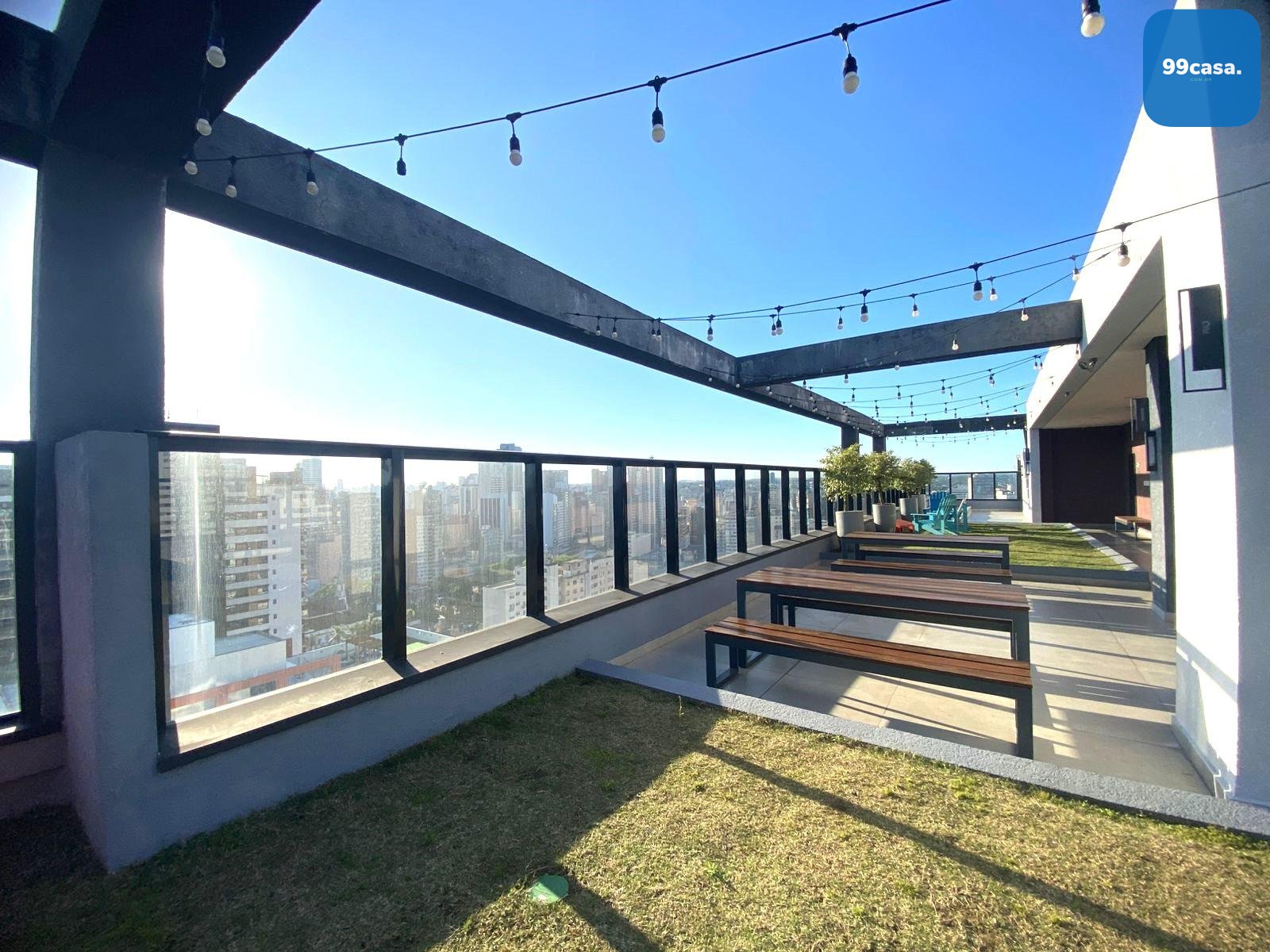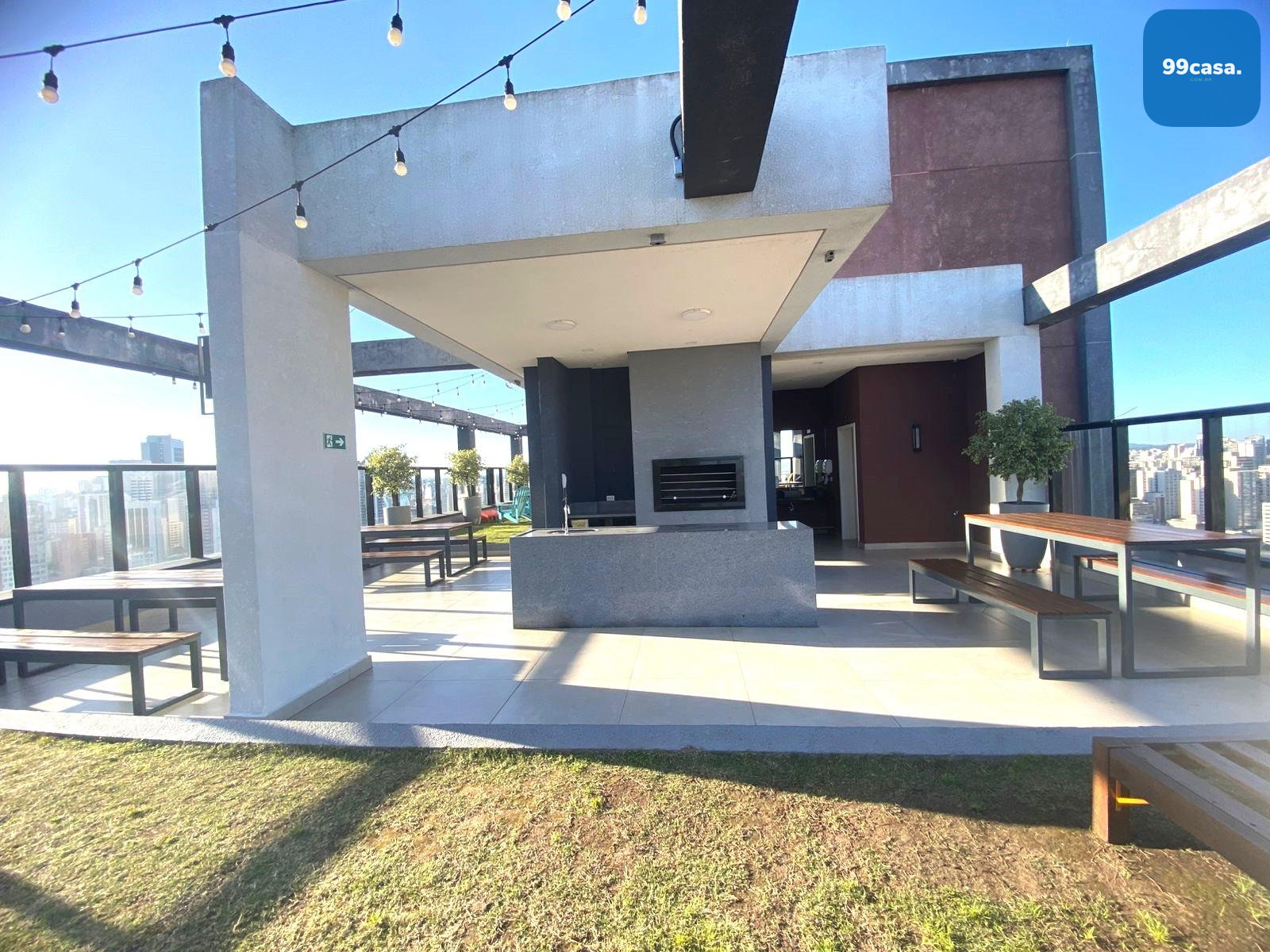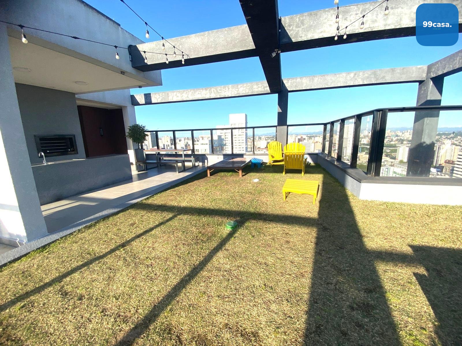 Roof top com churrasqueira, cadeiras pra aproveitar o sol e grama natural