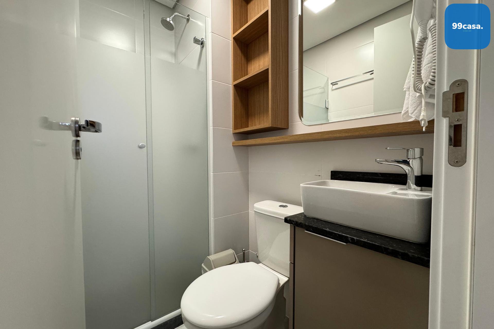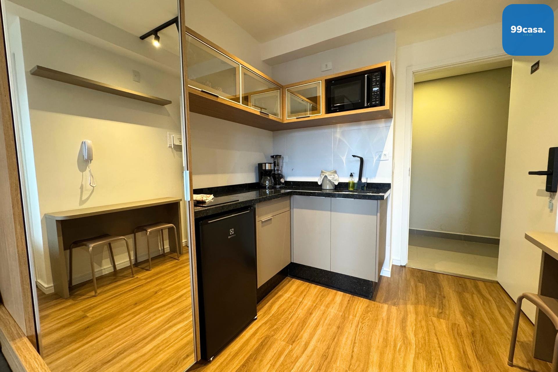 - Cozinha equipada, cama, armário, bancada de trabalho e ar-condicionado
