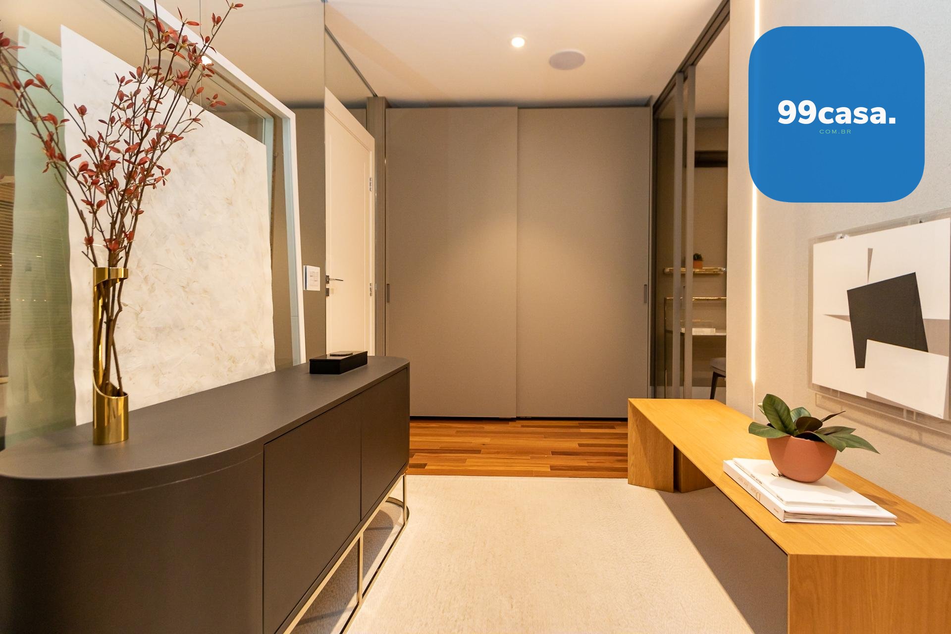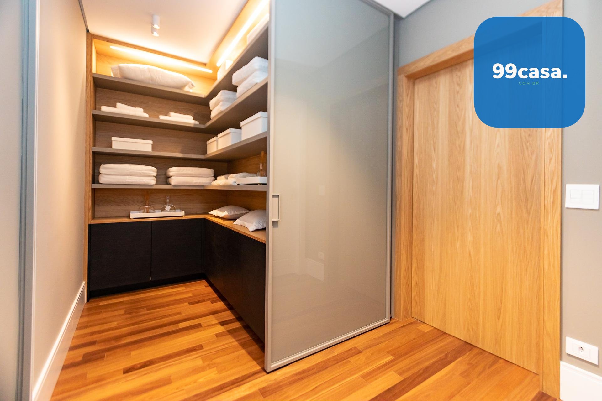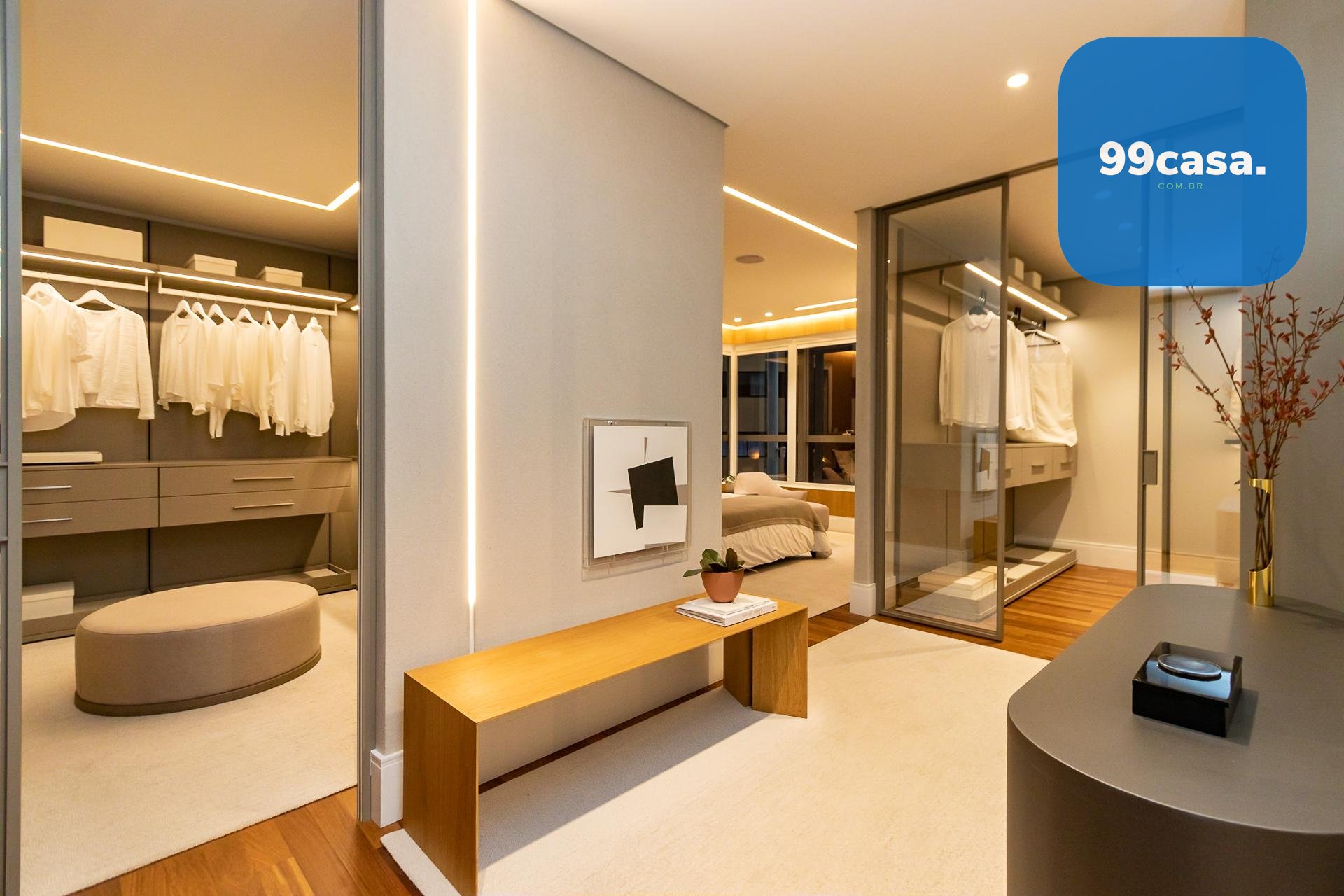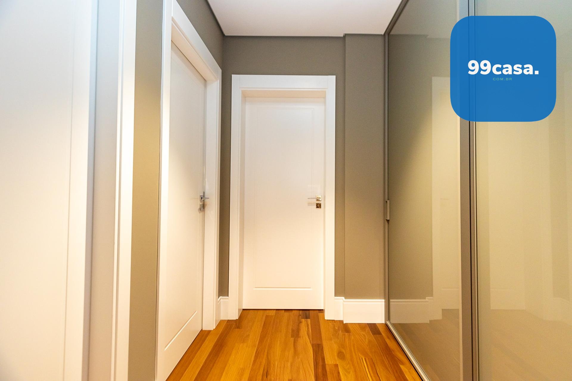 Piso em madeira natural estruturada na circulação e suítes