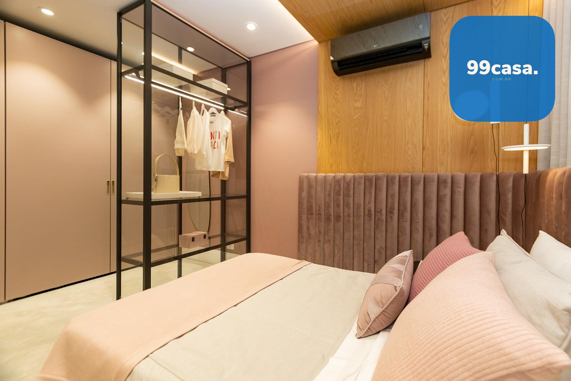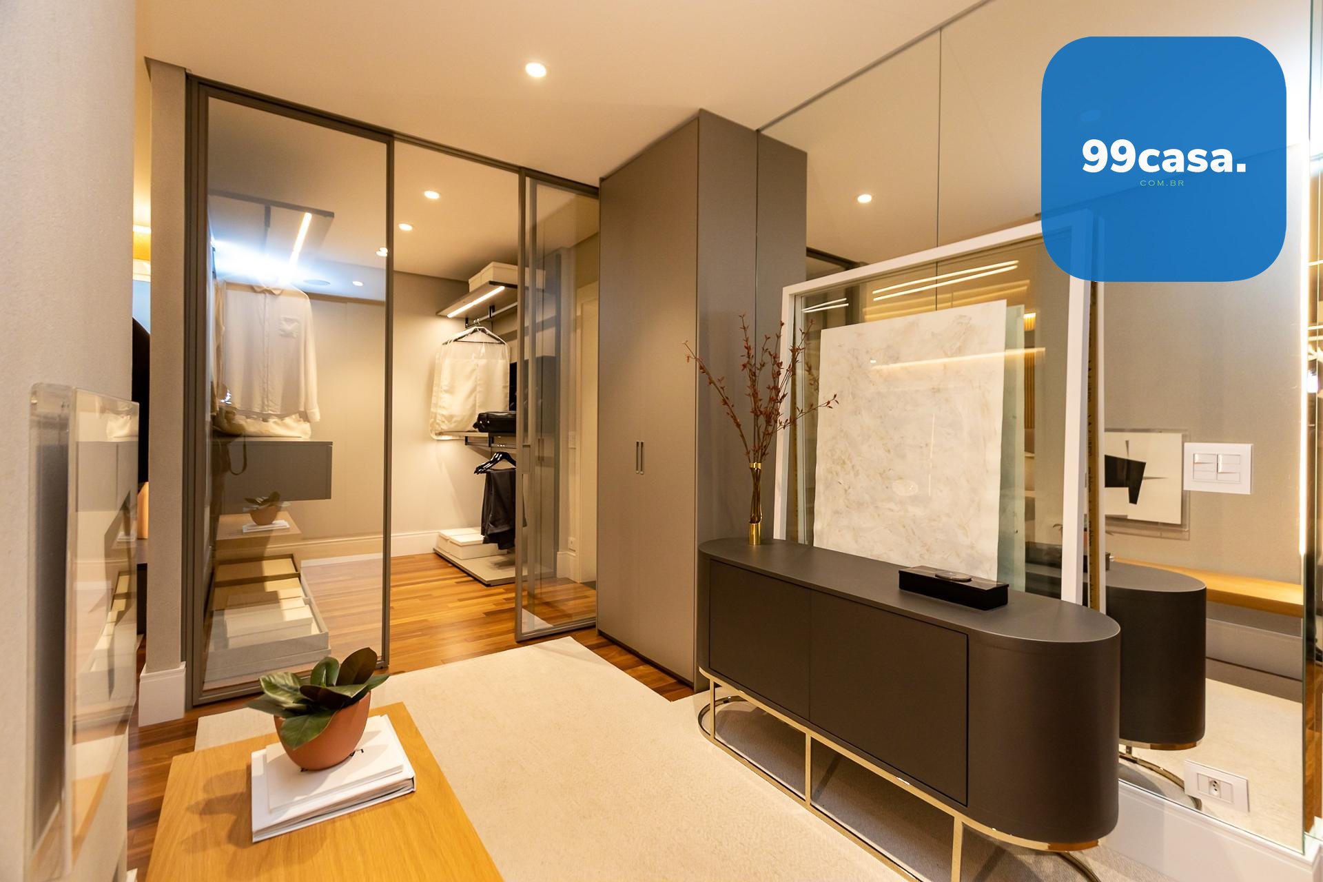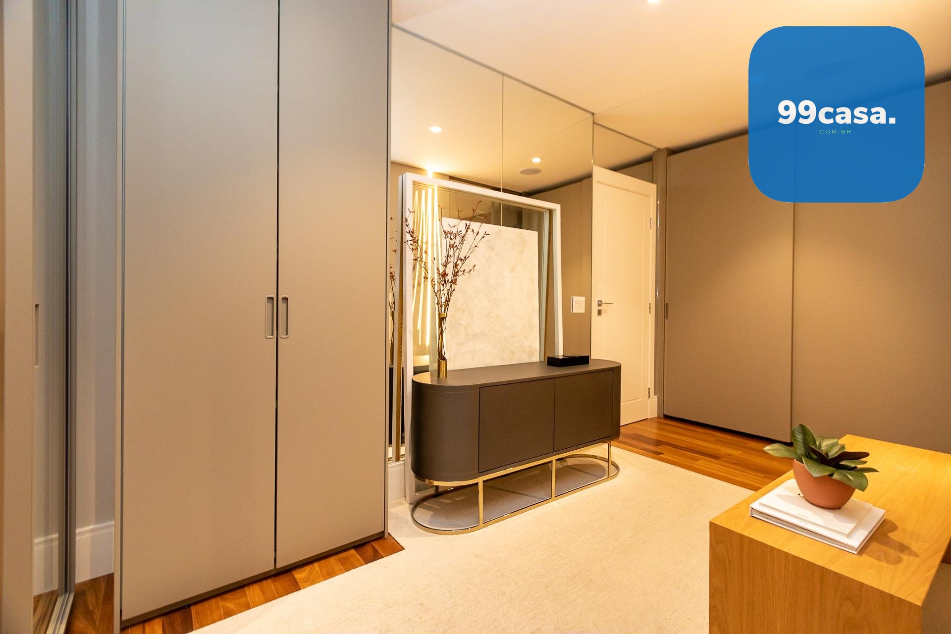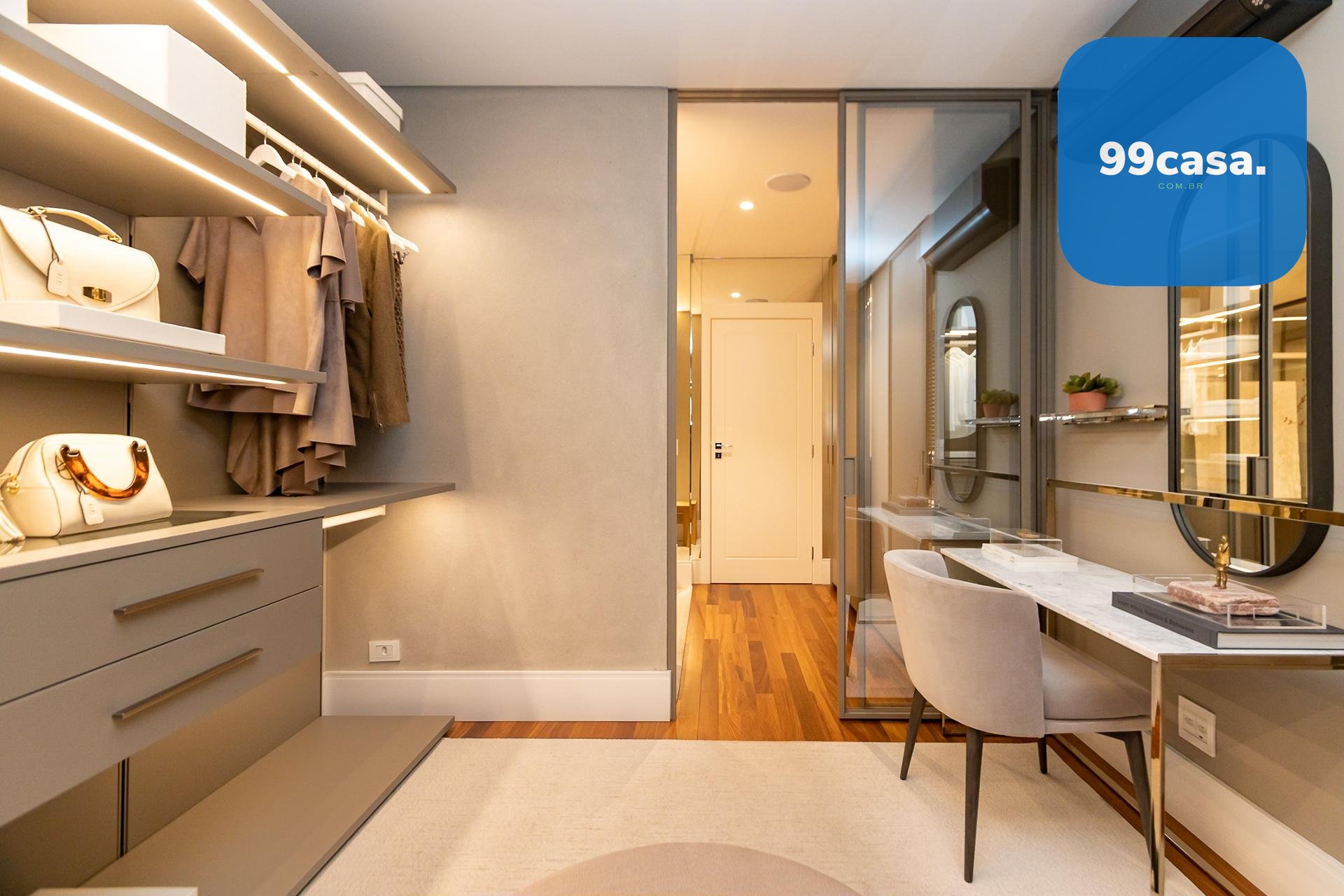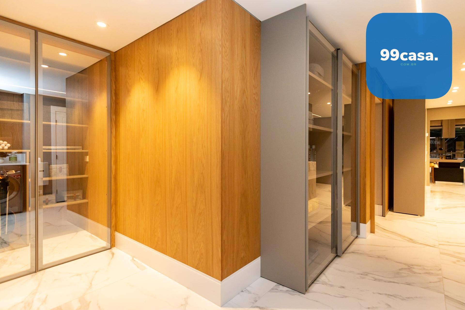 Piso em madeira natural estruturada na circulação e suítes