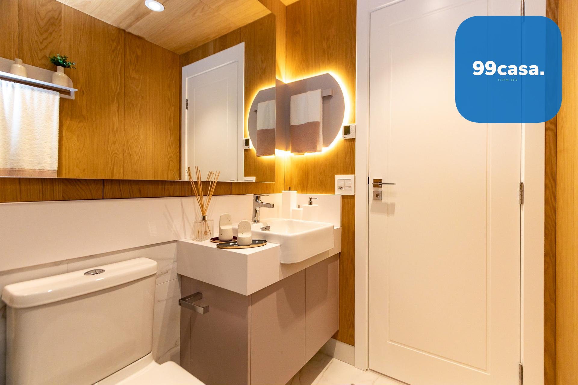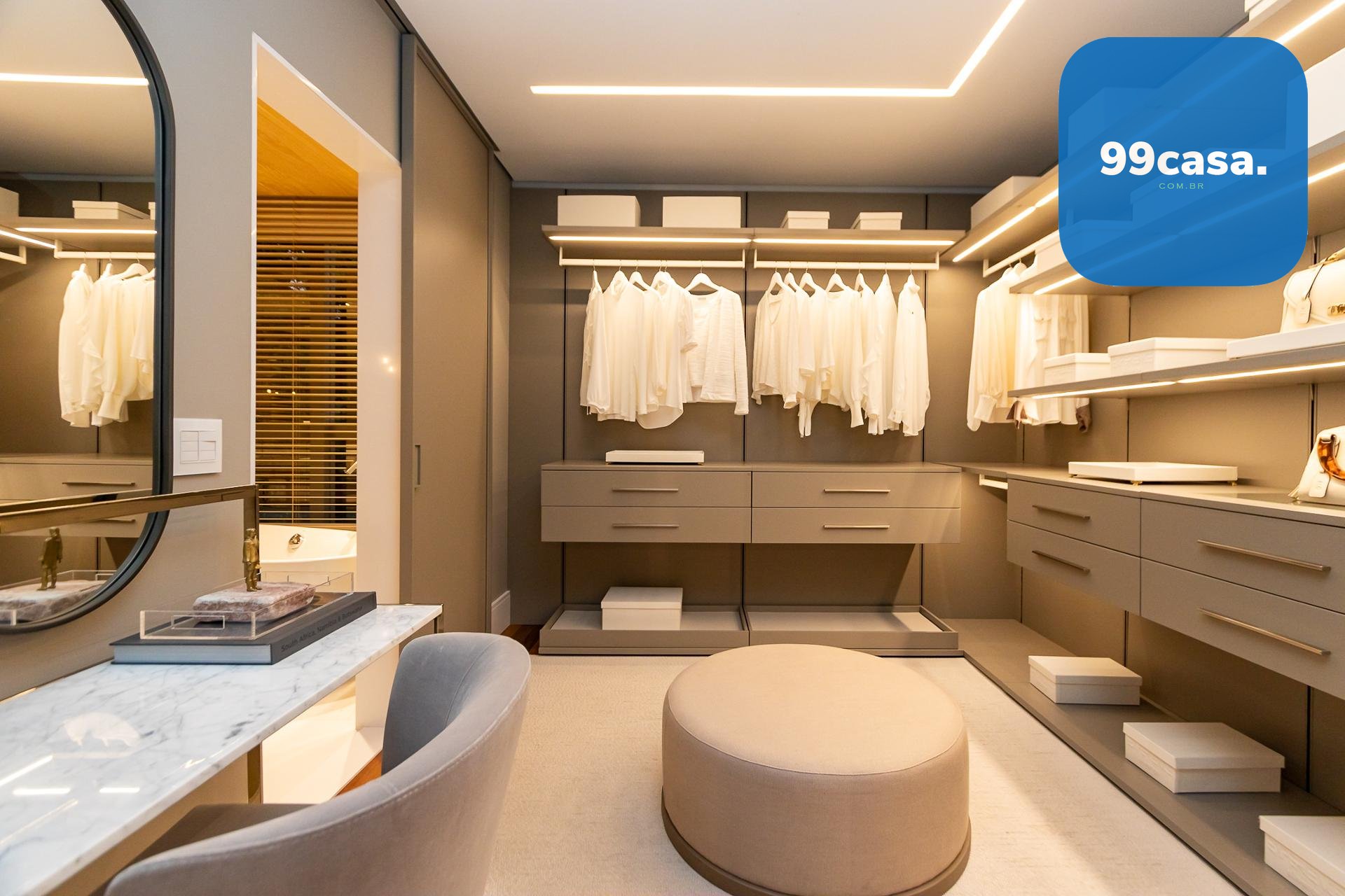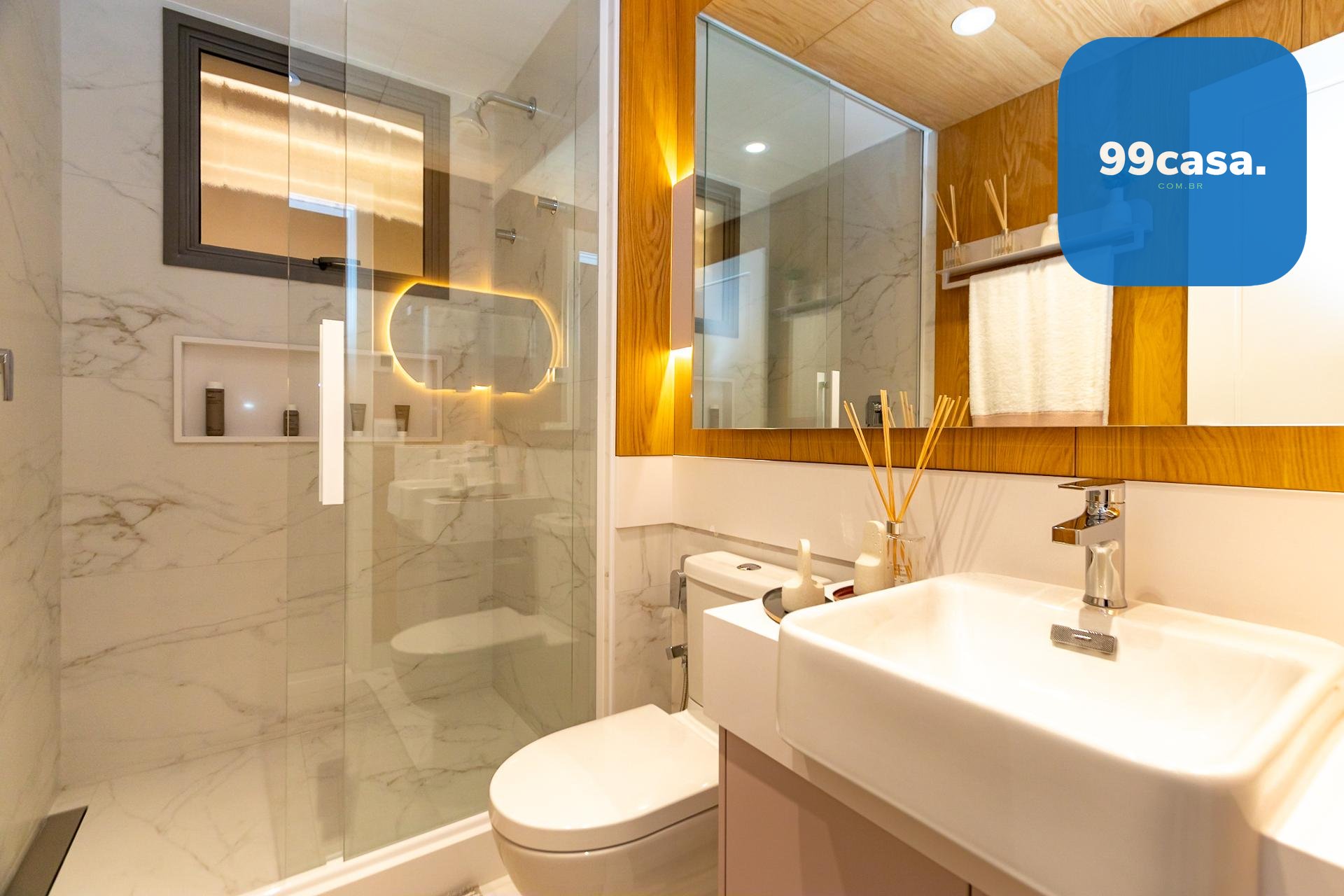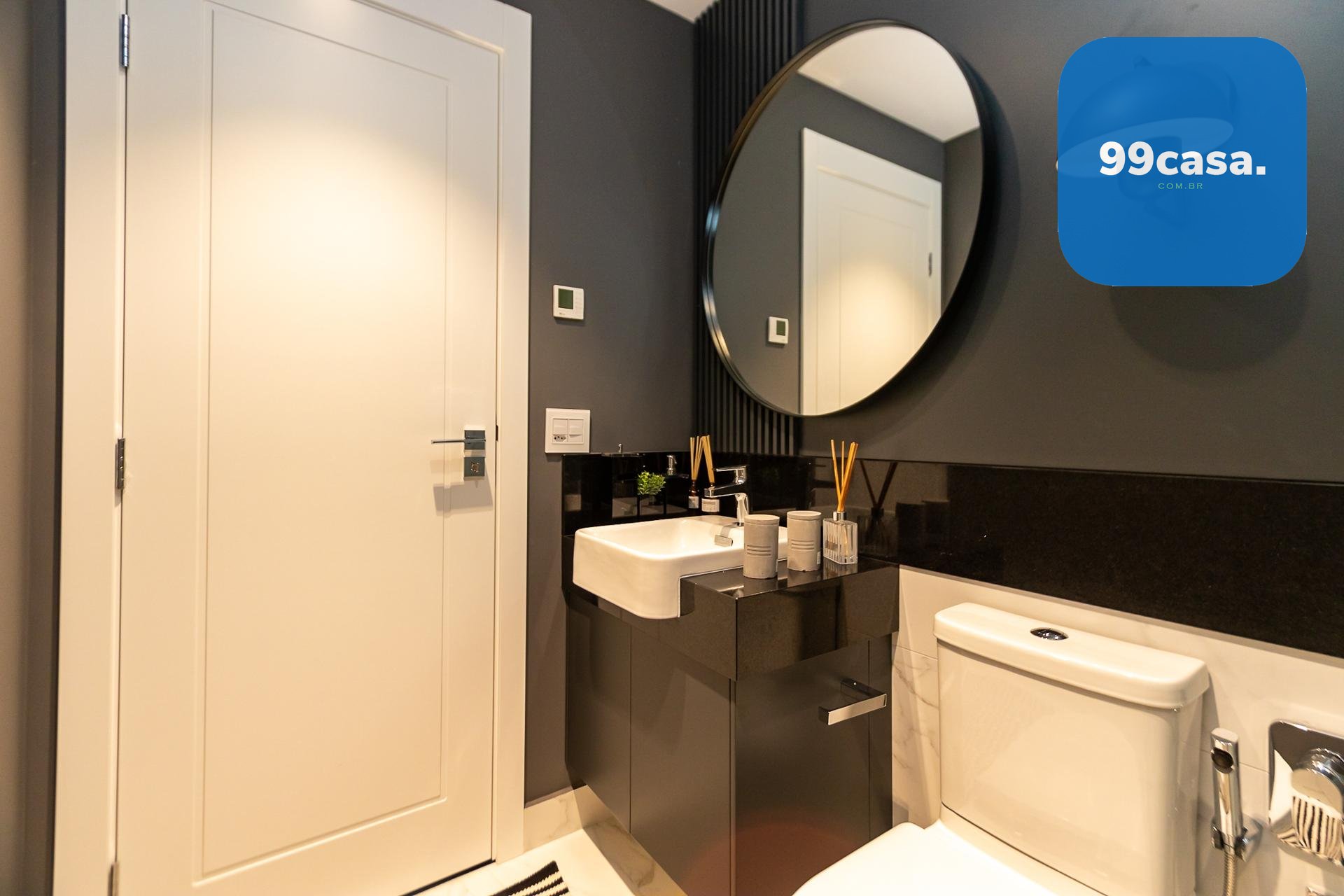 Bancada em quartzo branco ou granito no lavabo e banhos das suítes