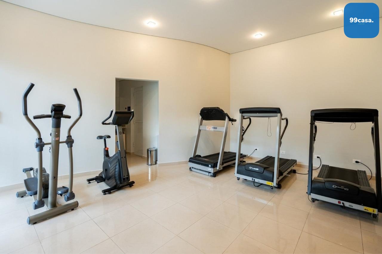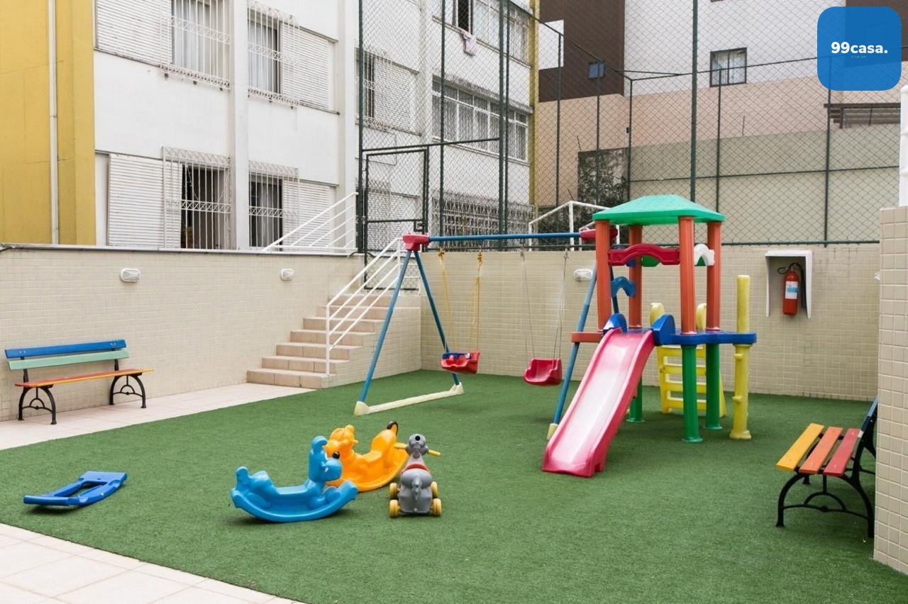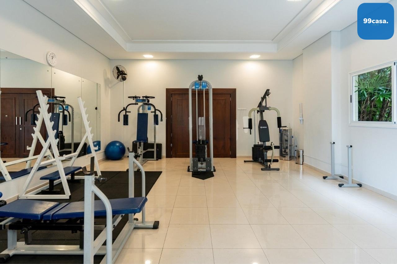 A infraestrutura do condomínio garante opções de lazer e segurança. O hall de entrada, com duas portas de vidro, dá acesso a áreas comuns que incluem piscina, sauna, espaço fitness, playground, quadra esportiva em gramado, salão de festas com churrasqueira, espaço gourmet com churrasqueira e salão de jogos. O condomínio oferece também caldeira, portaria e vigilância 24 horas com guarita e depósito de encomendas, além de elevador, jardim e interfone.