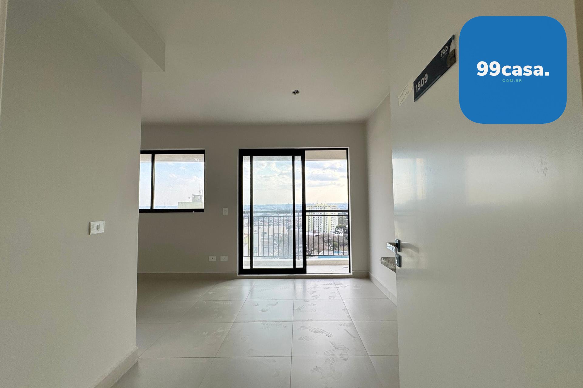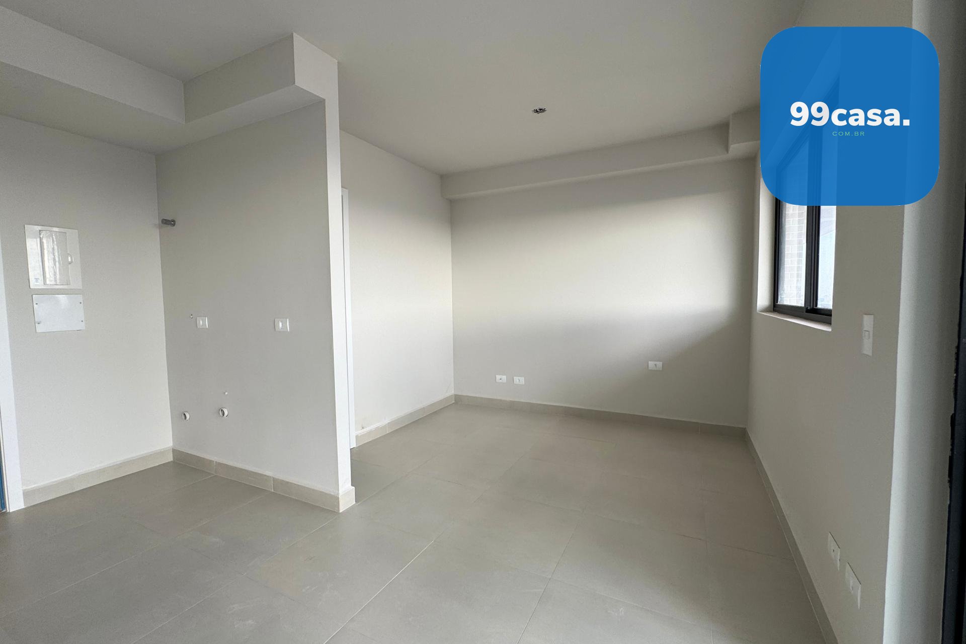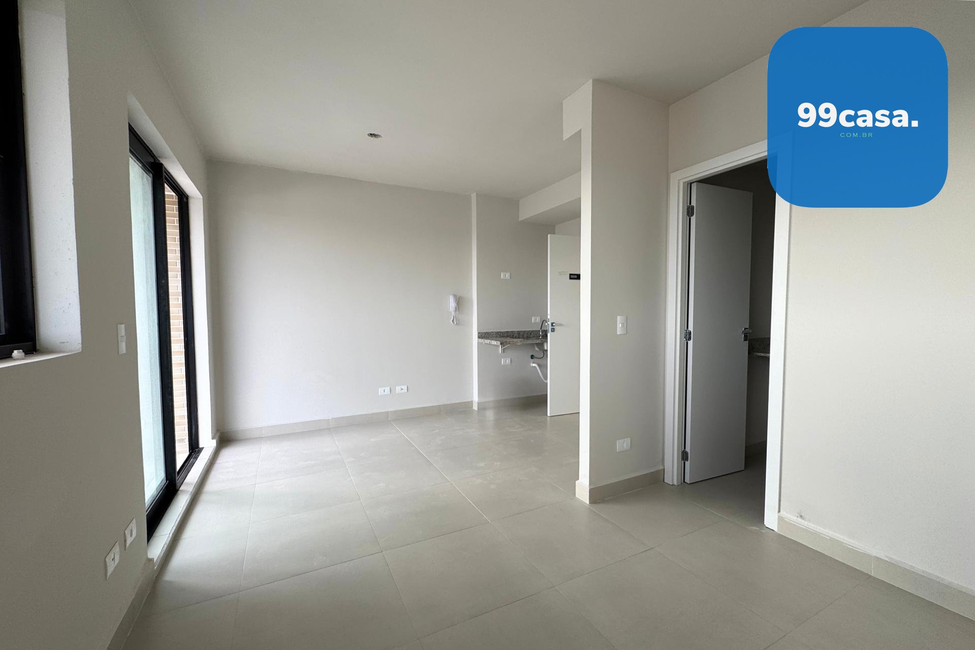 Apartamento do tipo Studio novo e pronto para morar no Edifício Plus Portão em Curitiba, com 28,69m² bem distribuídos entre sala, cozinha, quarto e banheiro.