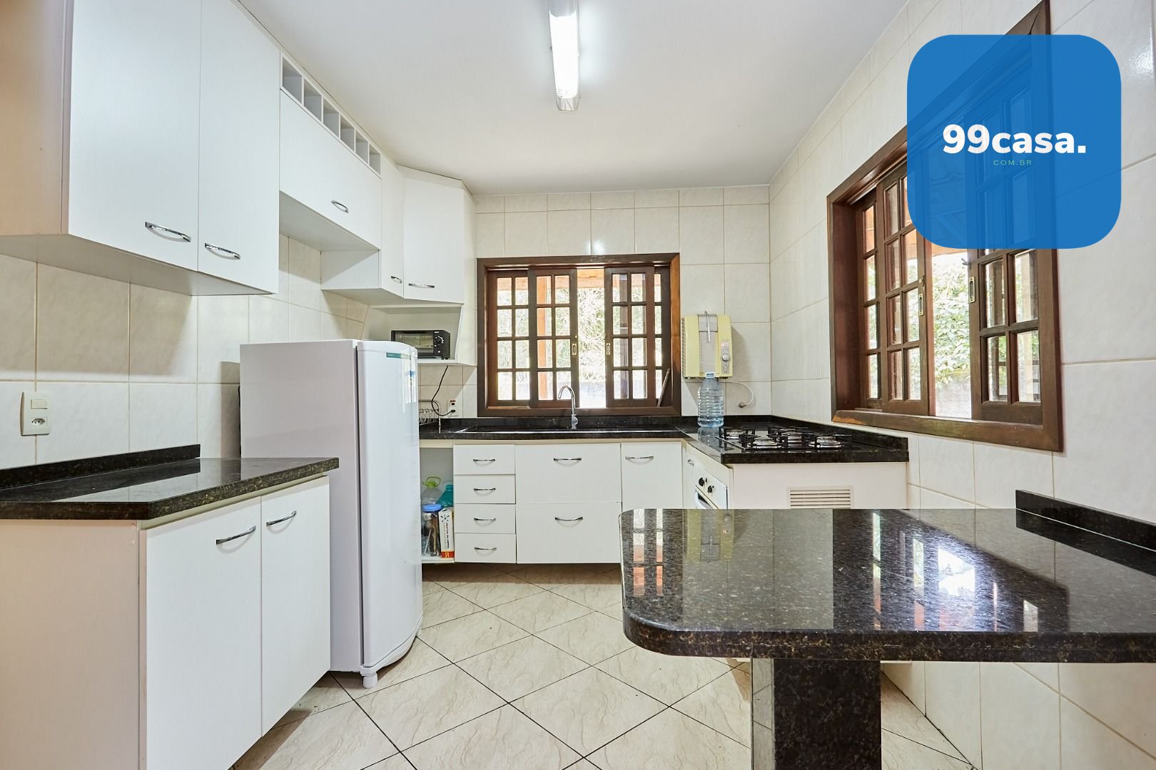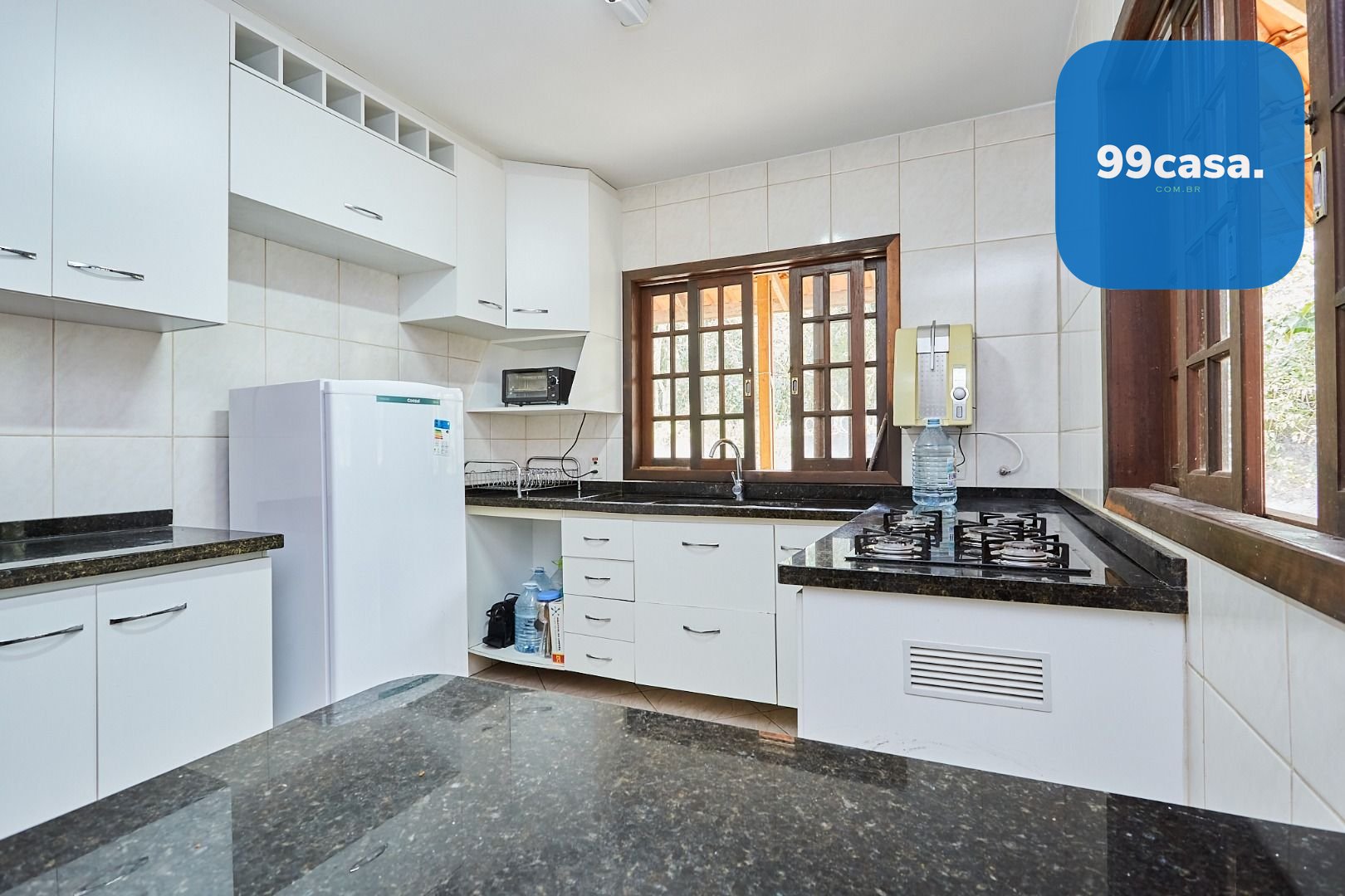 Cozinha ampla, ventilada, com armários embutidos.