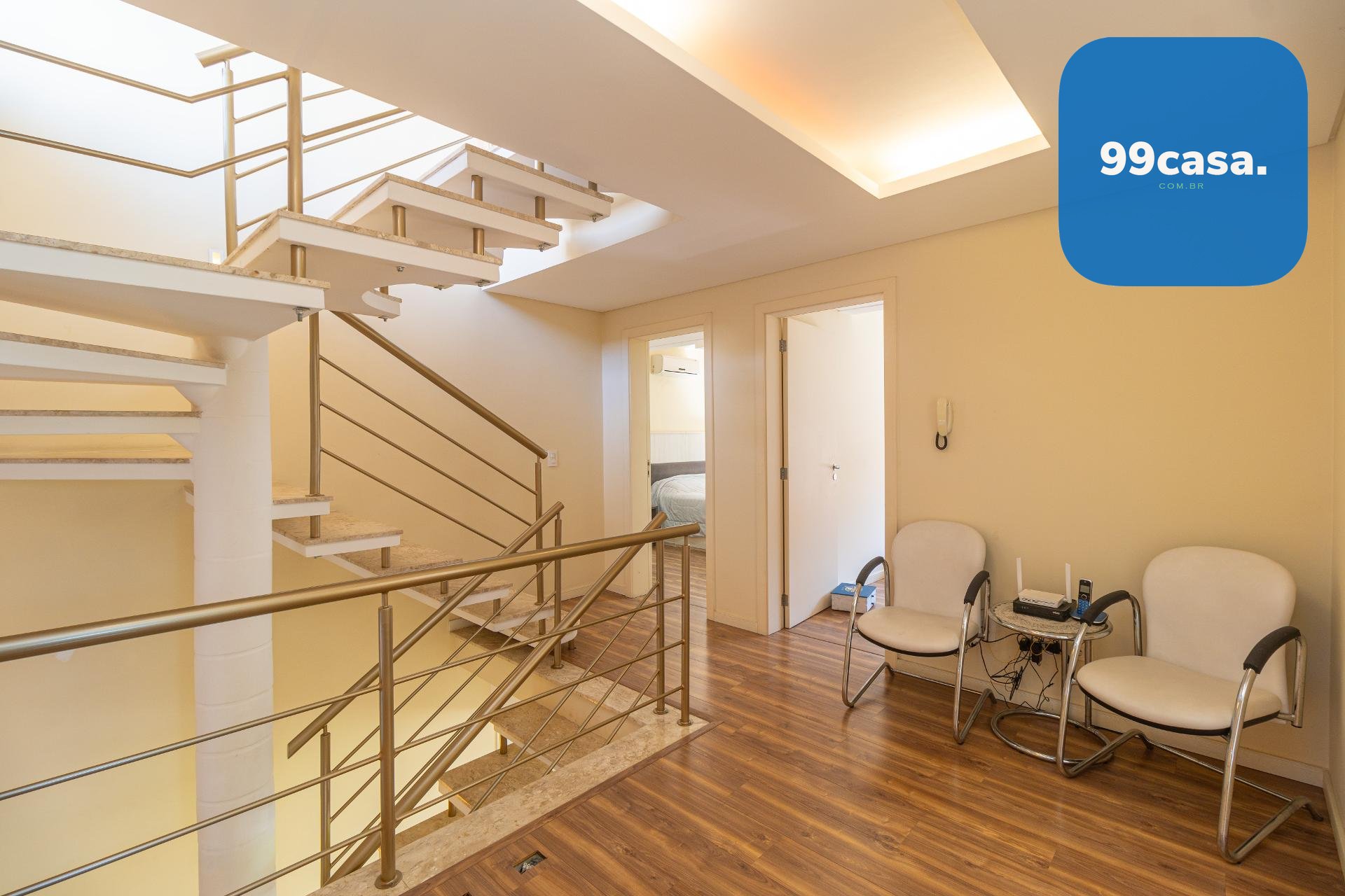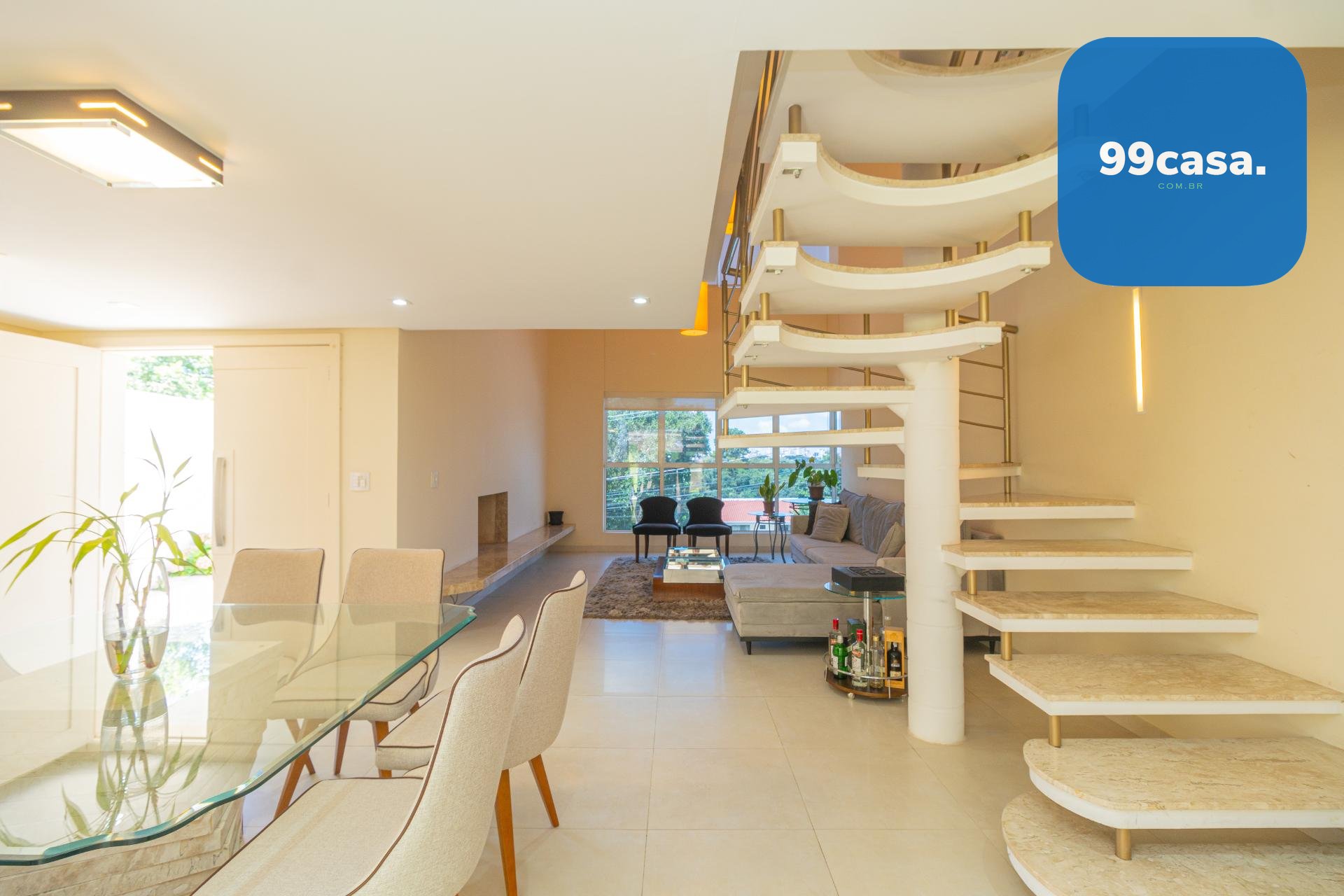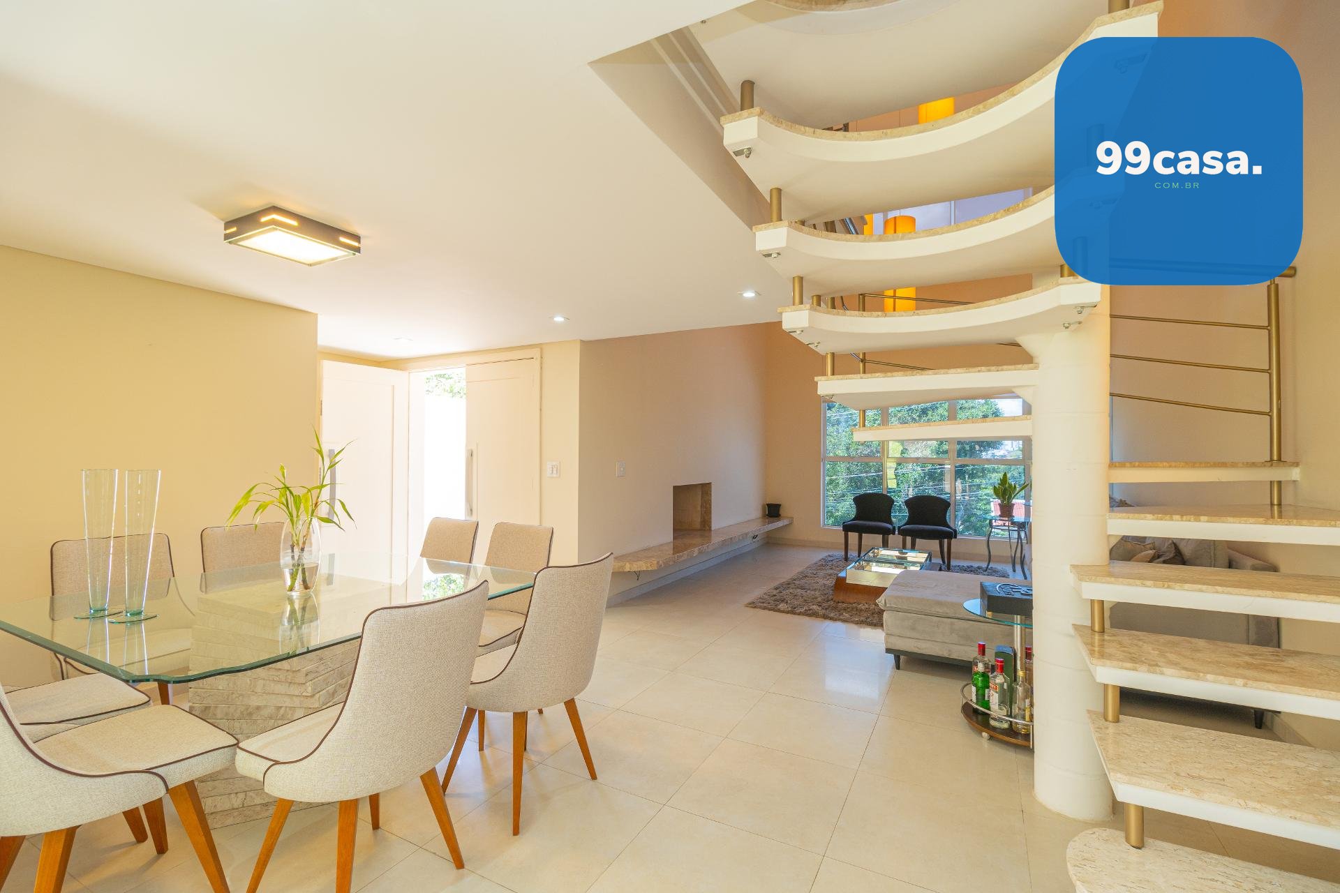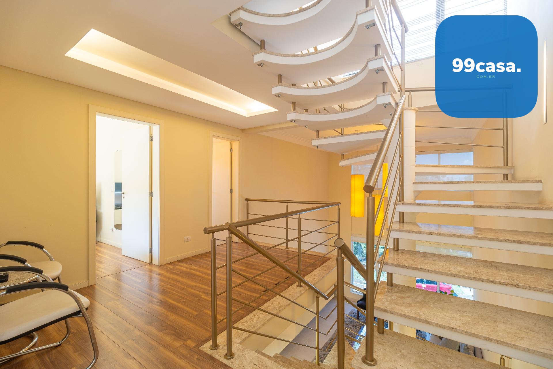 À esquerda, uma escada elegante e bem desenhada conduz aos pavimentos superiores, valorizando o projeto arquitetônico e criando um impacto visual sofisticado logo na entrada.