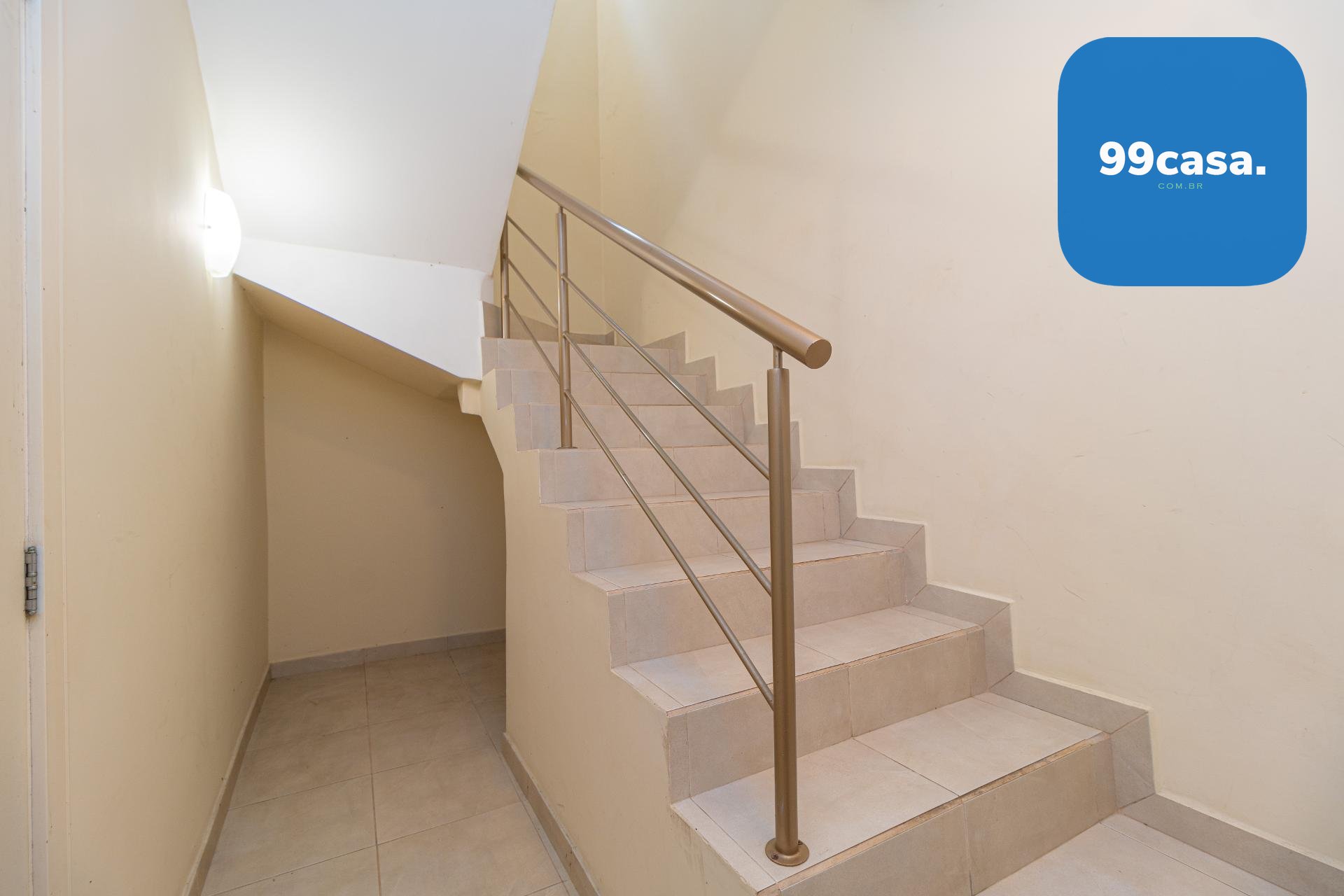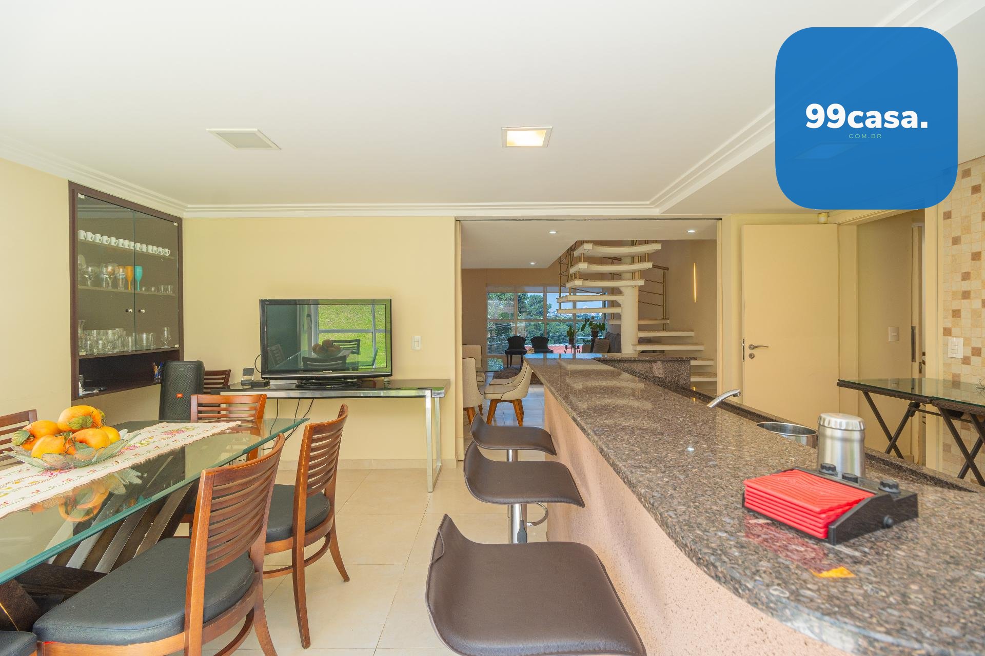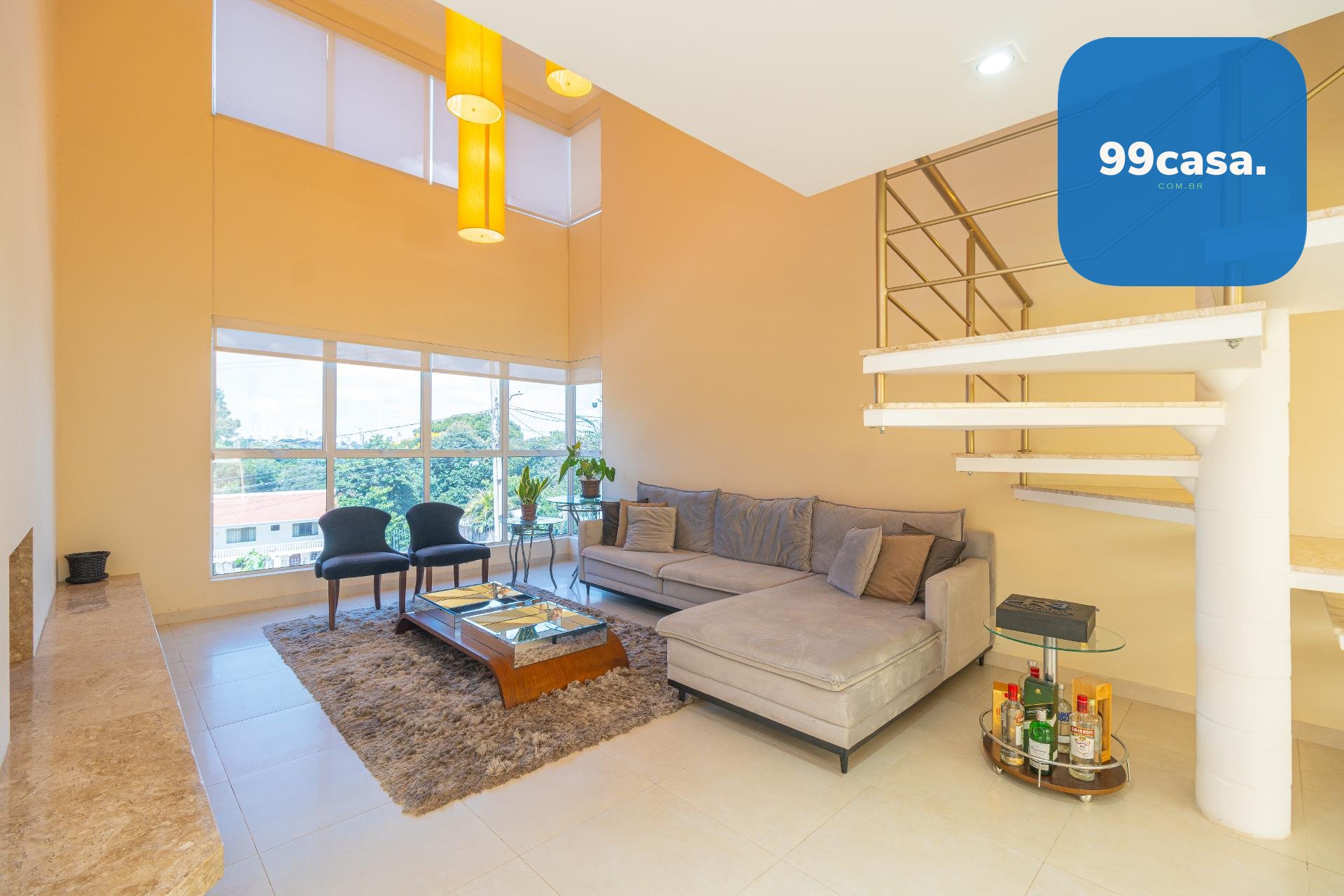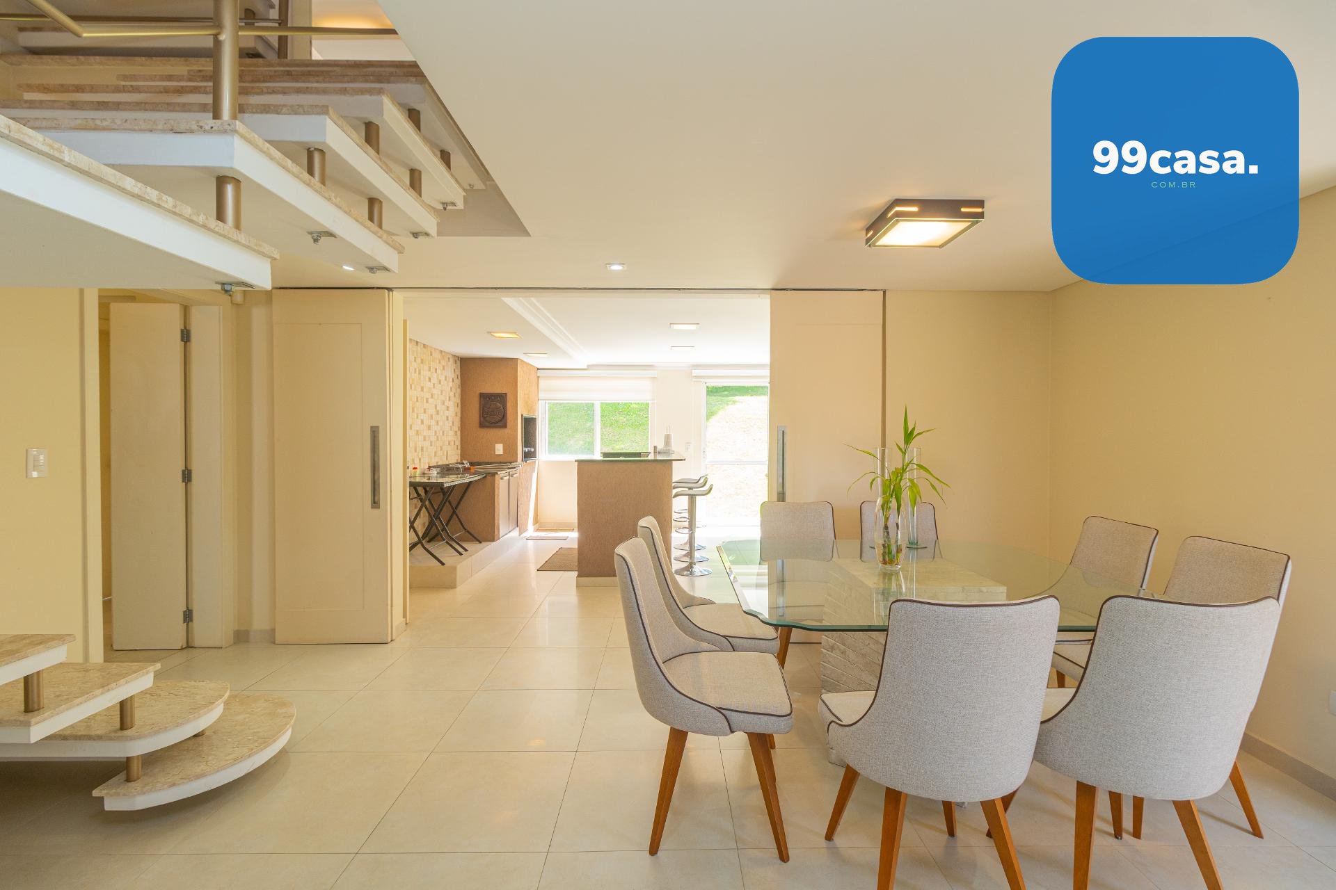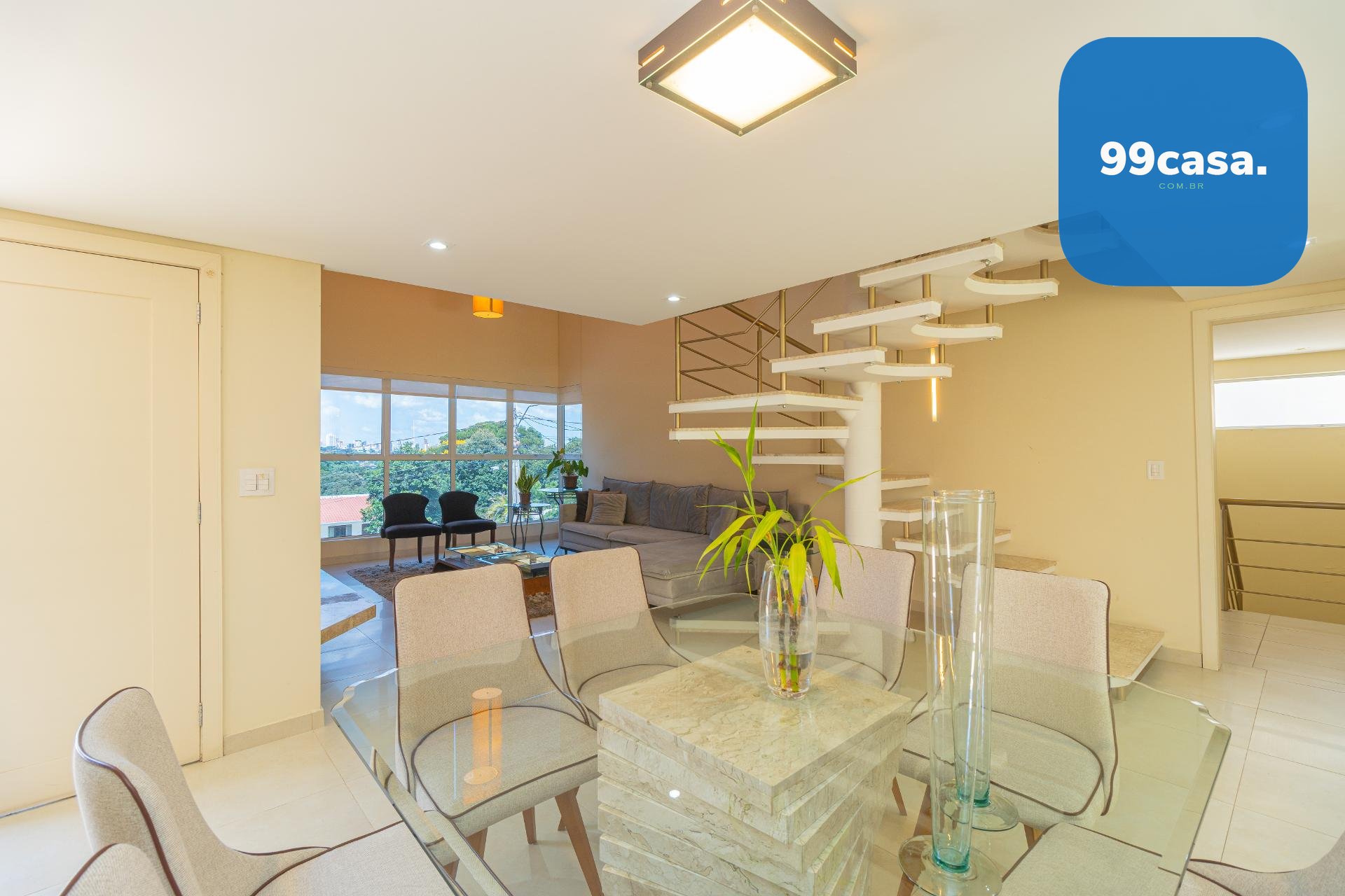 À esquerda, uma escada elegante e bem desenhada conduz aos pavimentos superiores, valorizando o projeto arquitetônico e criando um impacto visual sofisticado logo na entrada.