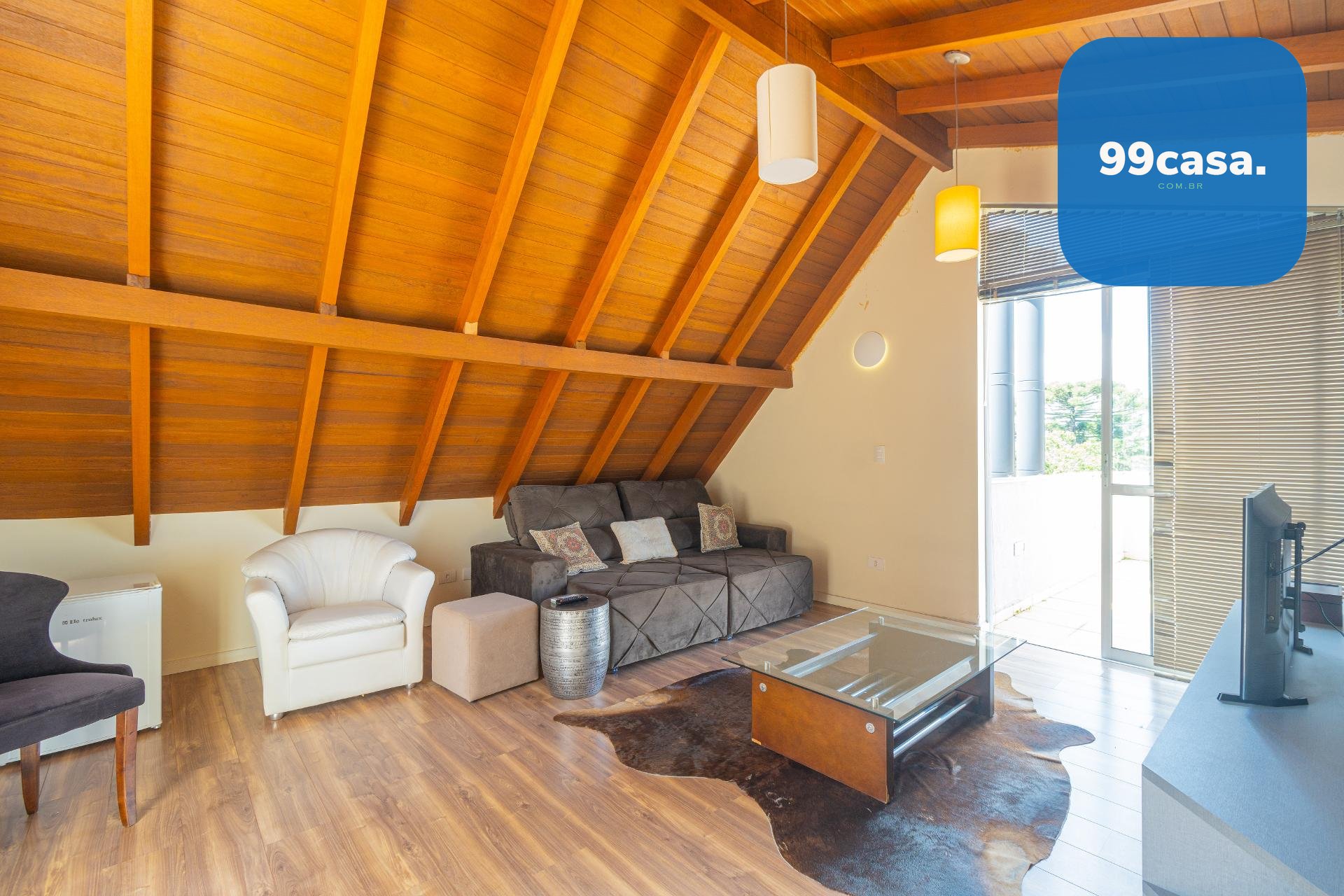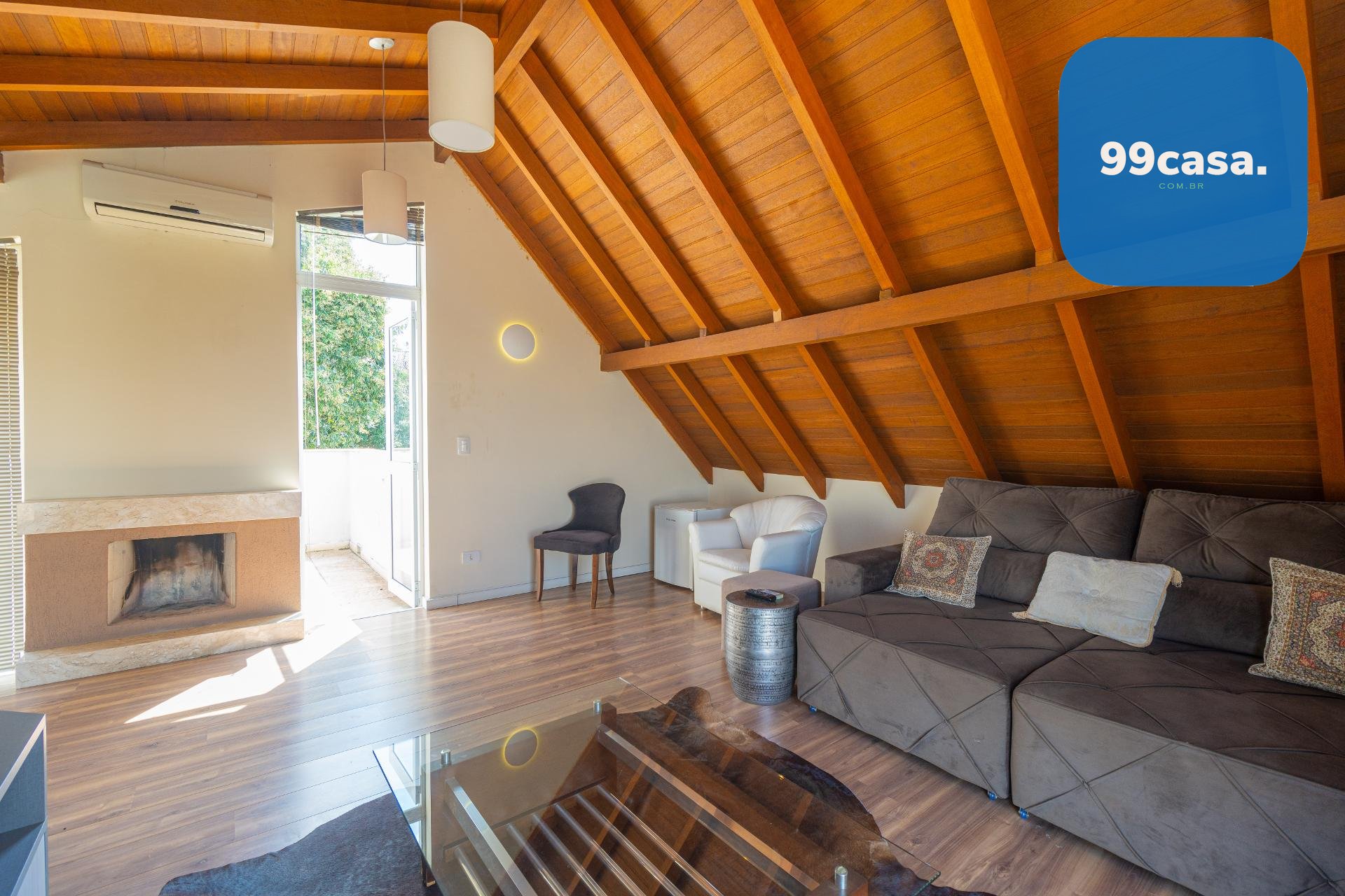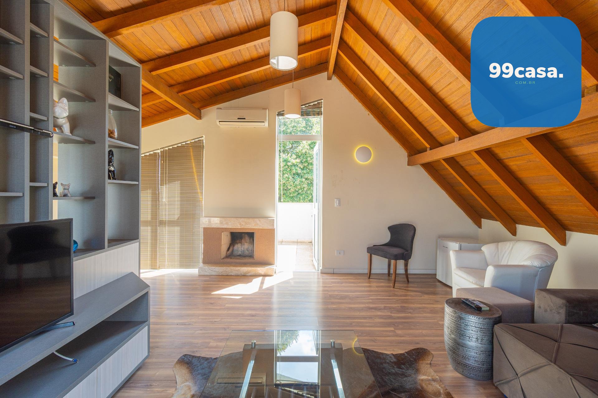 O ático é amplo, climatizado, possui lareira e sacada com linda vista. Um espaço extremamente versátil que pode ser utilizado como: