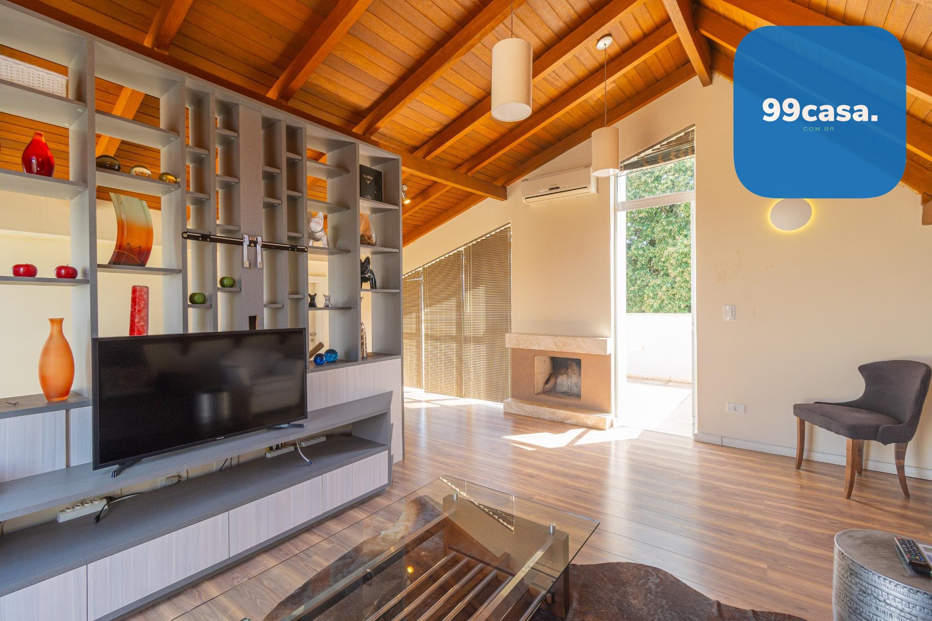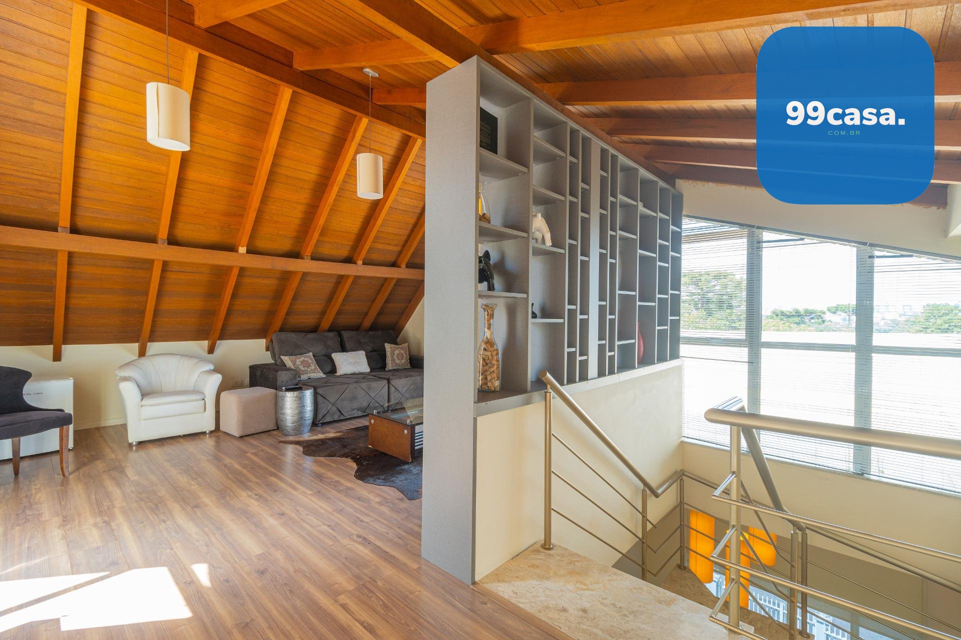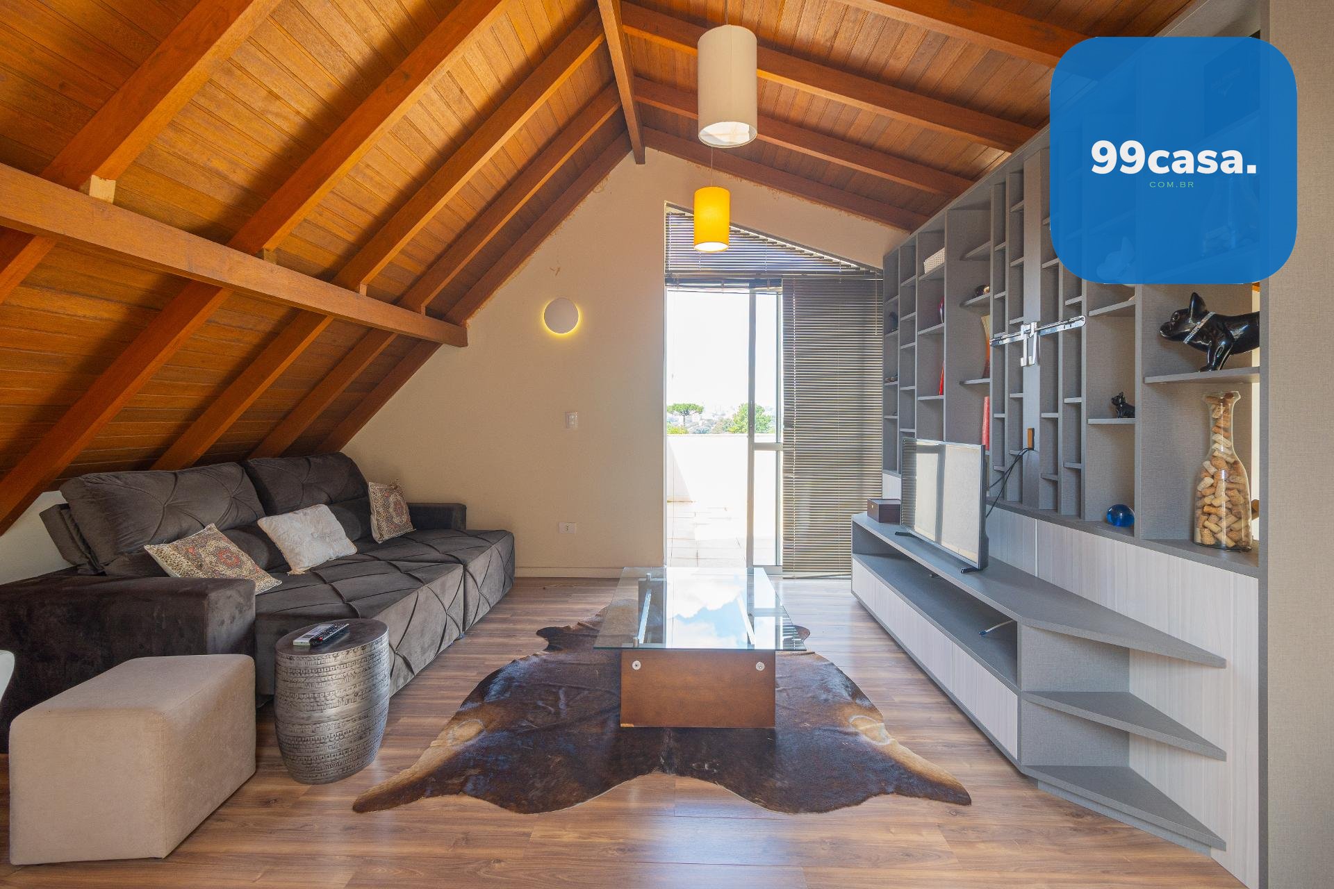 O ático é amplo, climatizado, possui lareira e sacada com linda vista. Um espaço extremamente versátil que pode ser utilizado como: