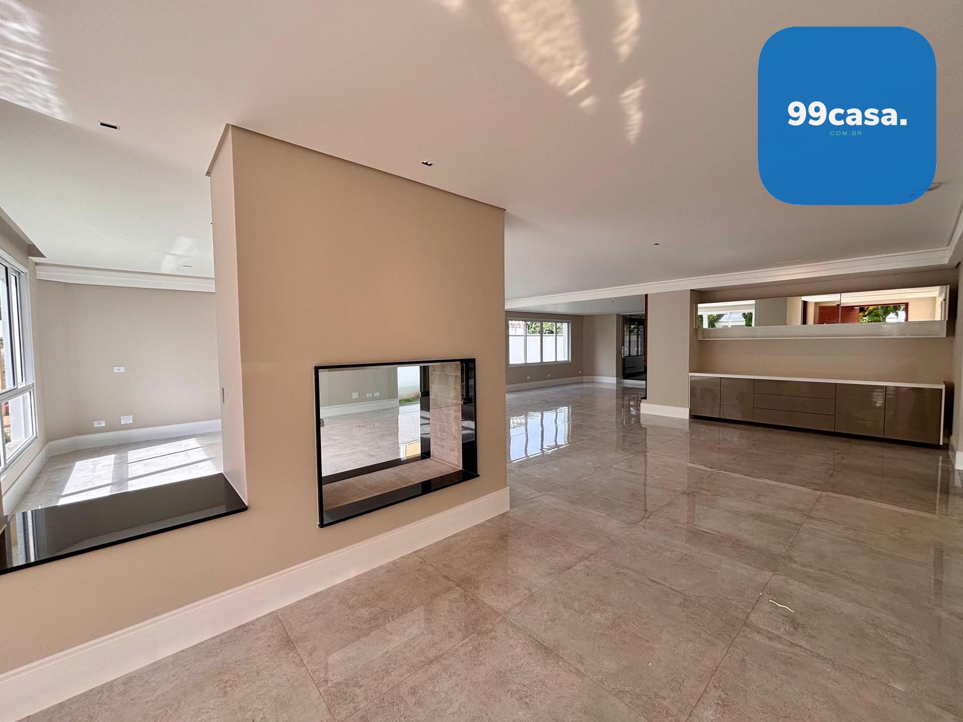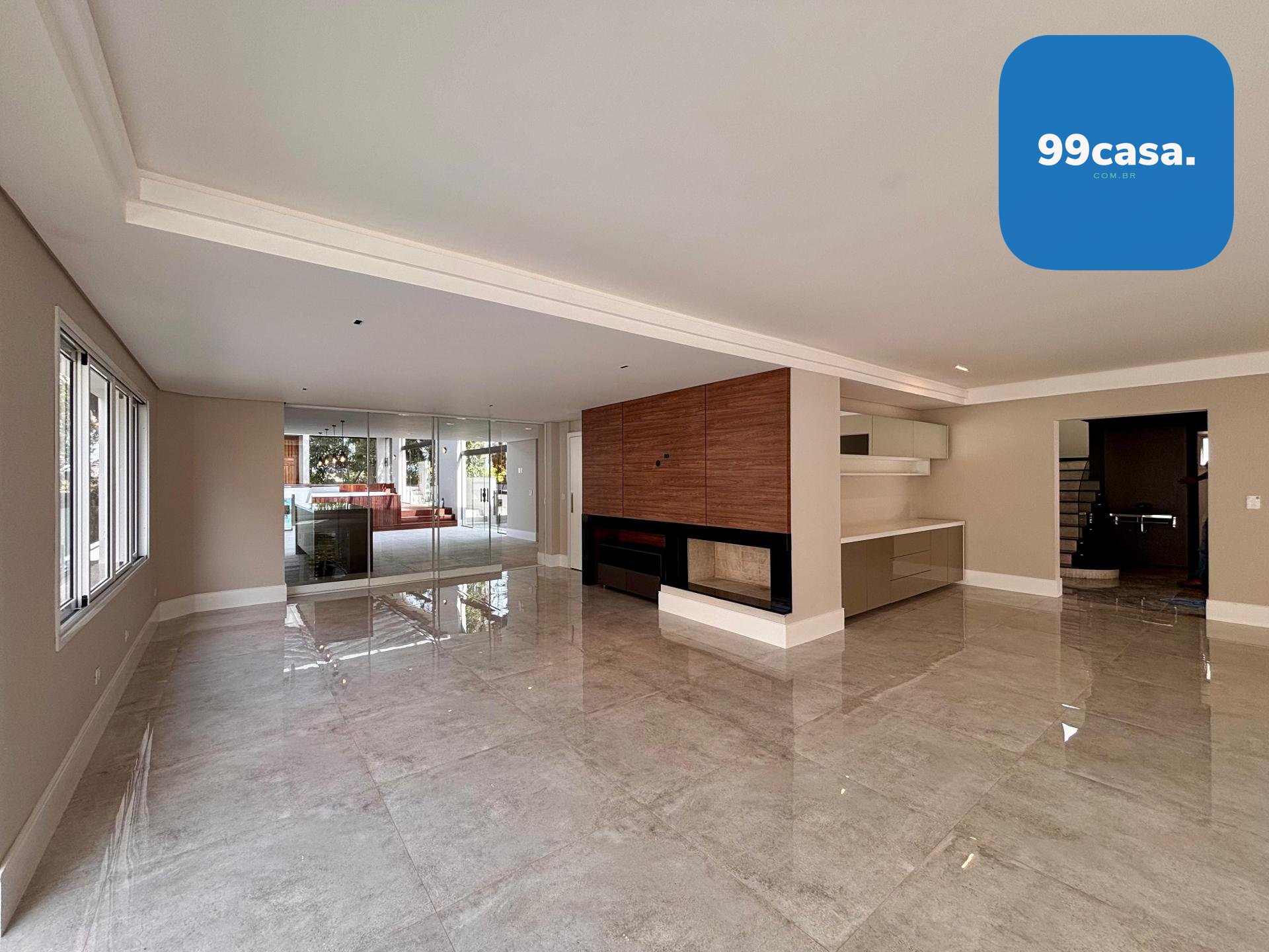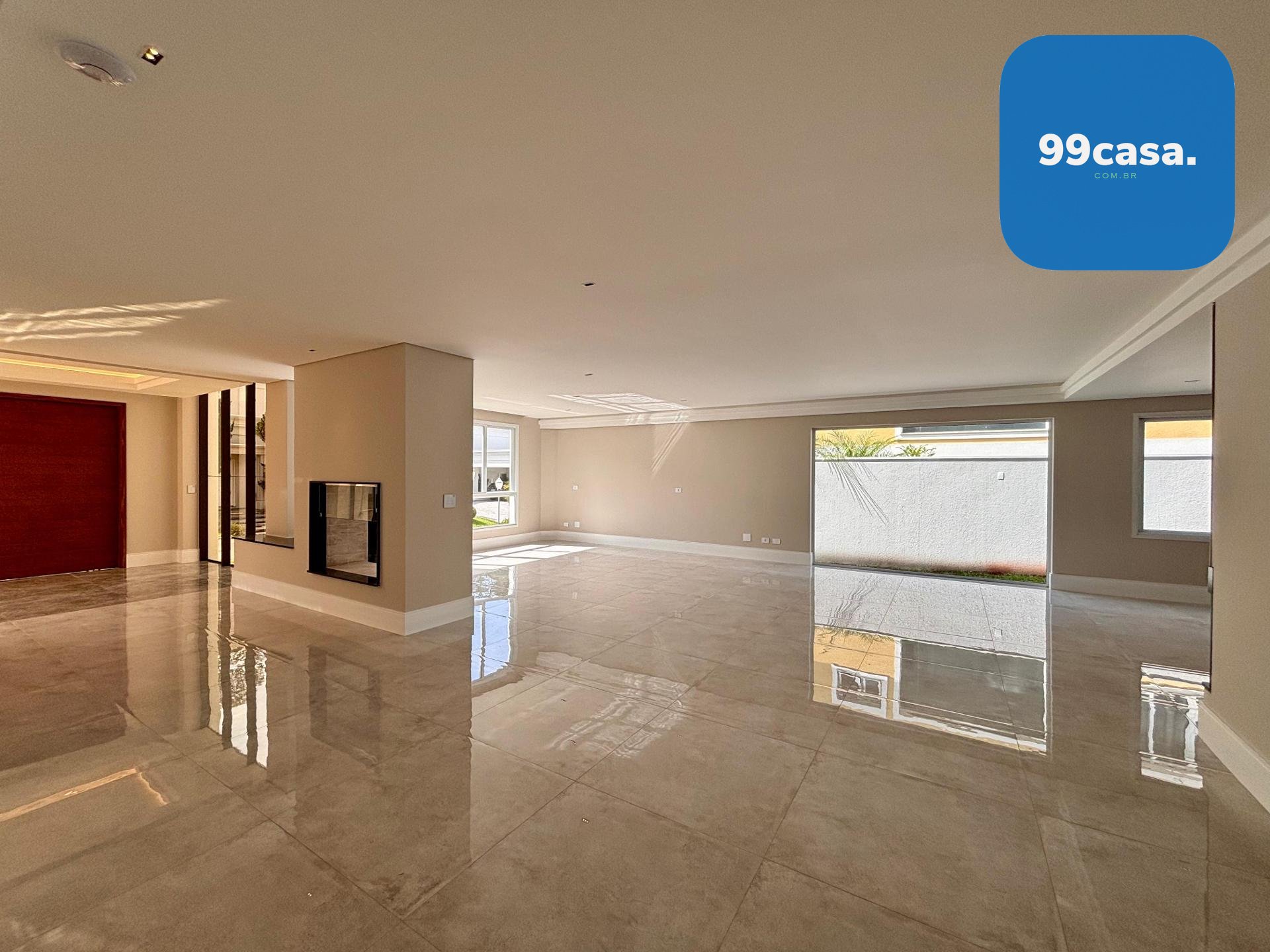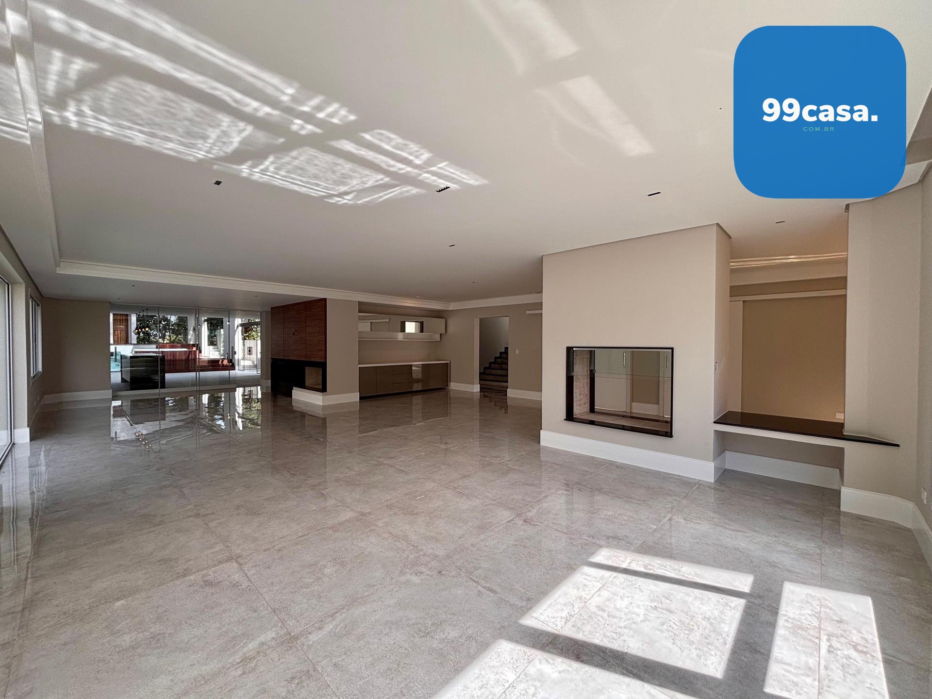 Sala ampla integrada, com lareira, piso em porcelanato e iluminação natural abundante