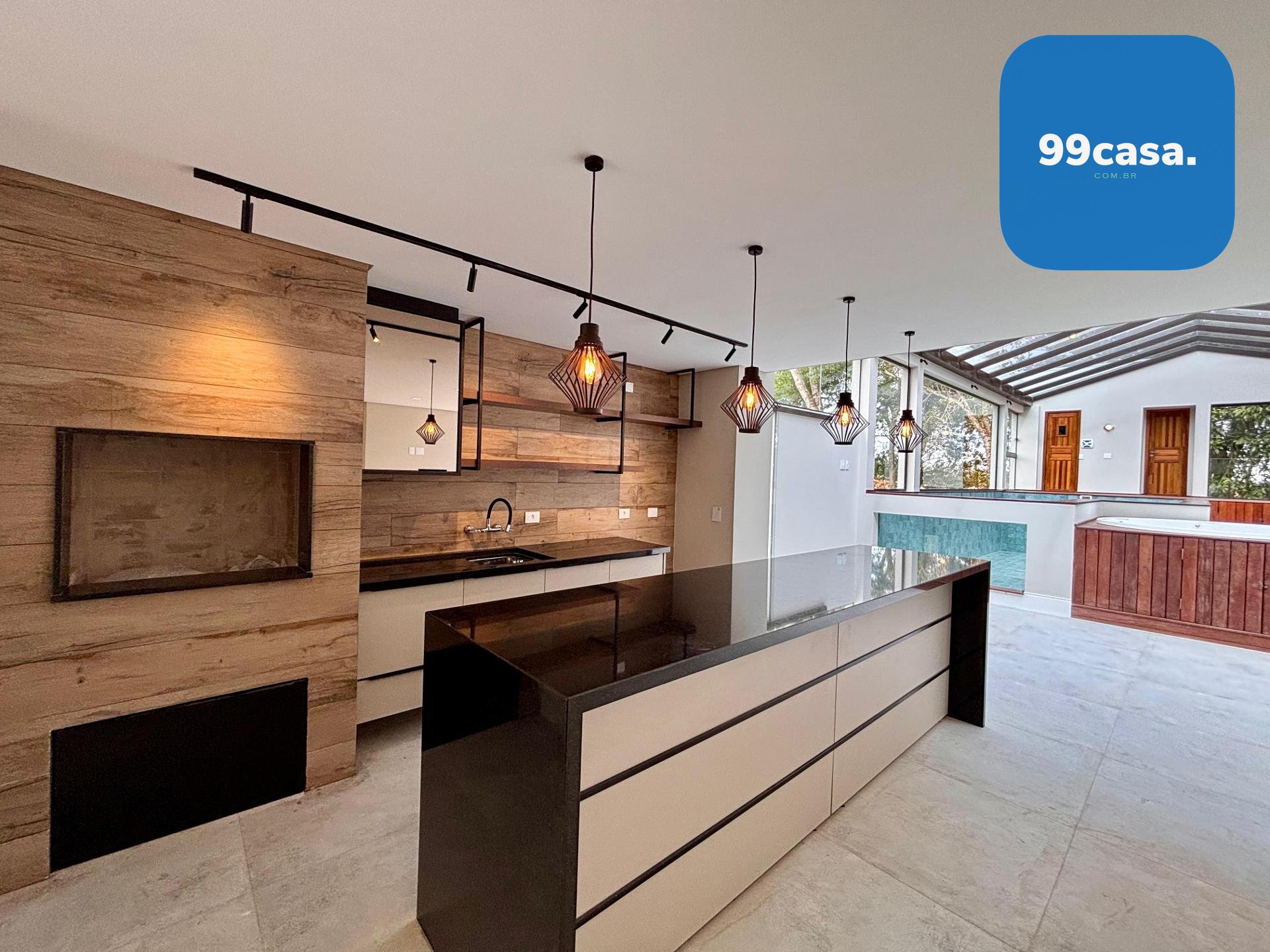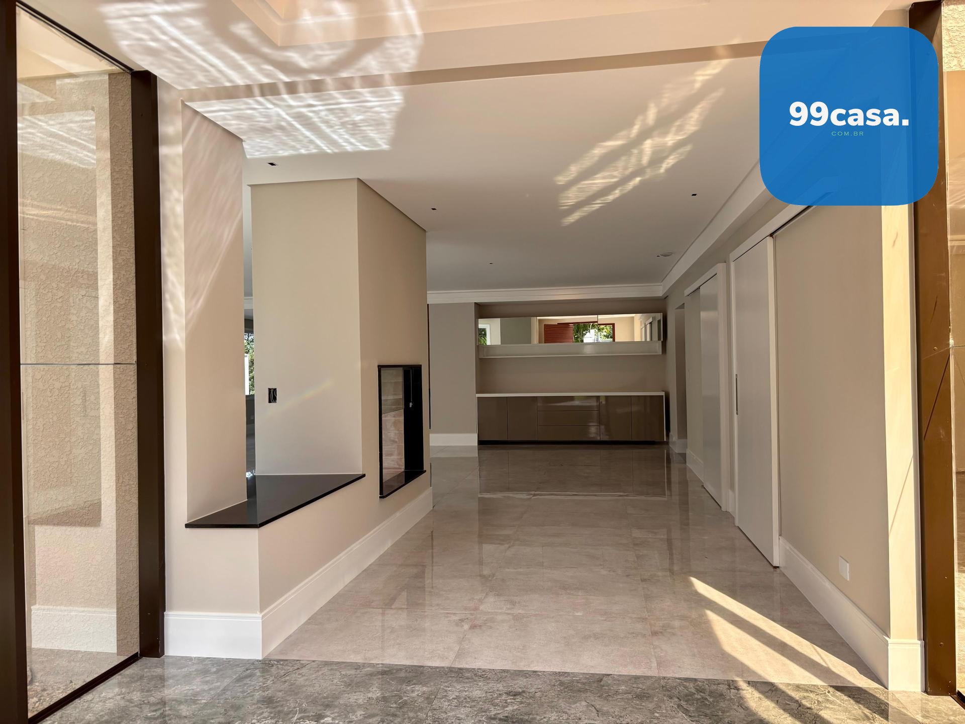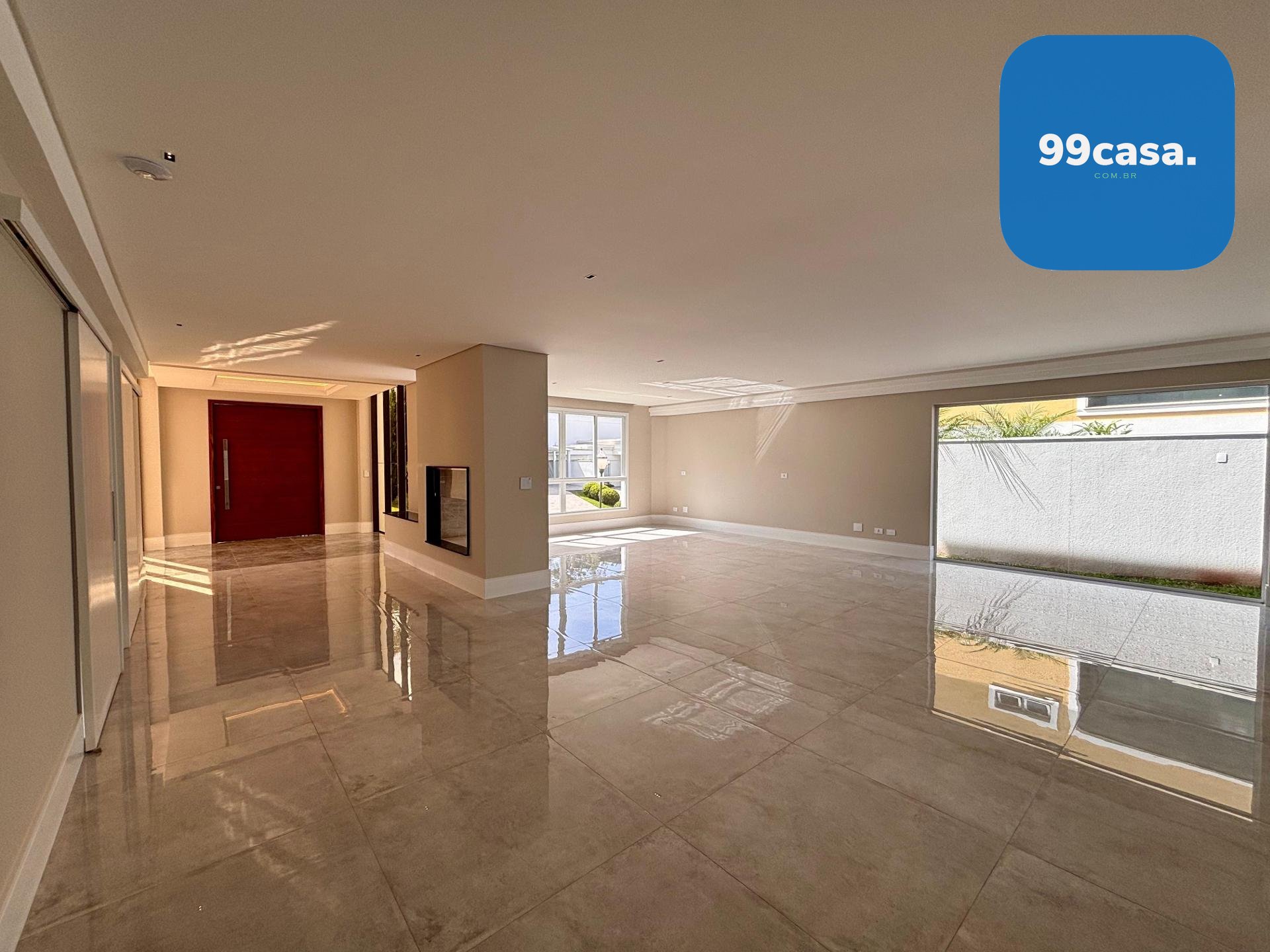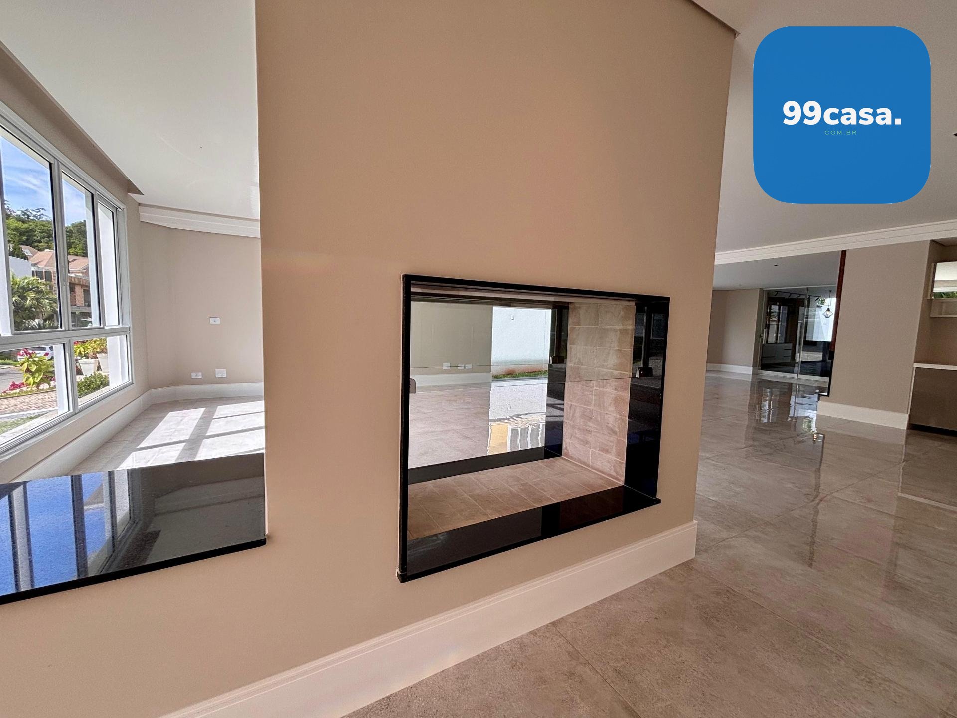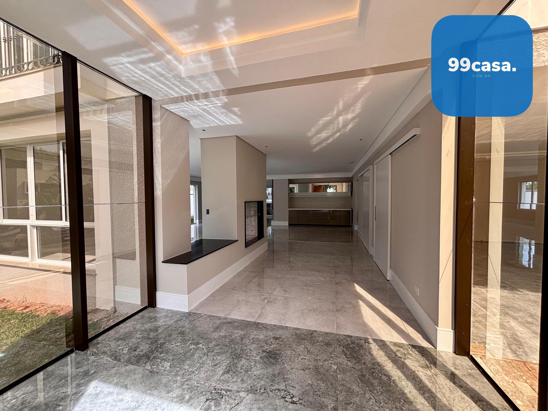 Sala ampla integrada, com lareira, piso em porcelanato e iluminação natural abundante