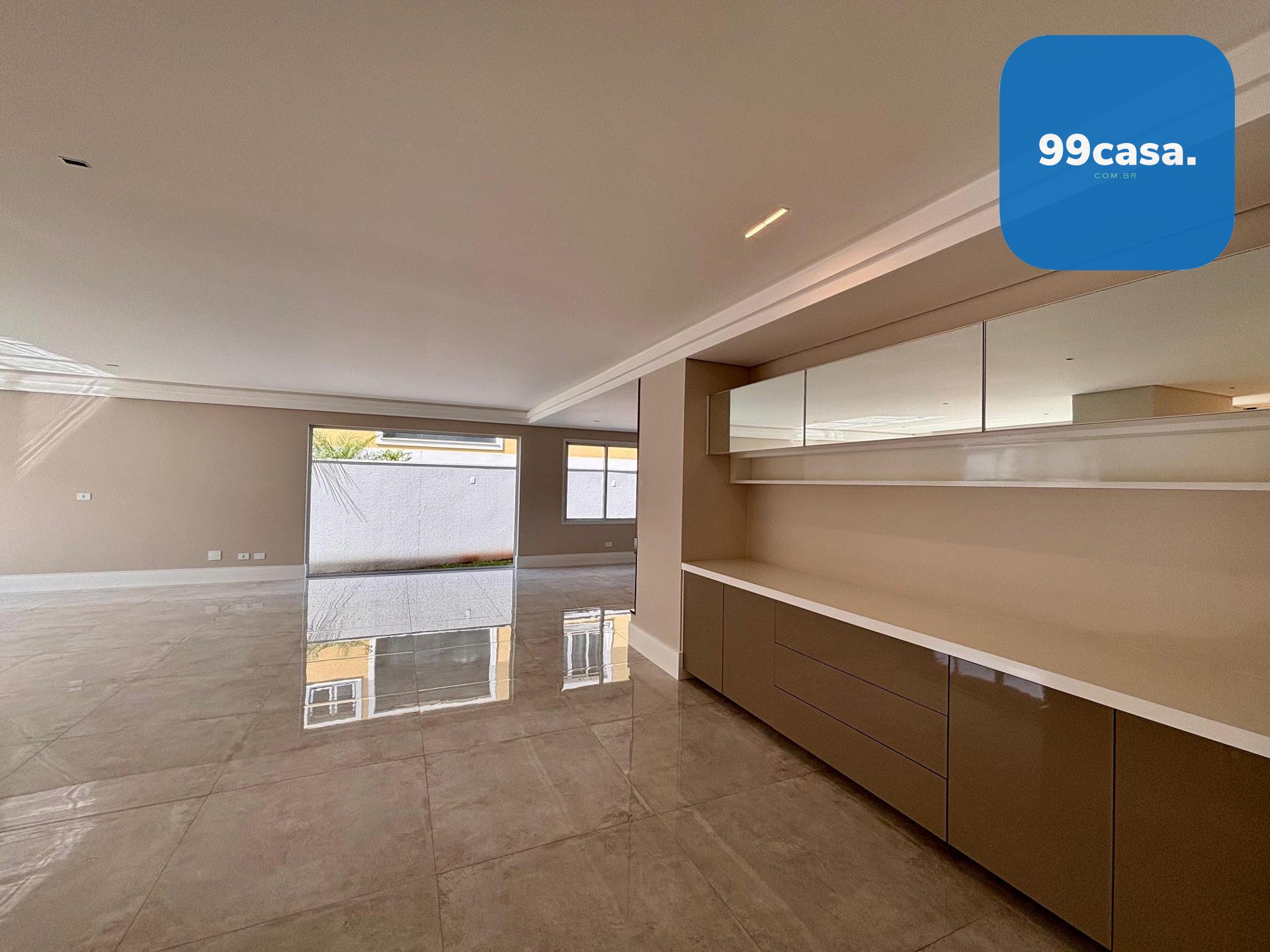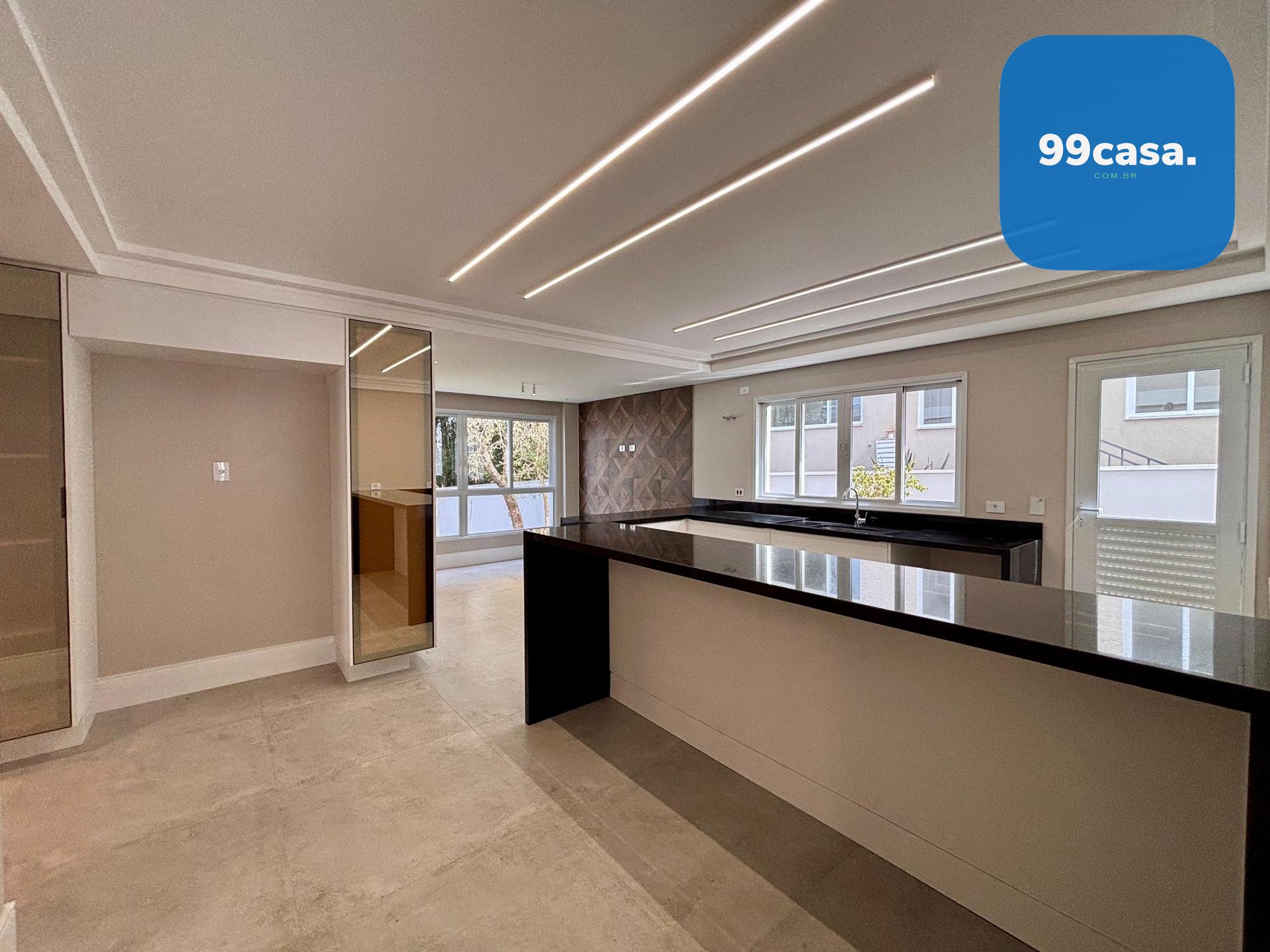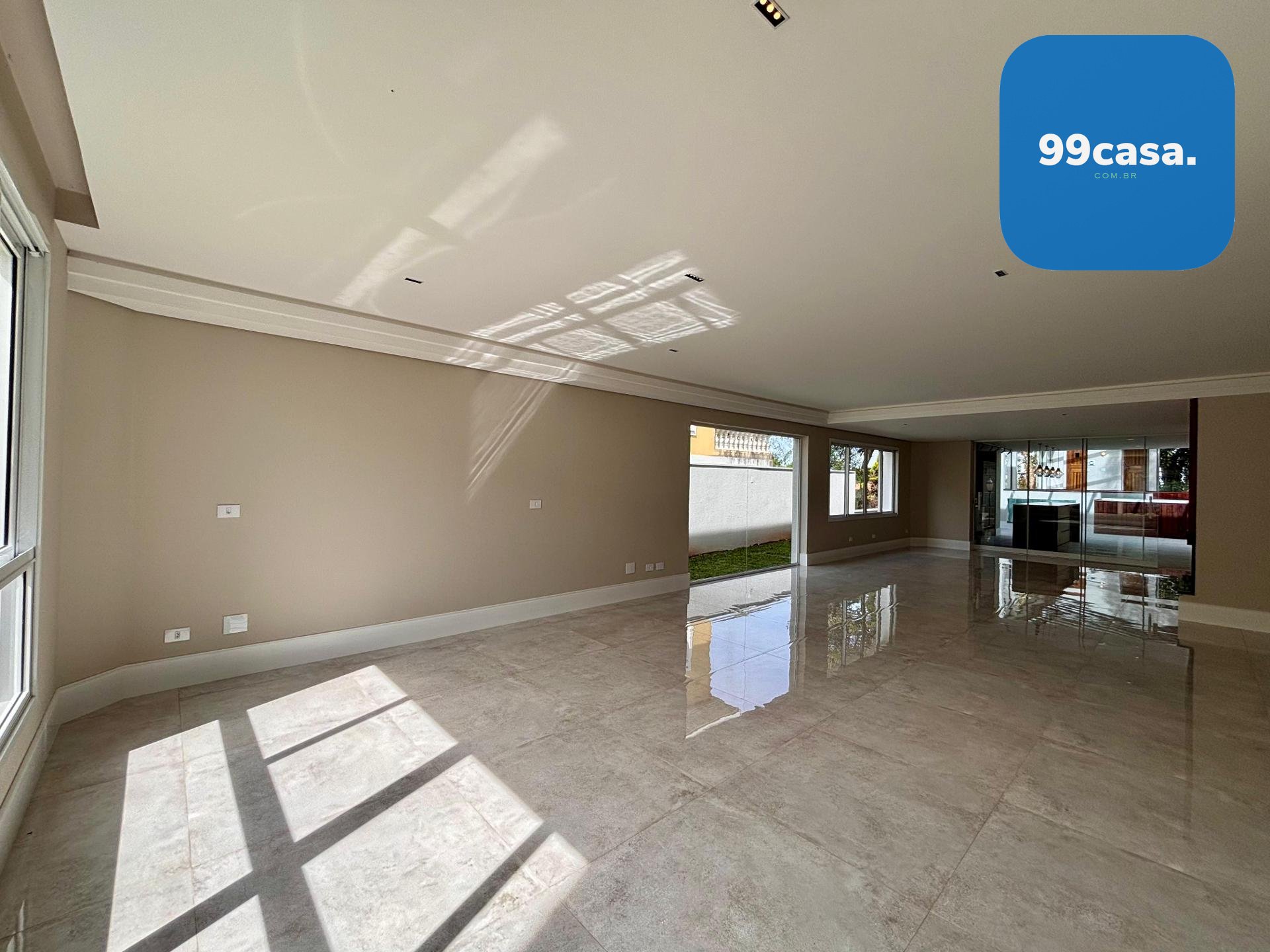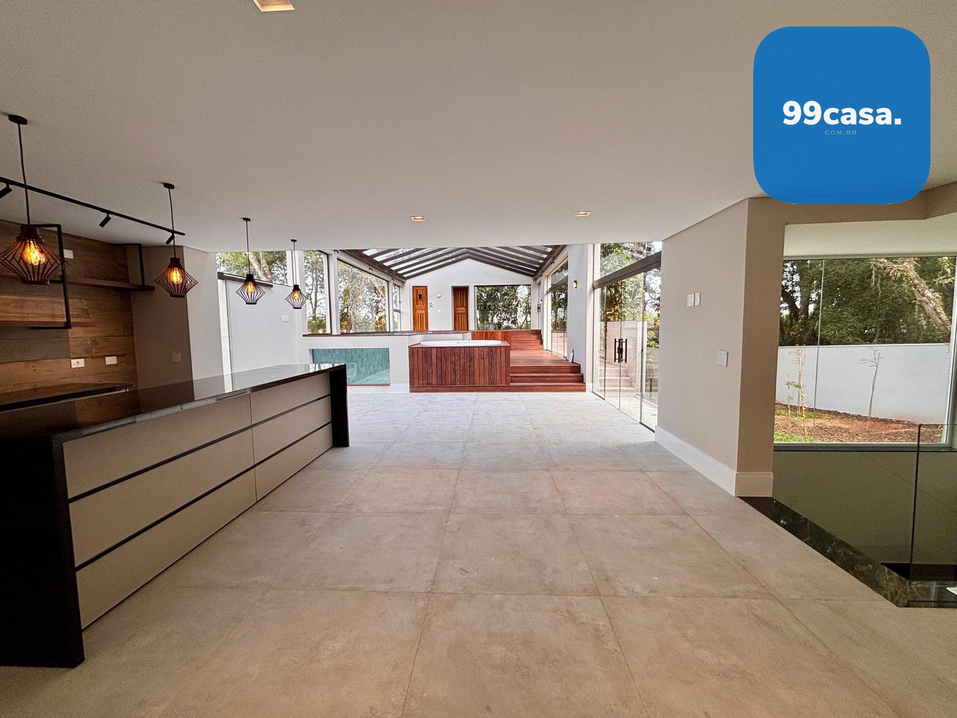 Sala ampla integrada, com lareira, piso em porcelanato e iluminação natural abundante