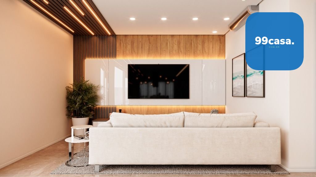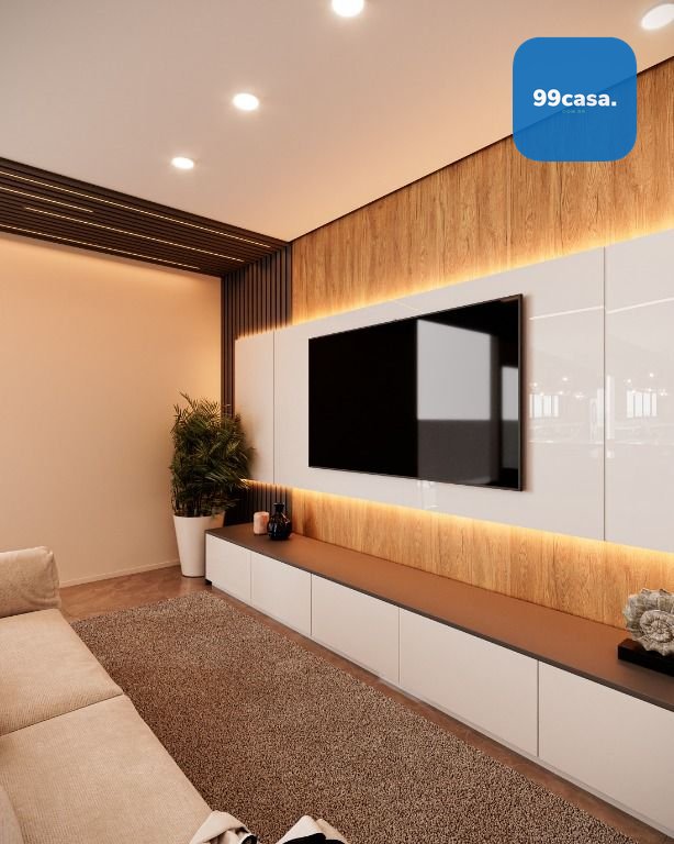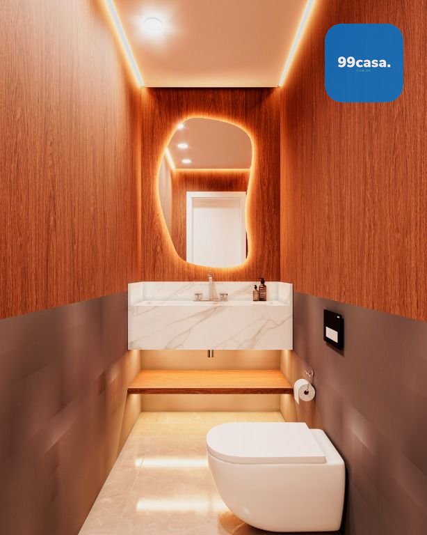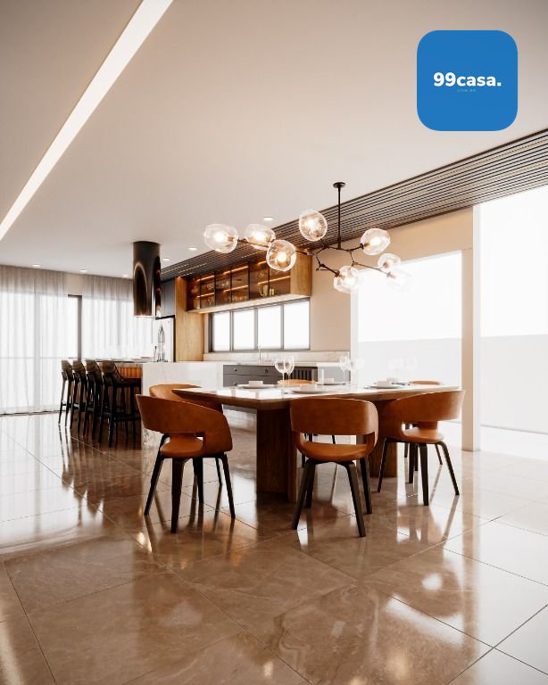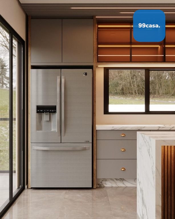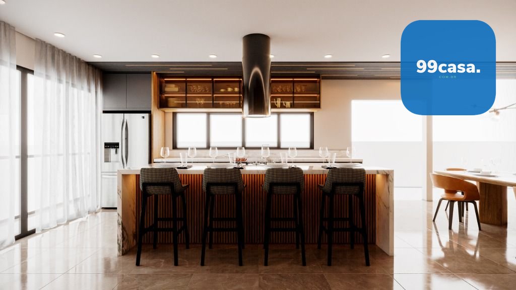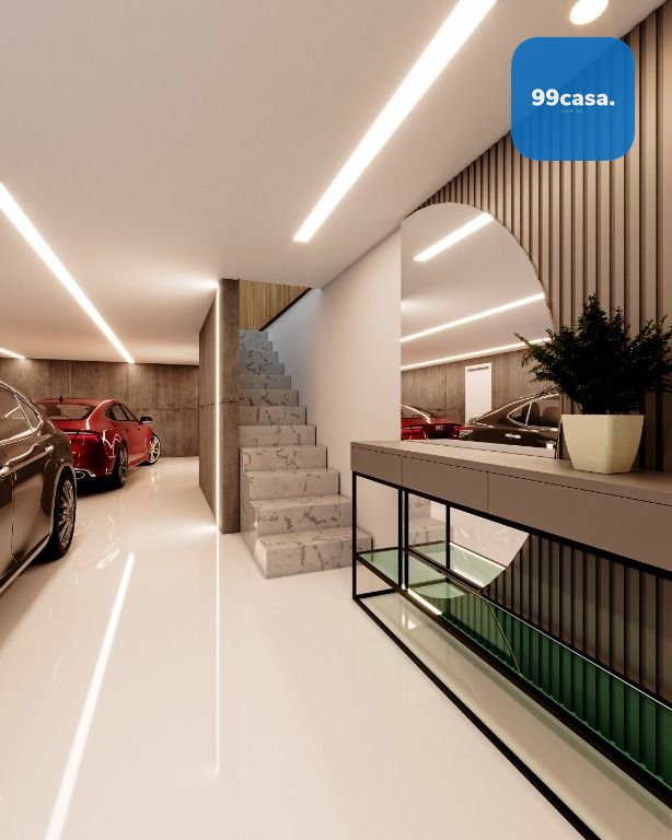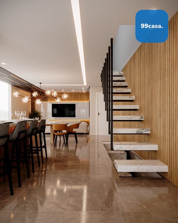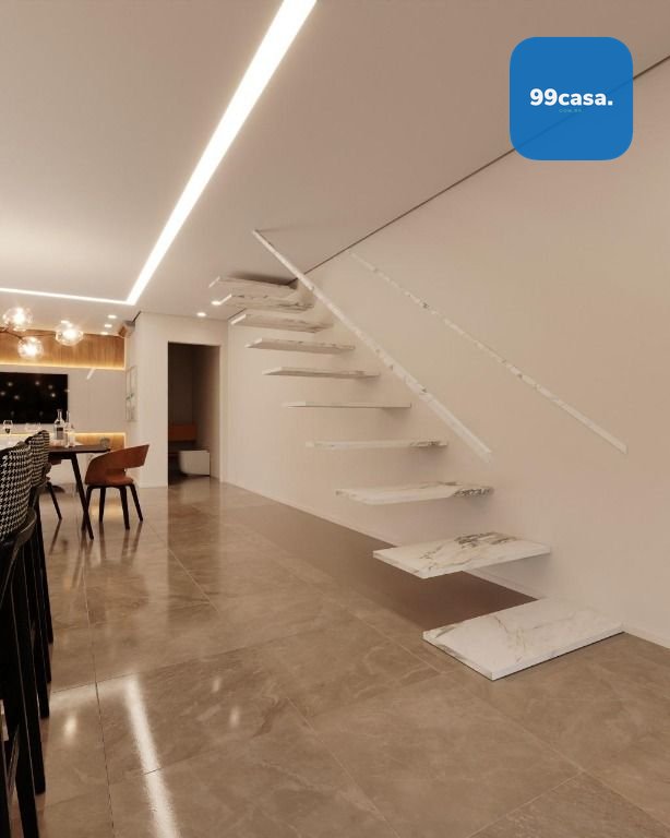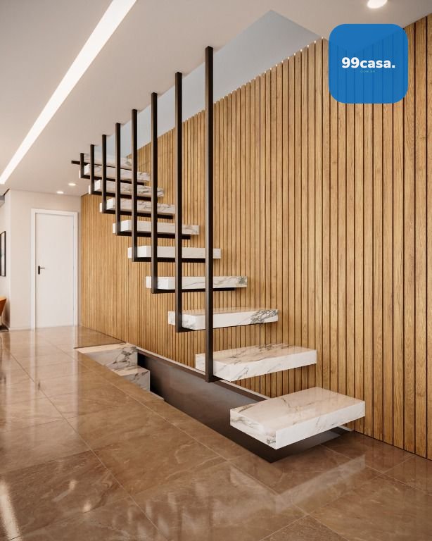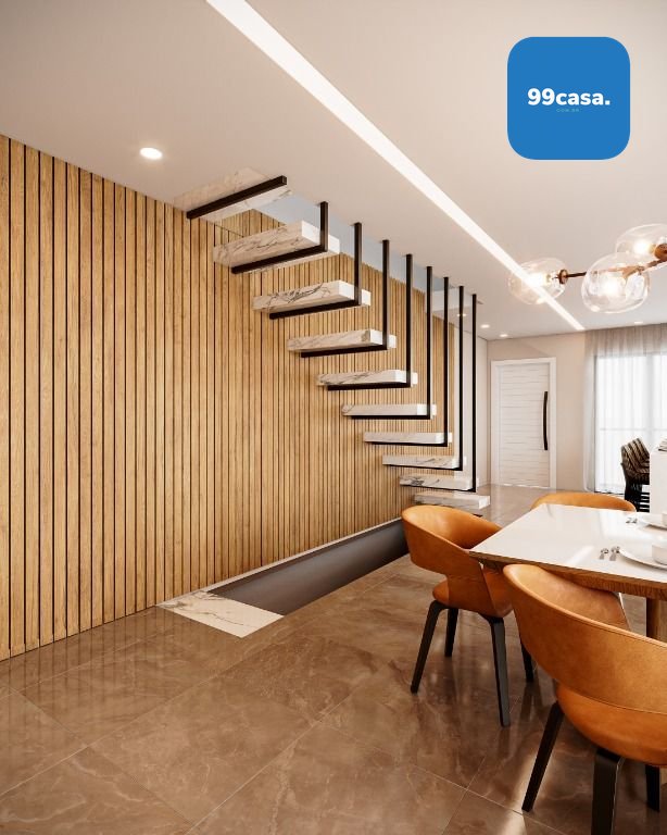 No térreo temos uma ampla sala com 2 ambientes integrada com a cozinha, escada design suspensa, lavabo e varanda aberta.