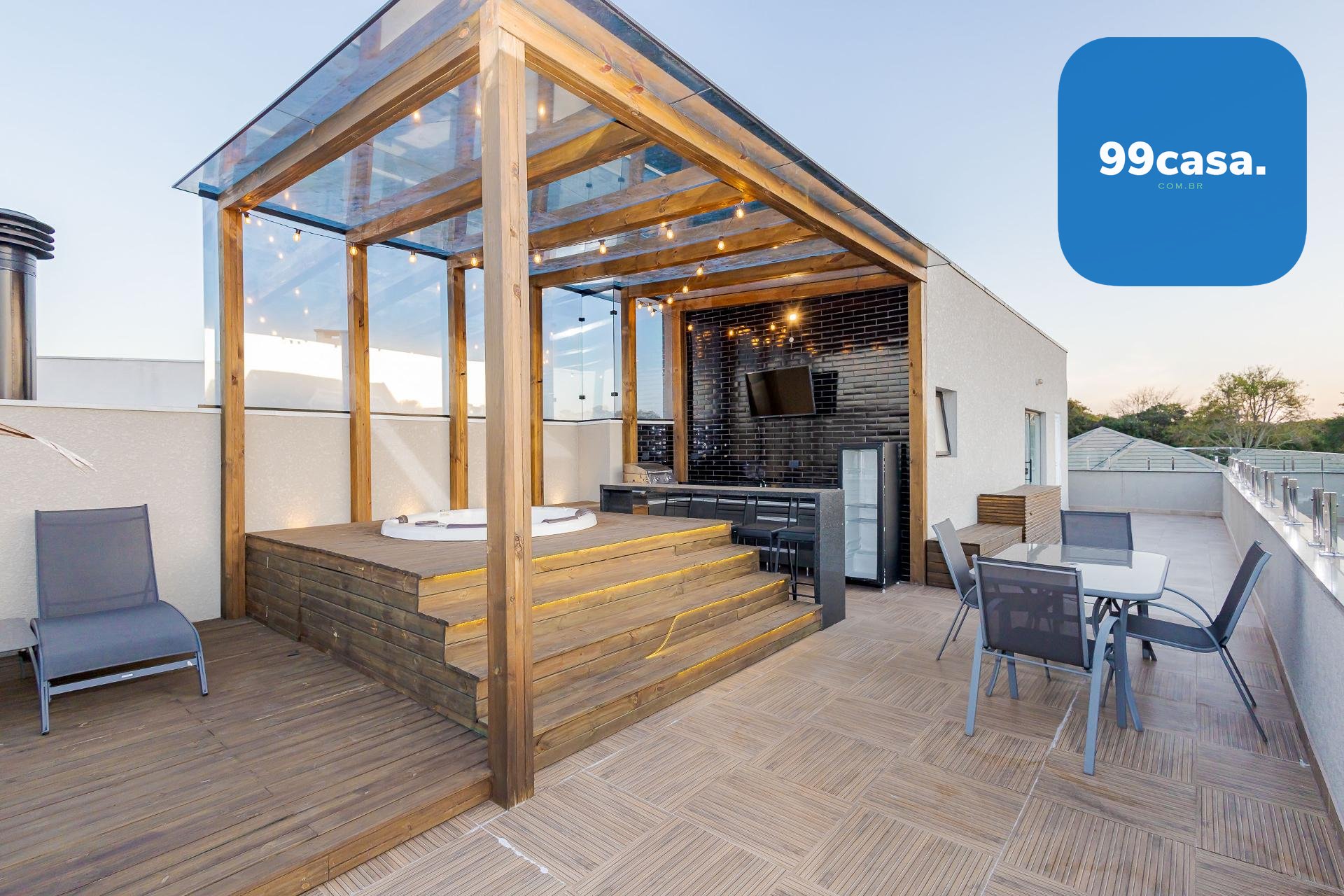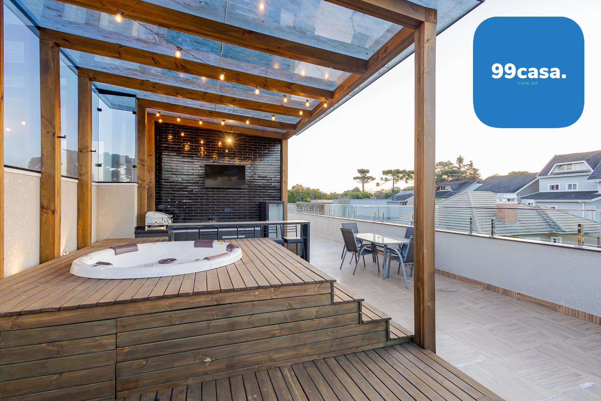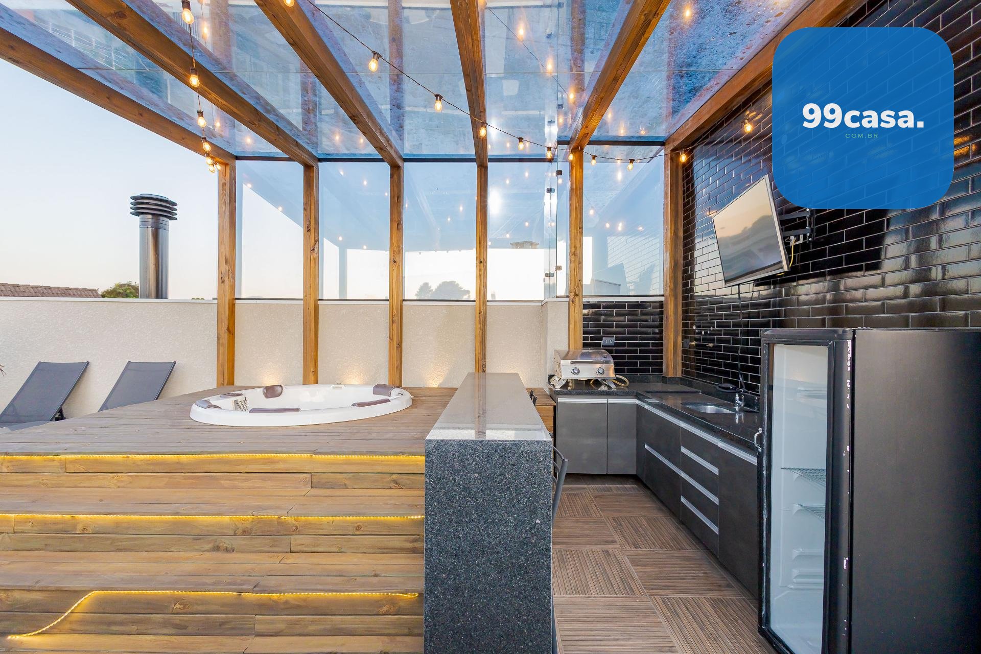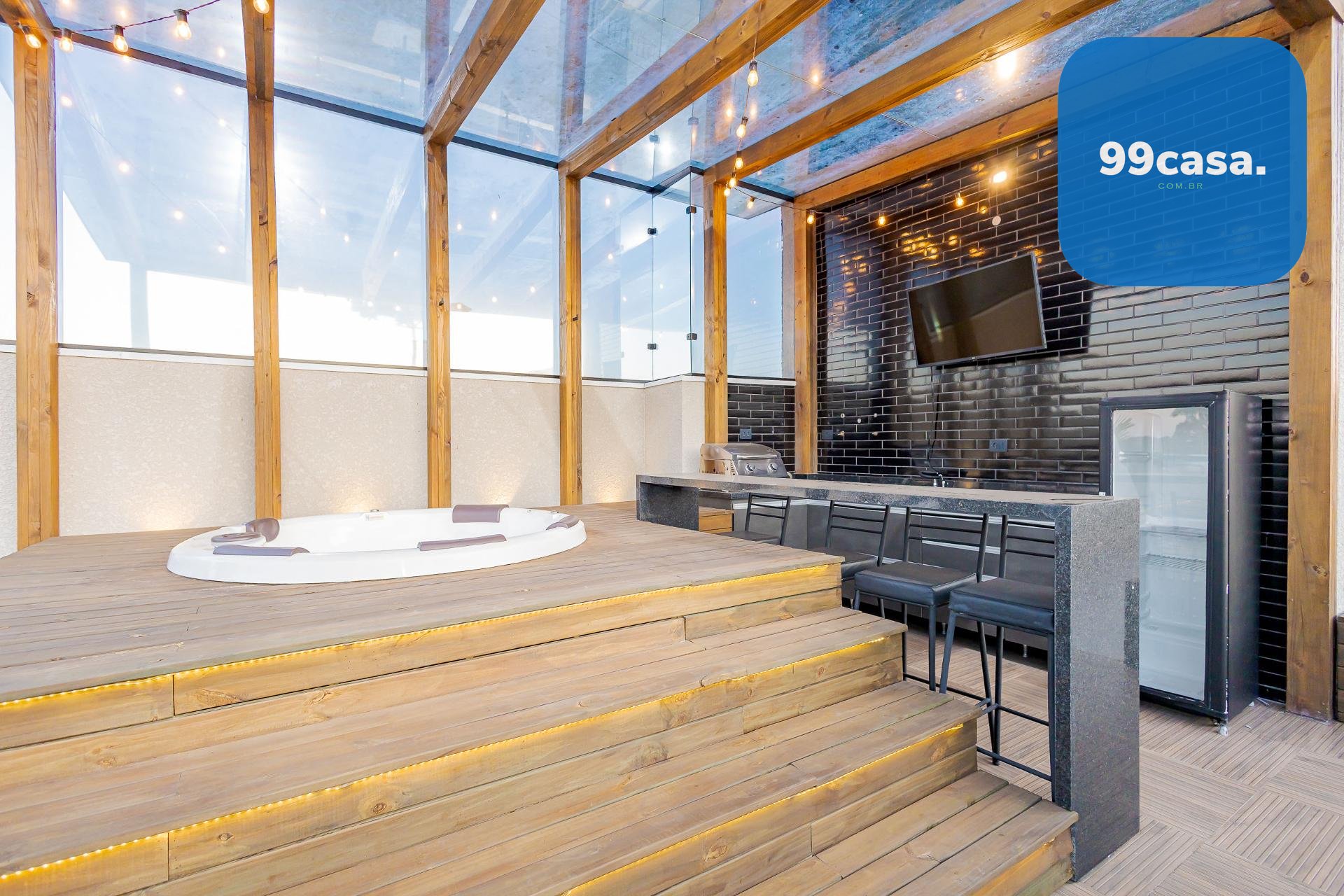 * O terraço é um espetáculo à parte com a JACUZZI em um charmoso deck de madeira ao lado de um espaço gourmet coberto, além de um generoso espaço descoberto
