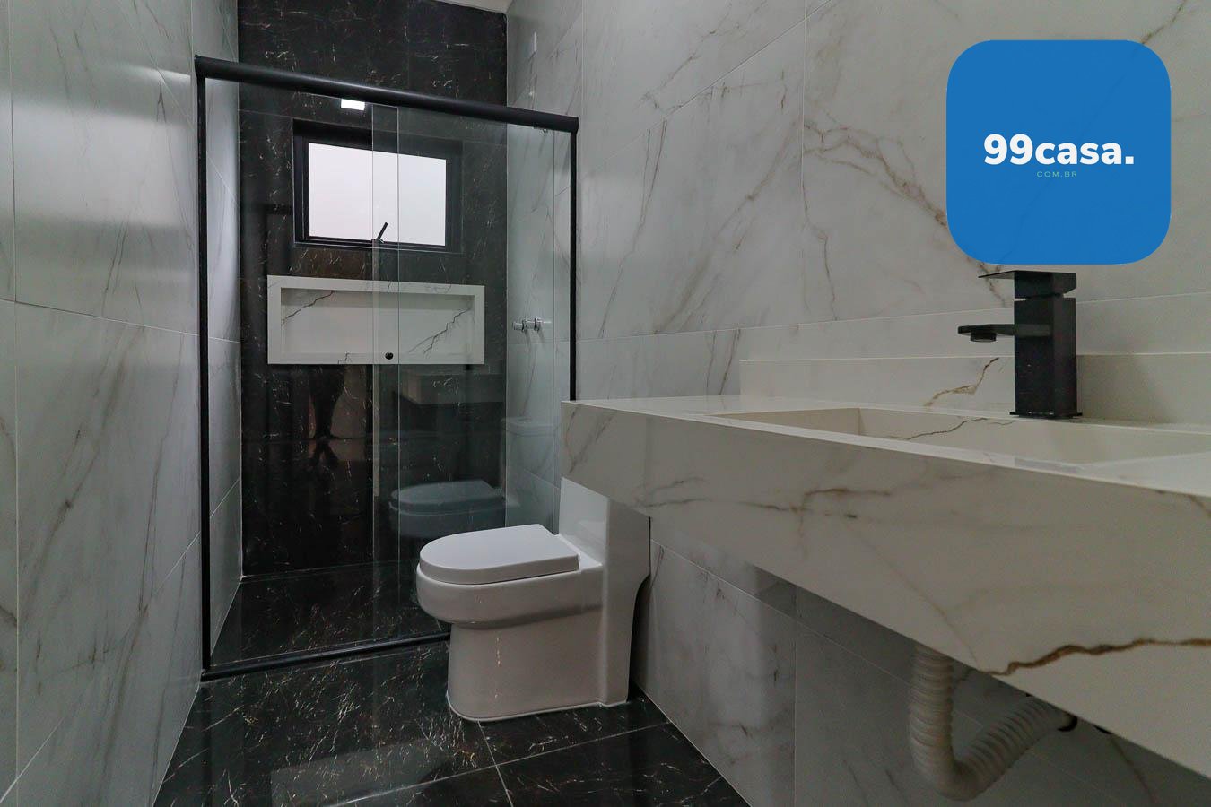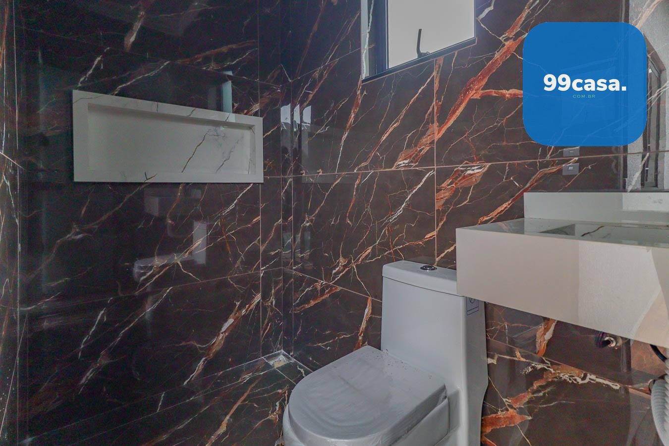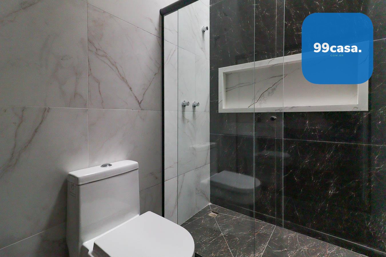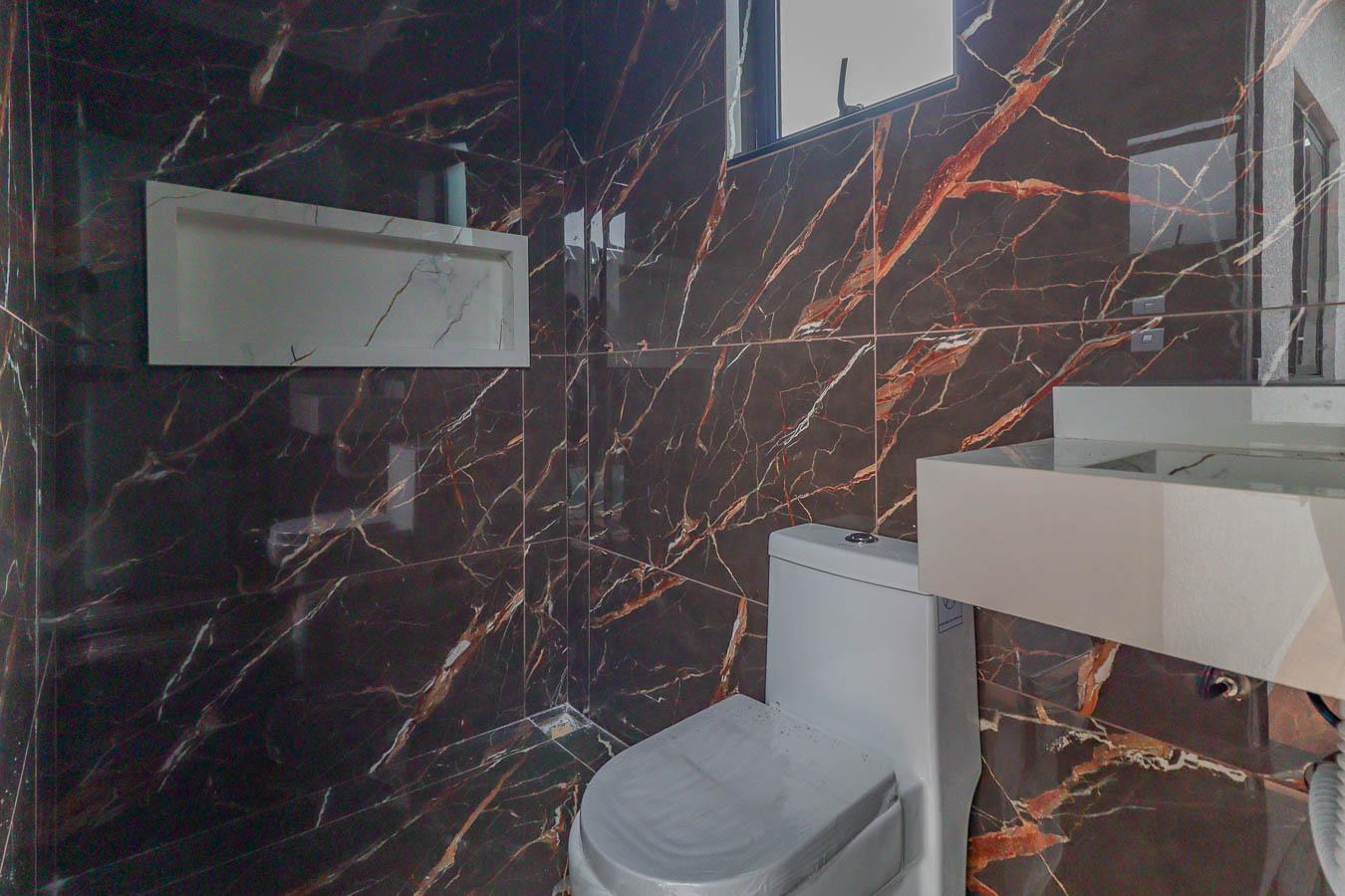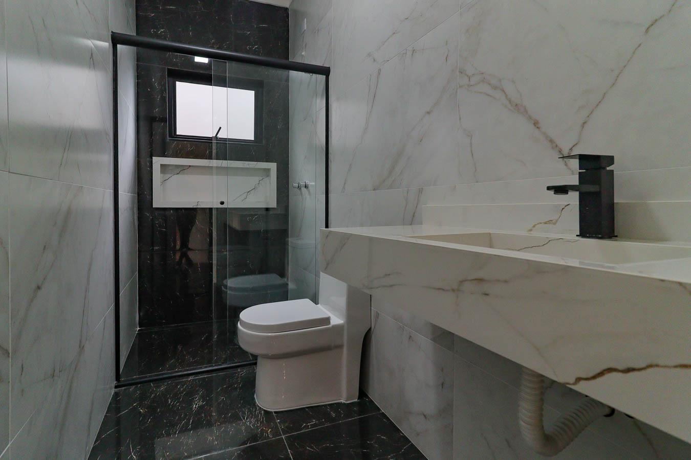 - 3 Quartos (1 Suíte): Banheiro da suíte com pia dupla esculpida em porcelanato, nicho grande e box.