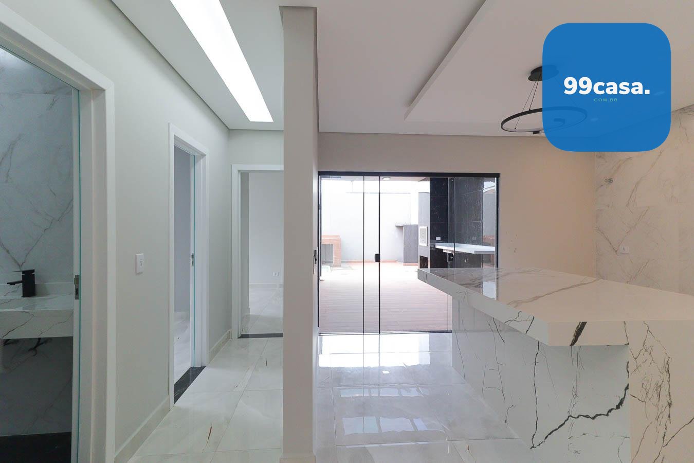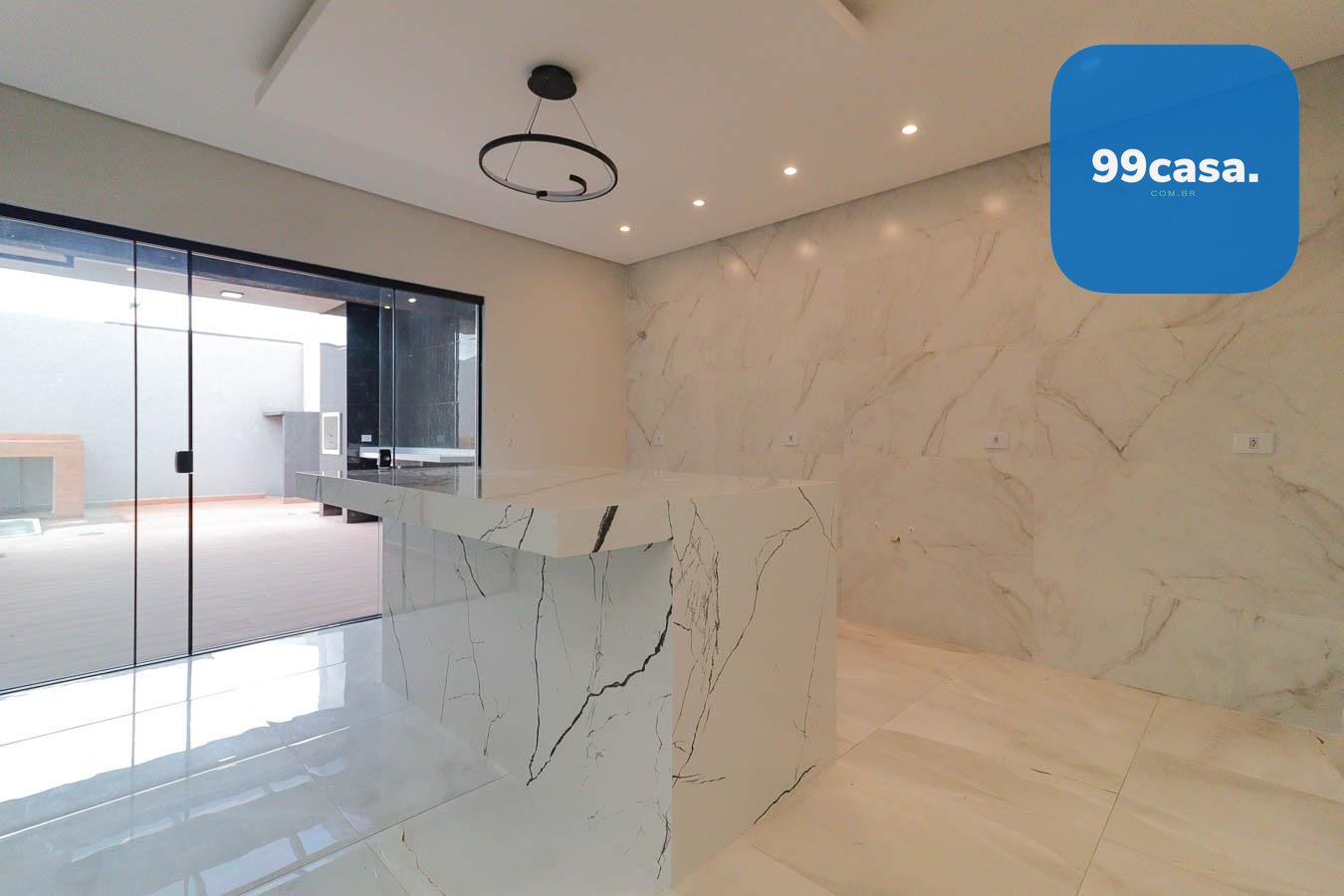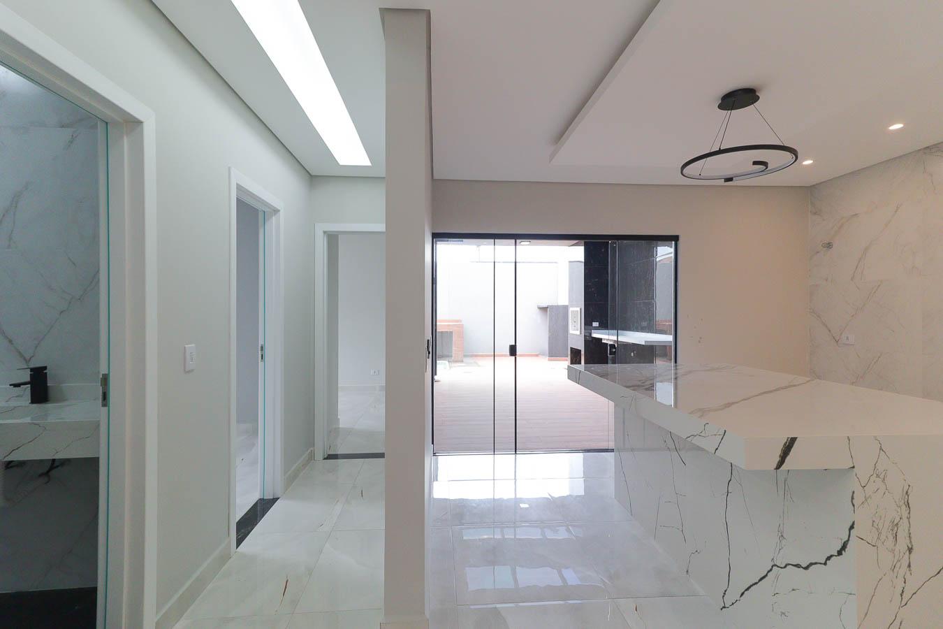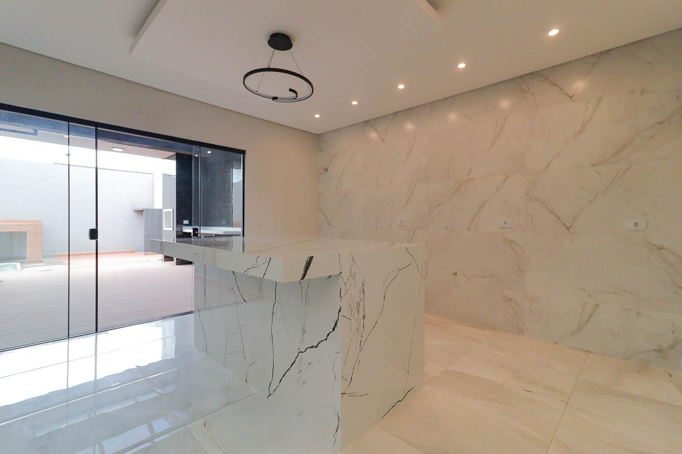 - Cozinha Ampla: Bancada em porcelanato e lustre para um ambiente sofisticado.