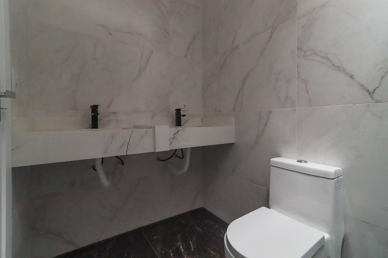 - Banheiro Social: Box, nicho em porcelanato e pia esculpida.