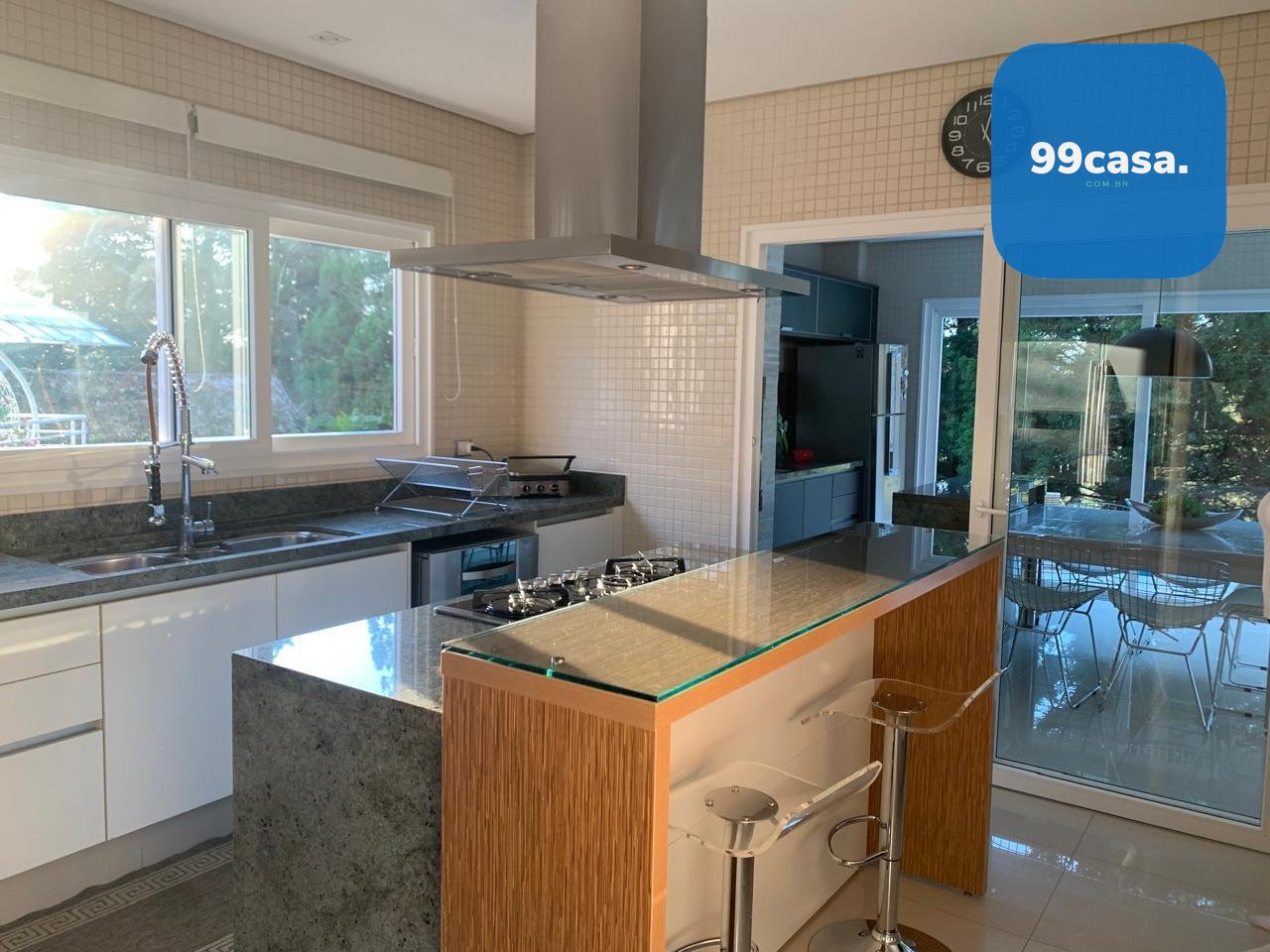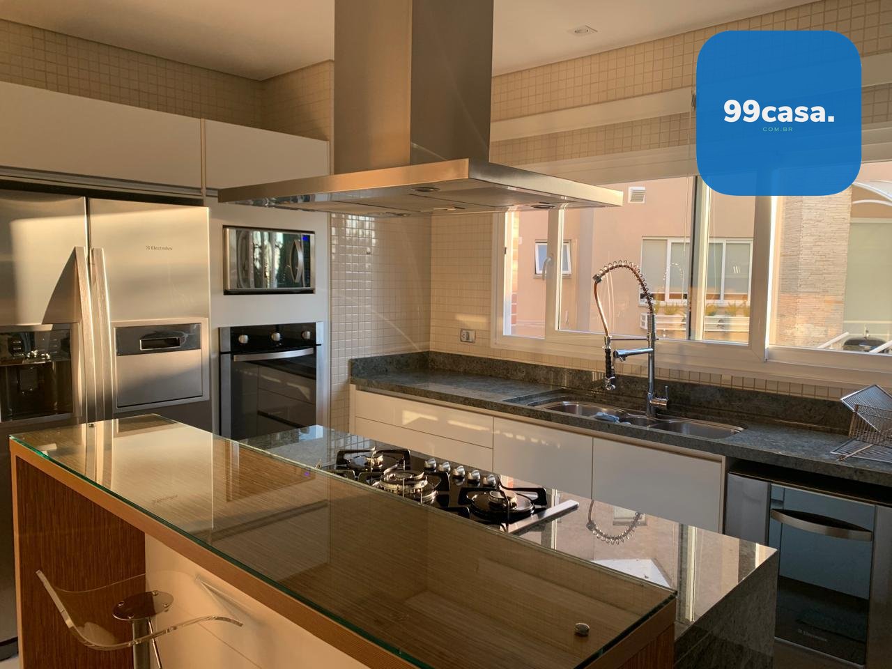 O pavimento térreo reúne os principais ambientes sociais da casa. A cozinha é ampla e totalmente planejada, com ilha central, bancadas em granito, pia tripla em inox e eletrodomésticos embutidos, incluindo cooktop, coifa de ilha, forno com grill, micro-ondas, lava-