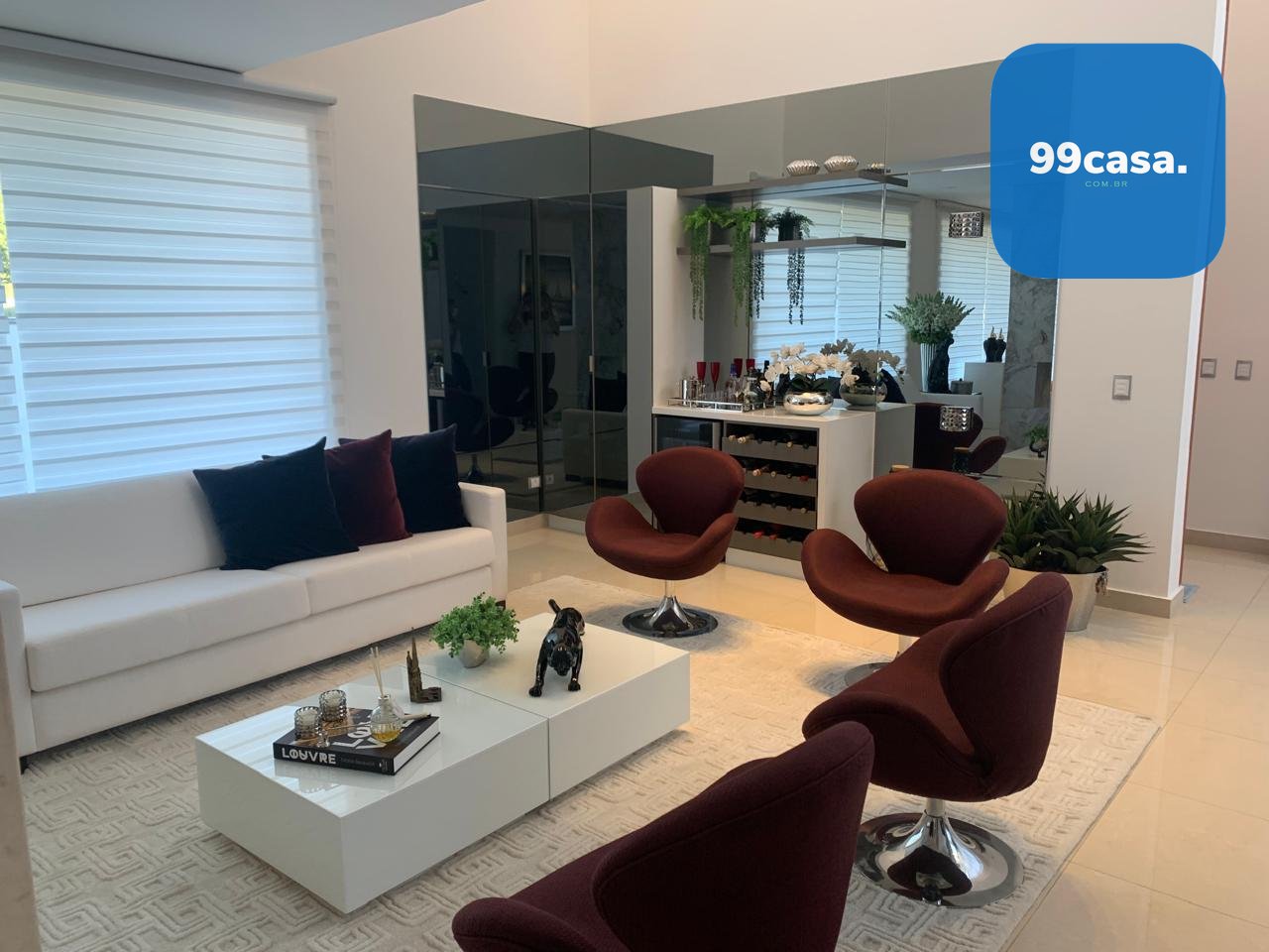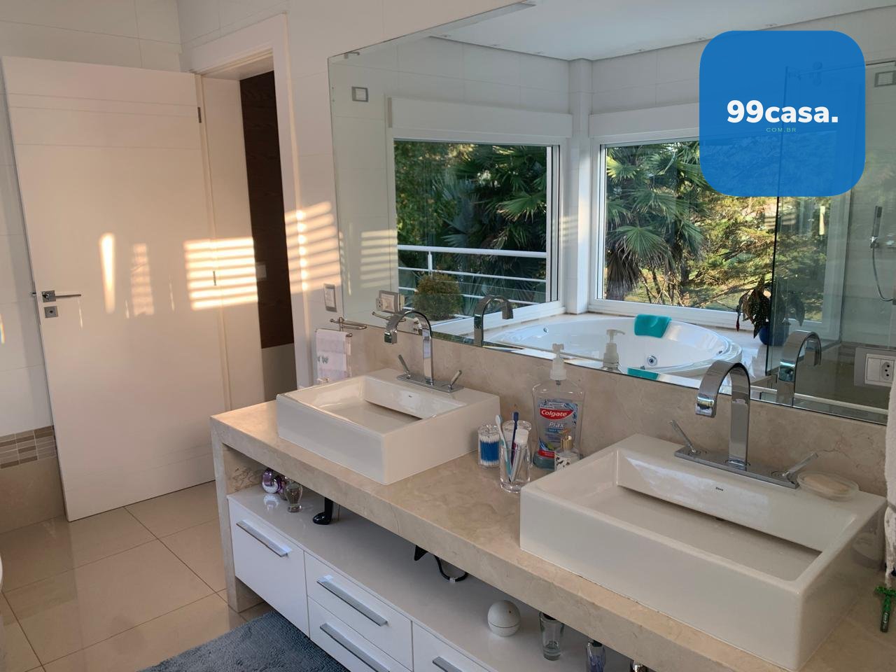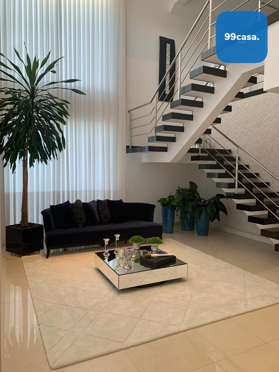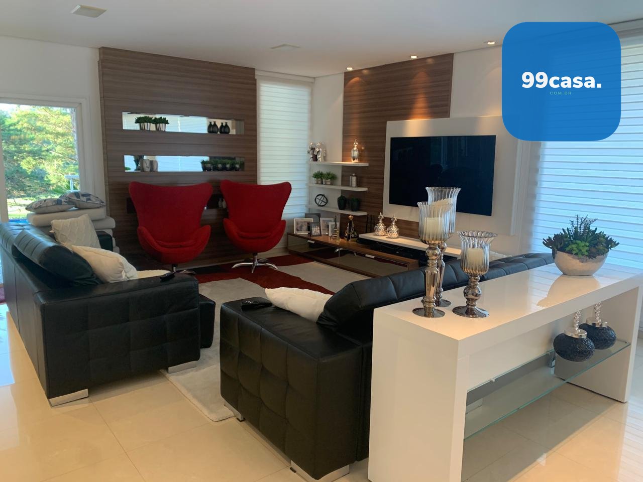 A residência conta com elevador atendendo os quatro pavimentos, aquecimento solar, ambientes climatizados e marcenaria planejada de alto padrão.