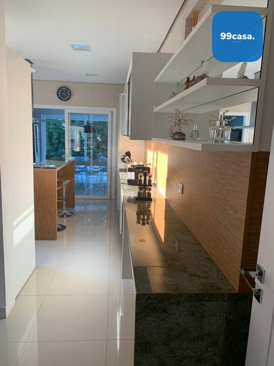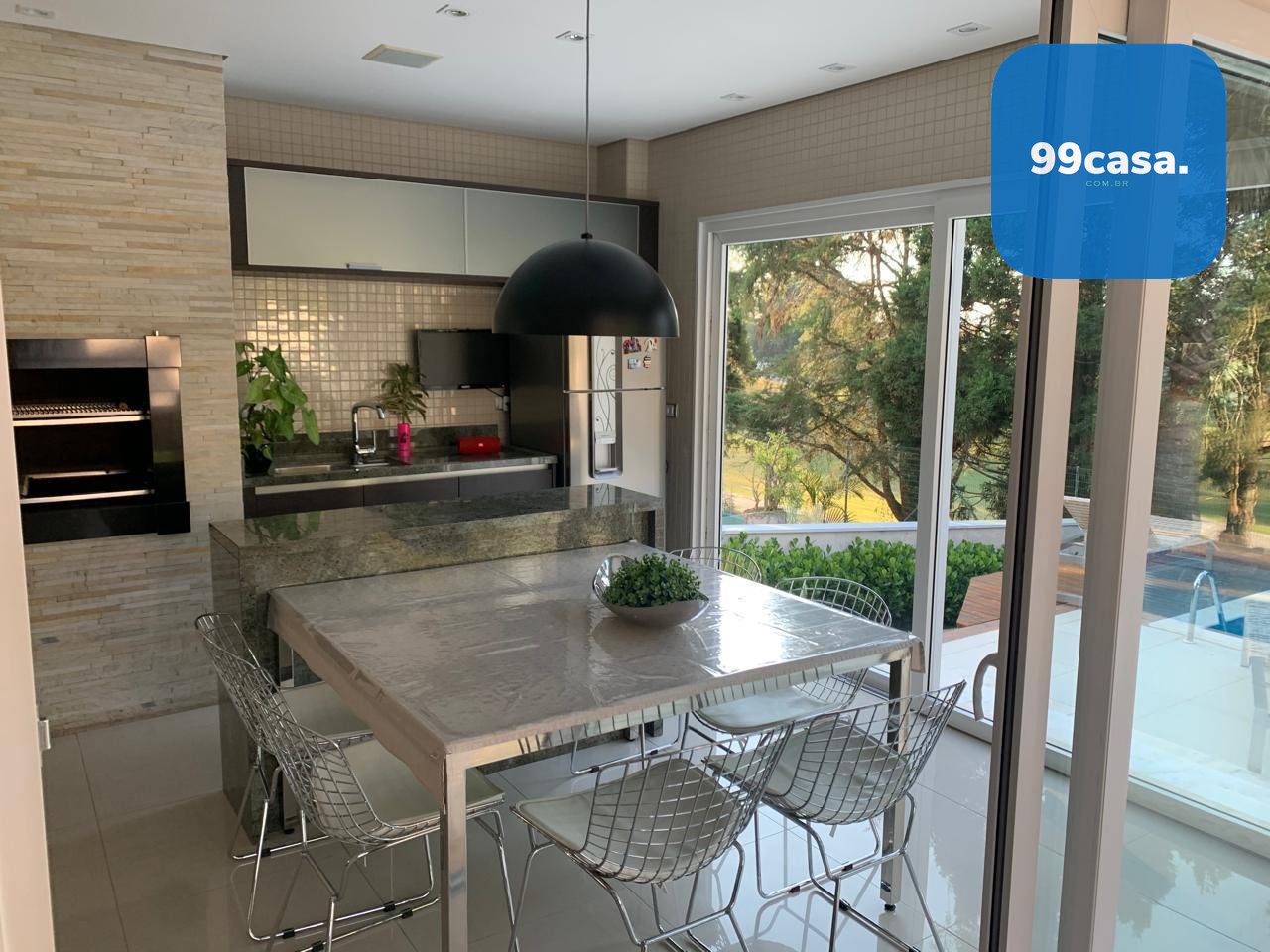 louças e geladeira side-by-side. Integrado à cozinha, o espaço gourmet conta com churrasqueira, bancadas em granito, armários planejados e ambiente ideal para receber convidados. A área externa possui varanda mobiliada, piscina com espaço para descanso e paisagismo, criando um ambiente agradável