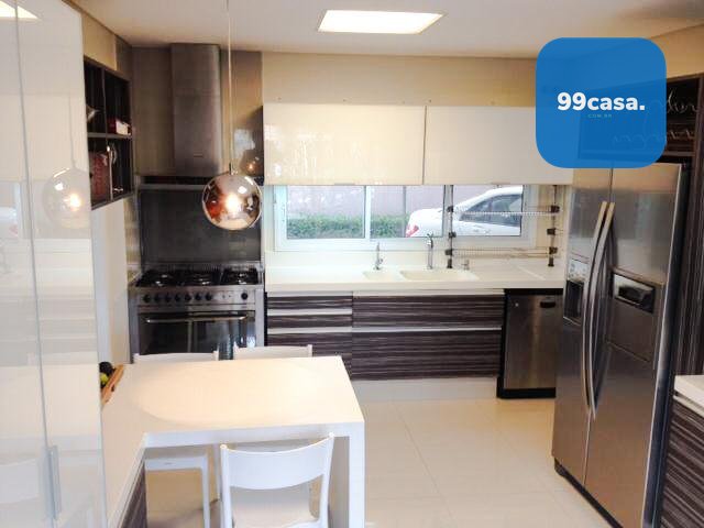 Piso térreo: Sala de estar e jantar integradas, escritório, lavabo, cozinha planejada, dependência de empregada, área de serviço e garagem para 3 carros.