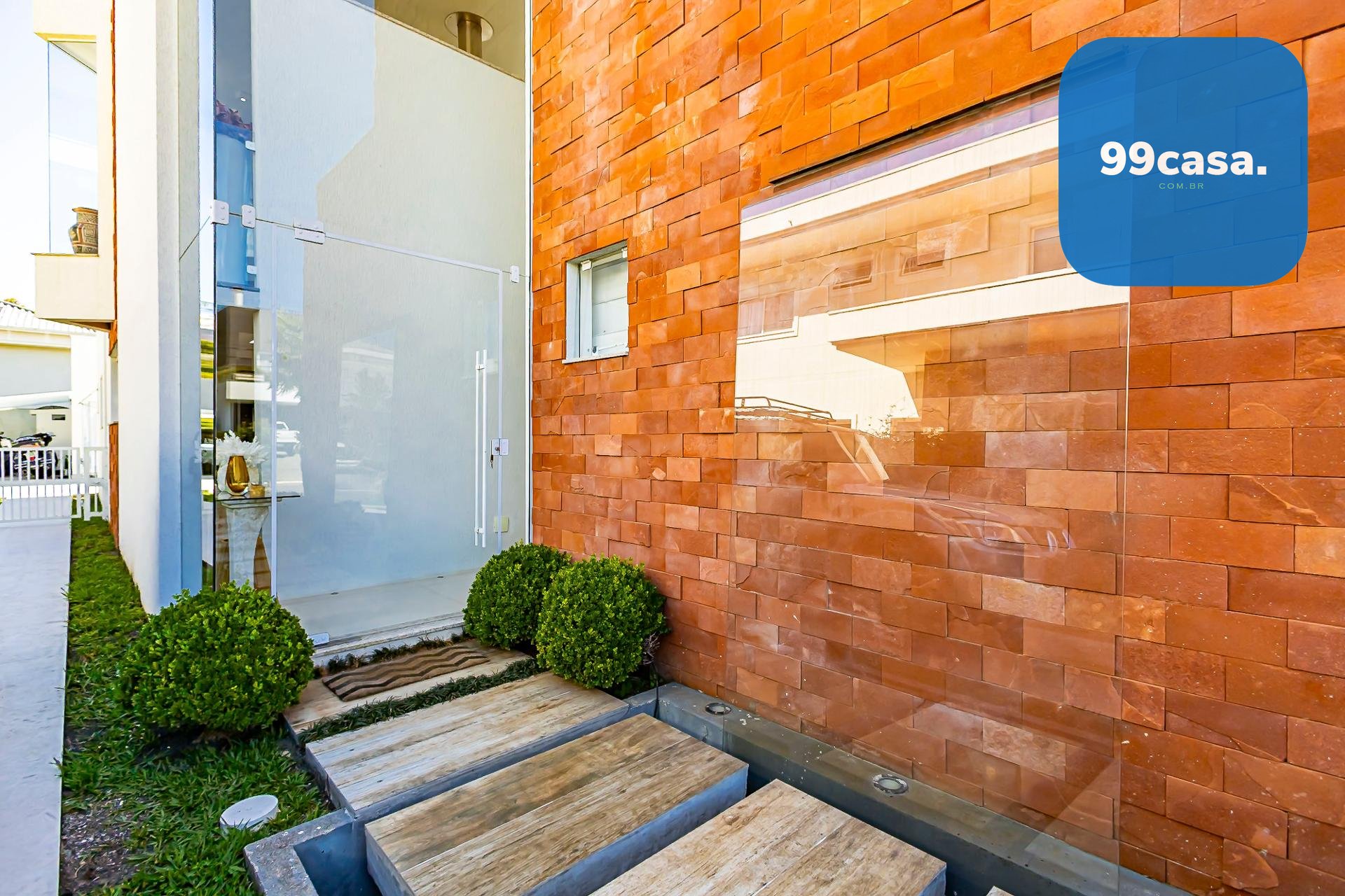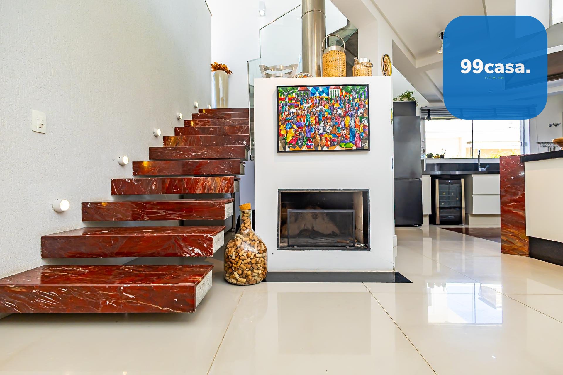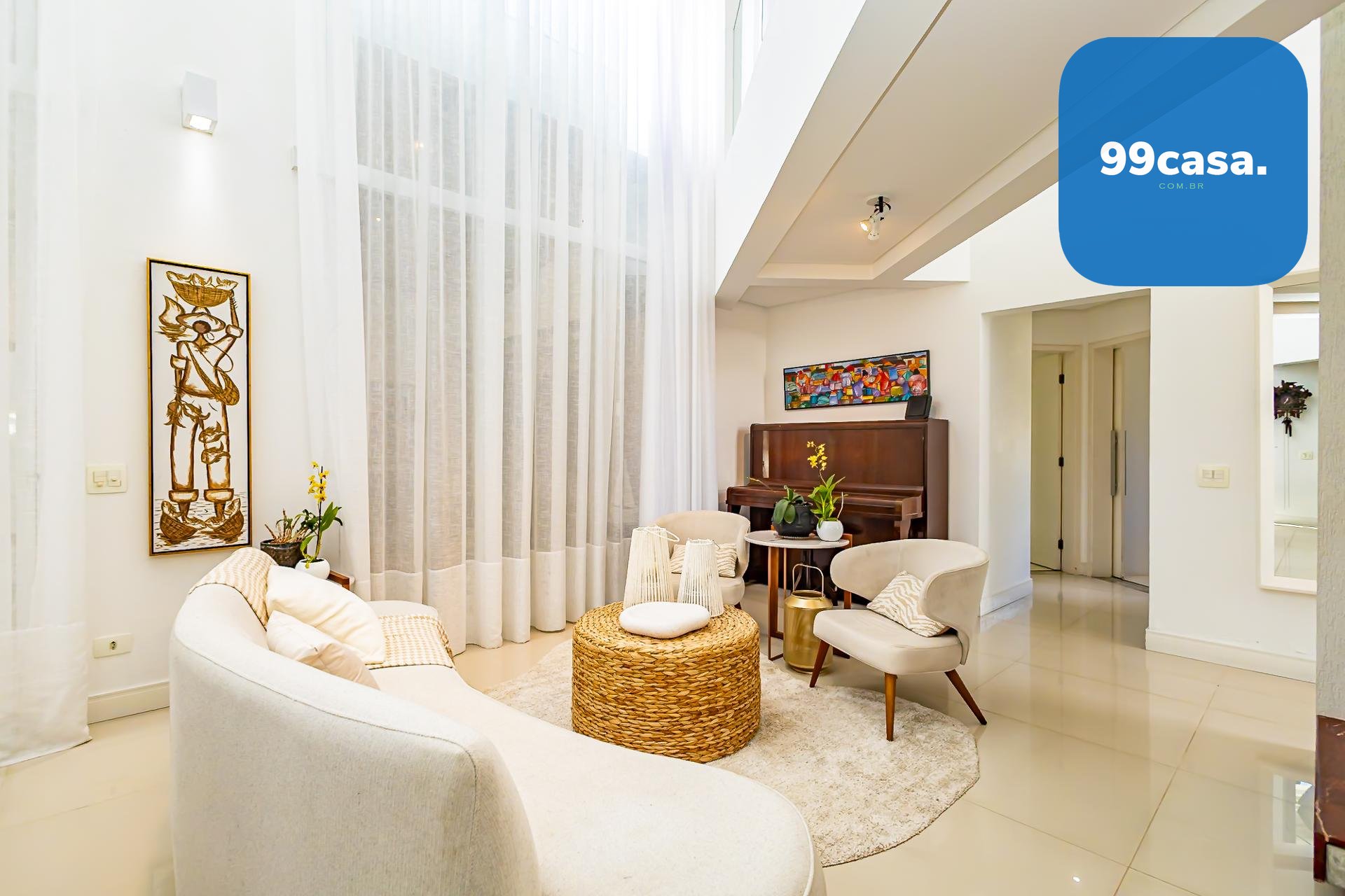 Logo na entrada, a casa recebe com uma charmosa cascata que conduz a uma sala imponente, com pé-direito duplo e abundância de luz natural.