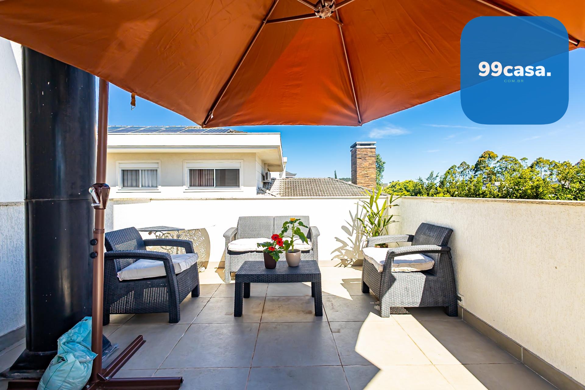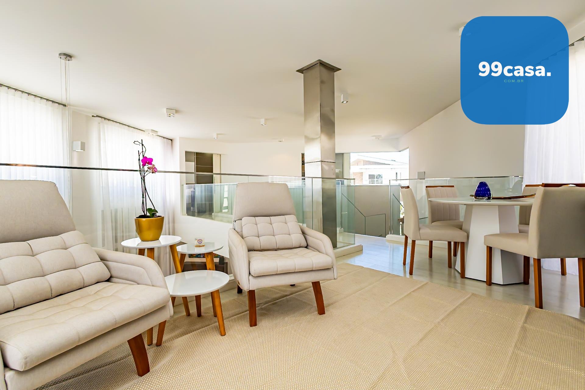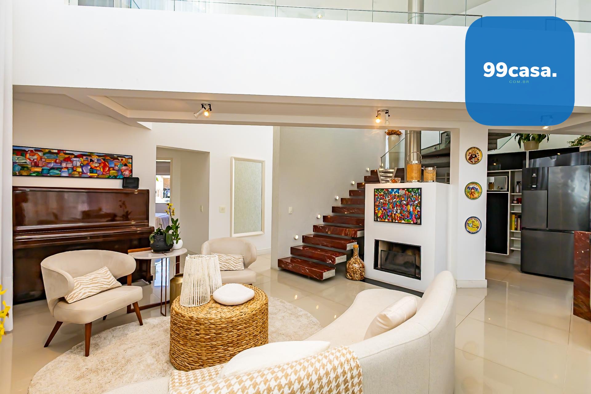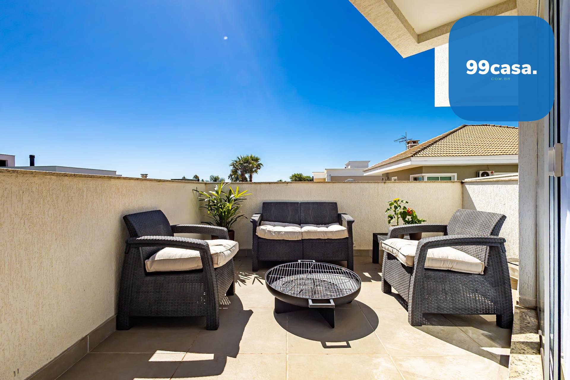 Subindo as escadas, surge um ambiente de convivência perfeito para reunir a família, equipado com televisão, área para jogos e um escritório com uma bela sacada, onde móveis externos convidam a aproveitar os dias de sol.