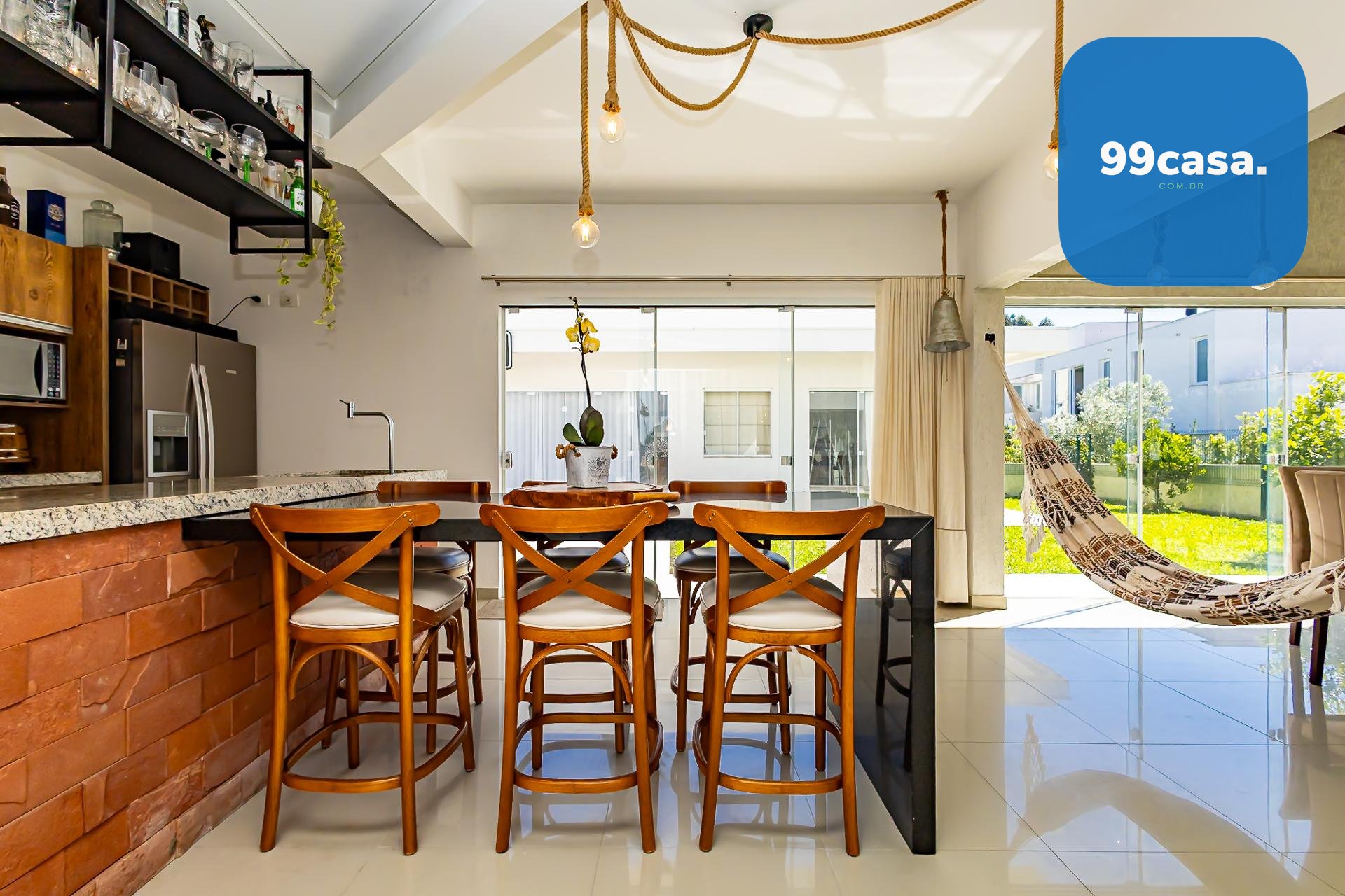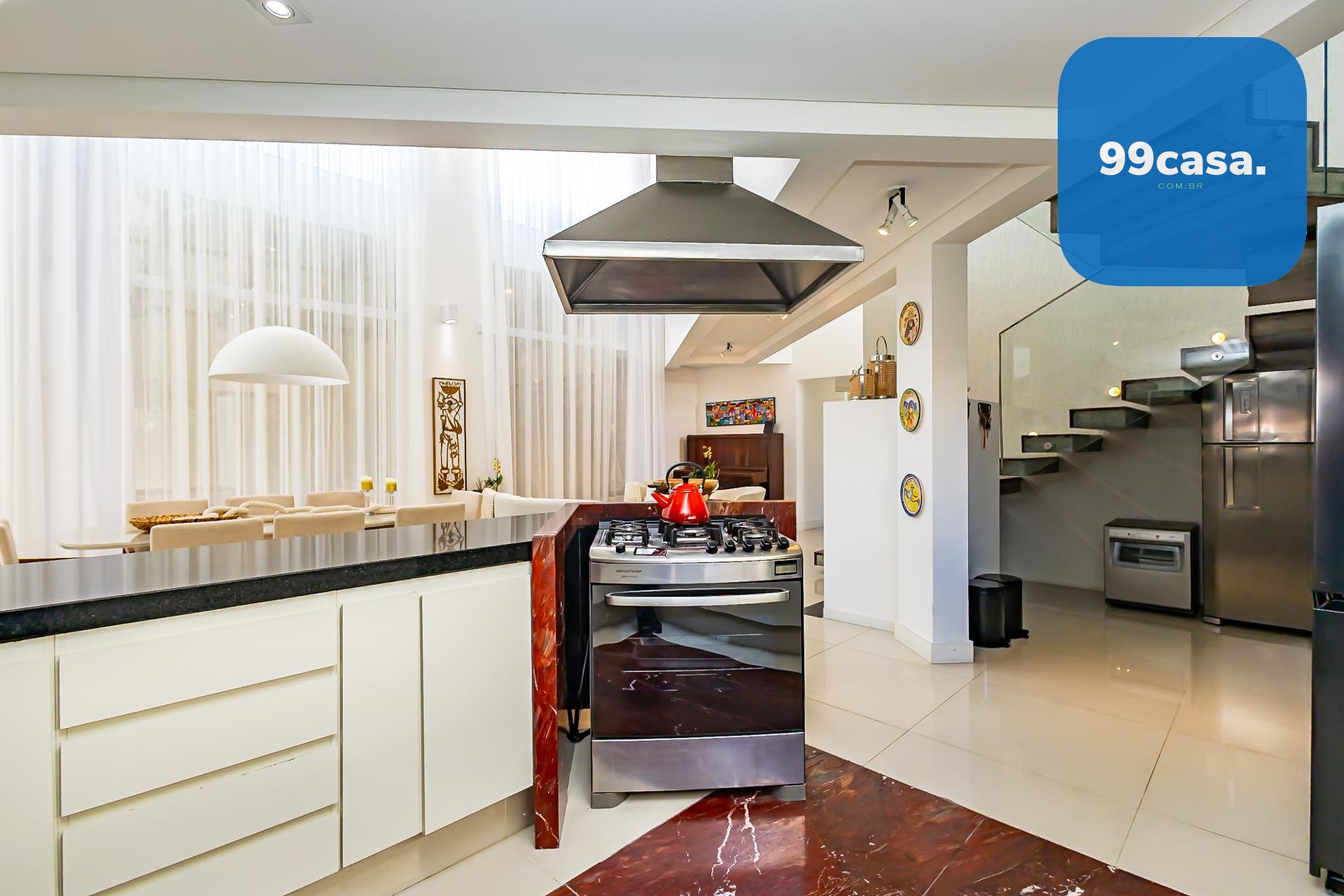 A cozinha, totalmente planejada e integrada, se conecta de forma harmoniosa à sala de jantar e à área gourmet com churrasqueira a carvão, um espaço que se integra de maneira independente tanto à sala quanto ao quintal, criando diferentes possibilidades de convívio.