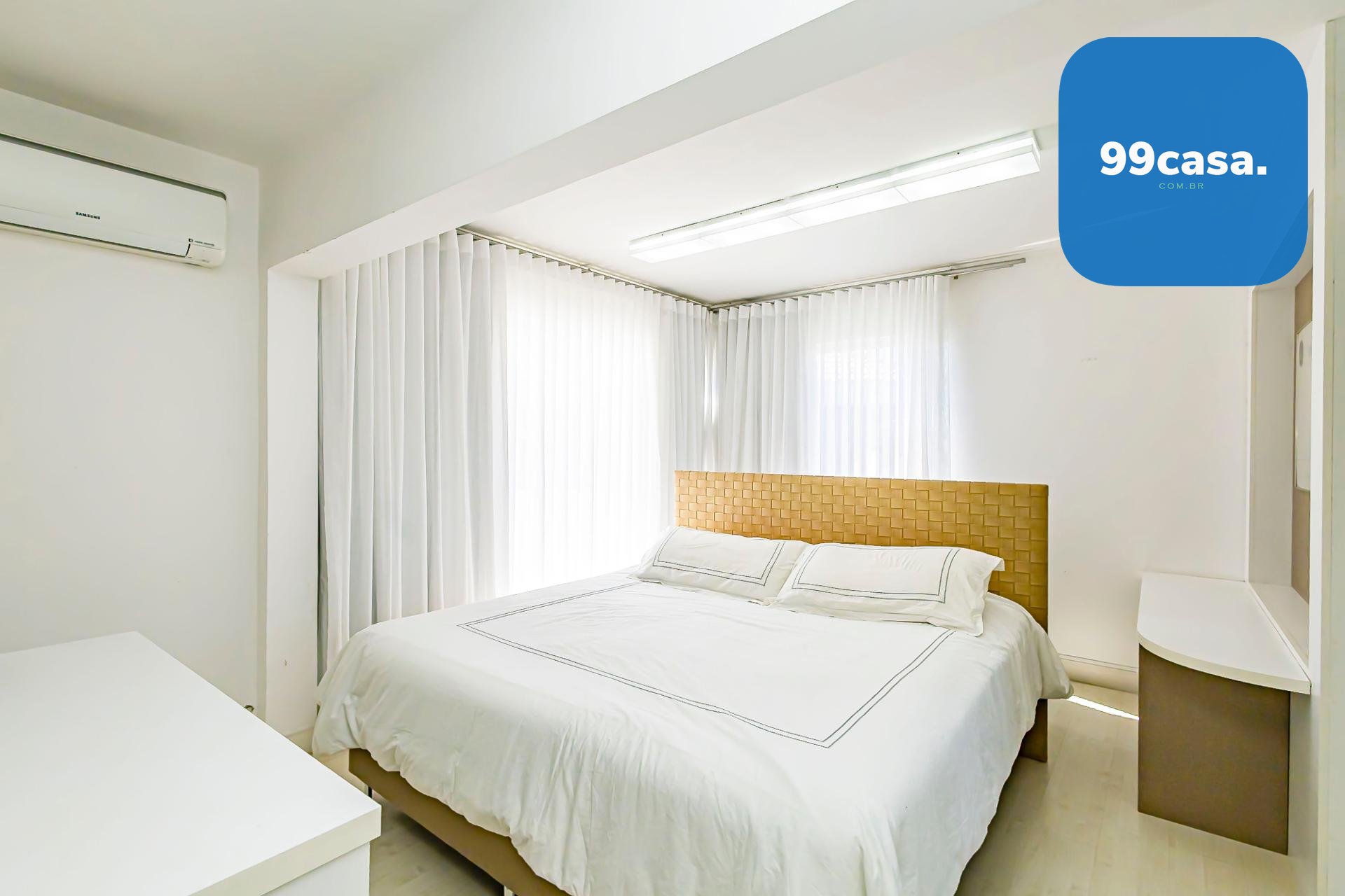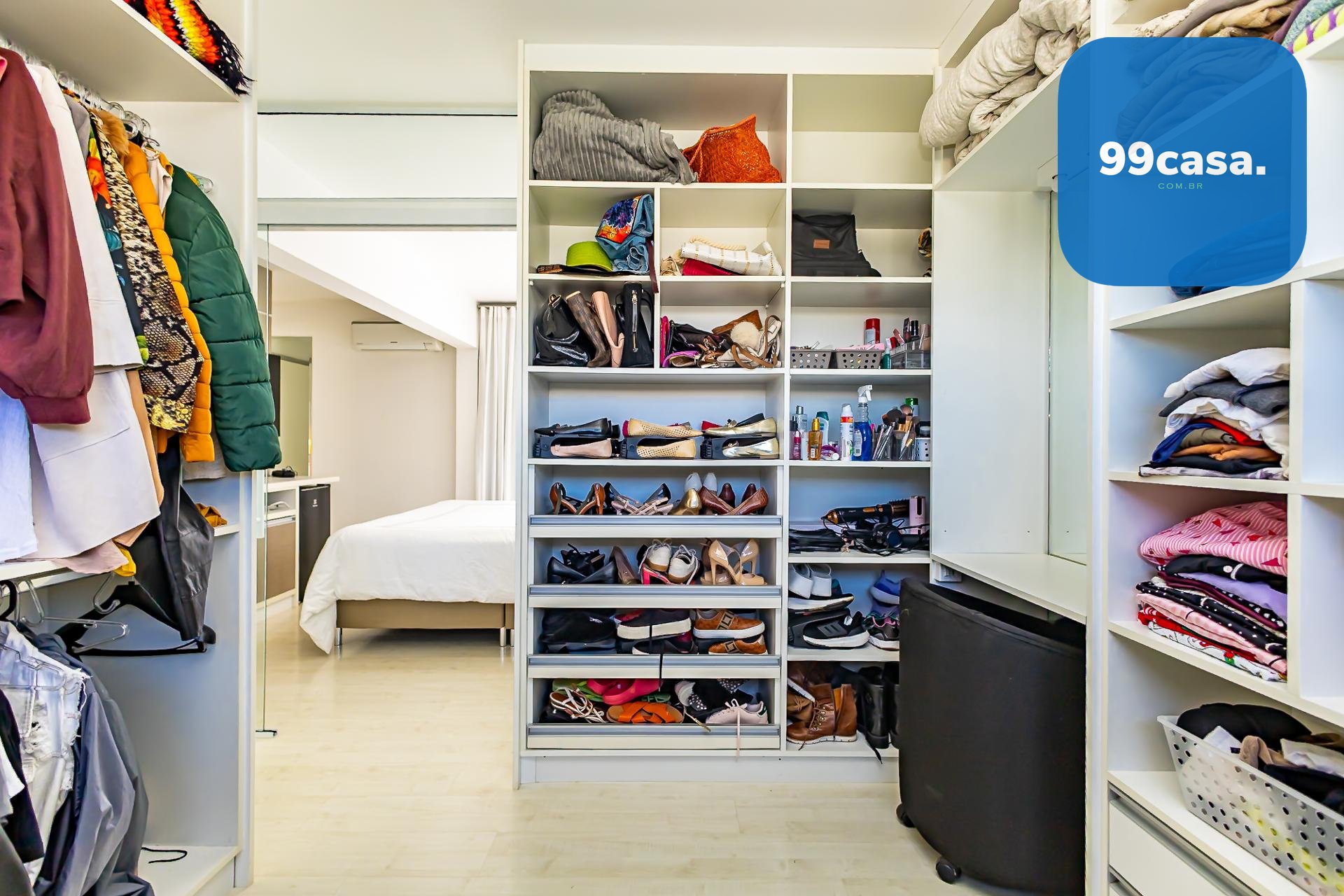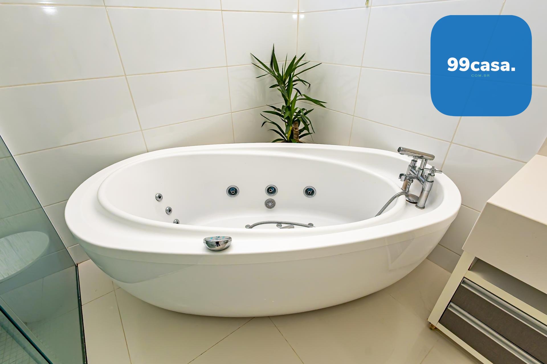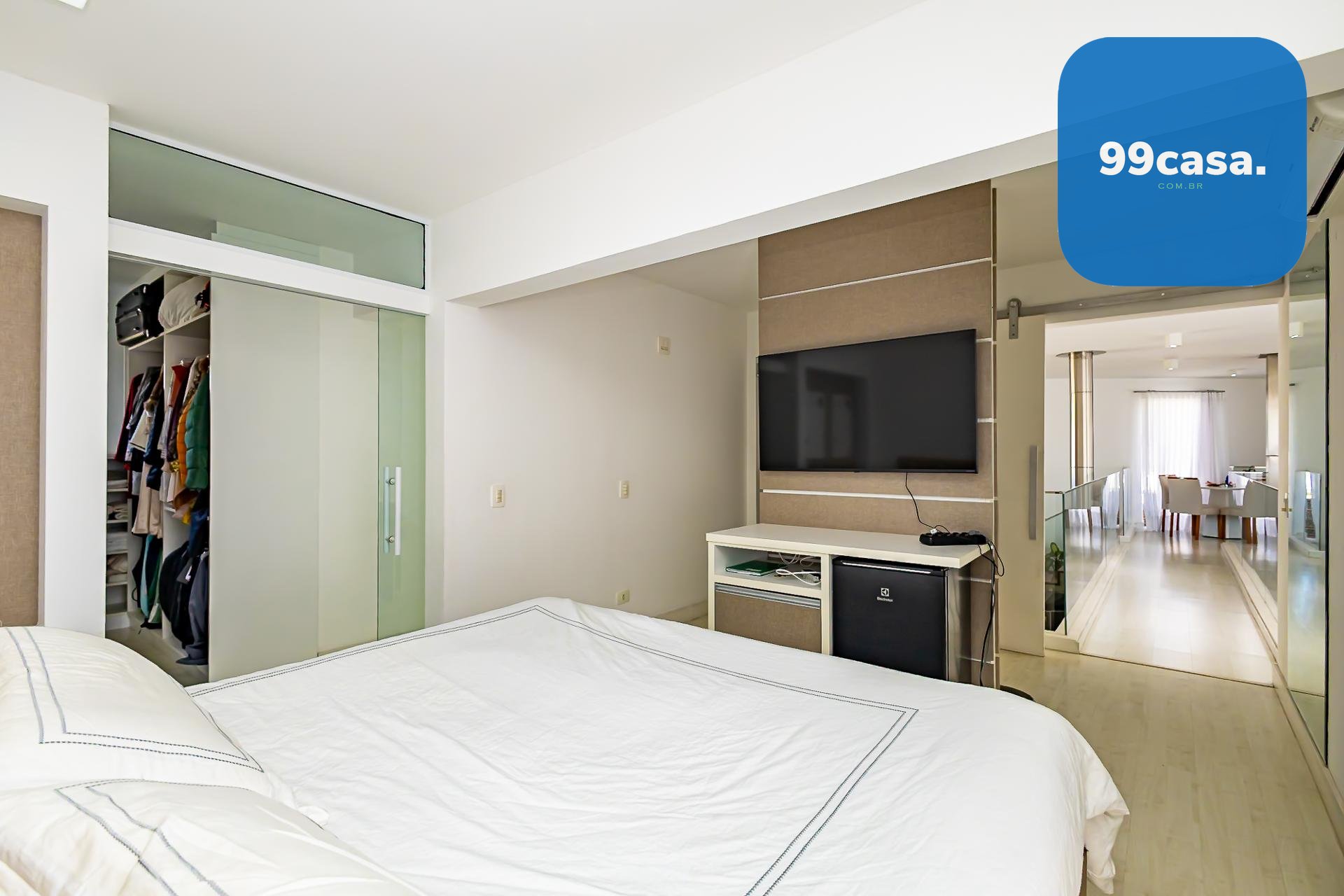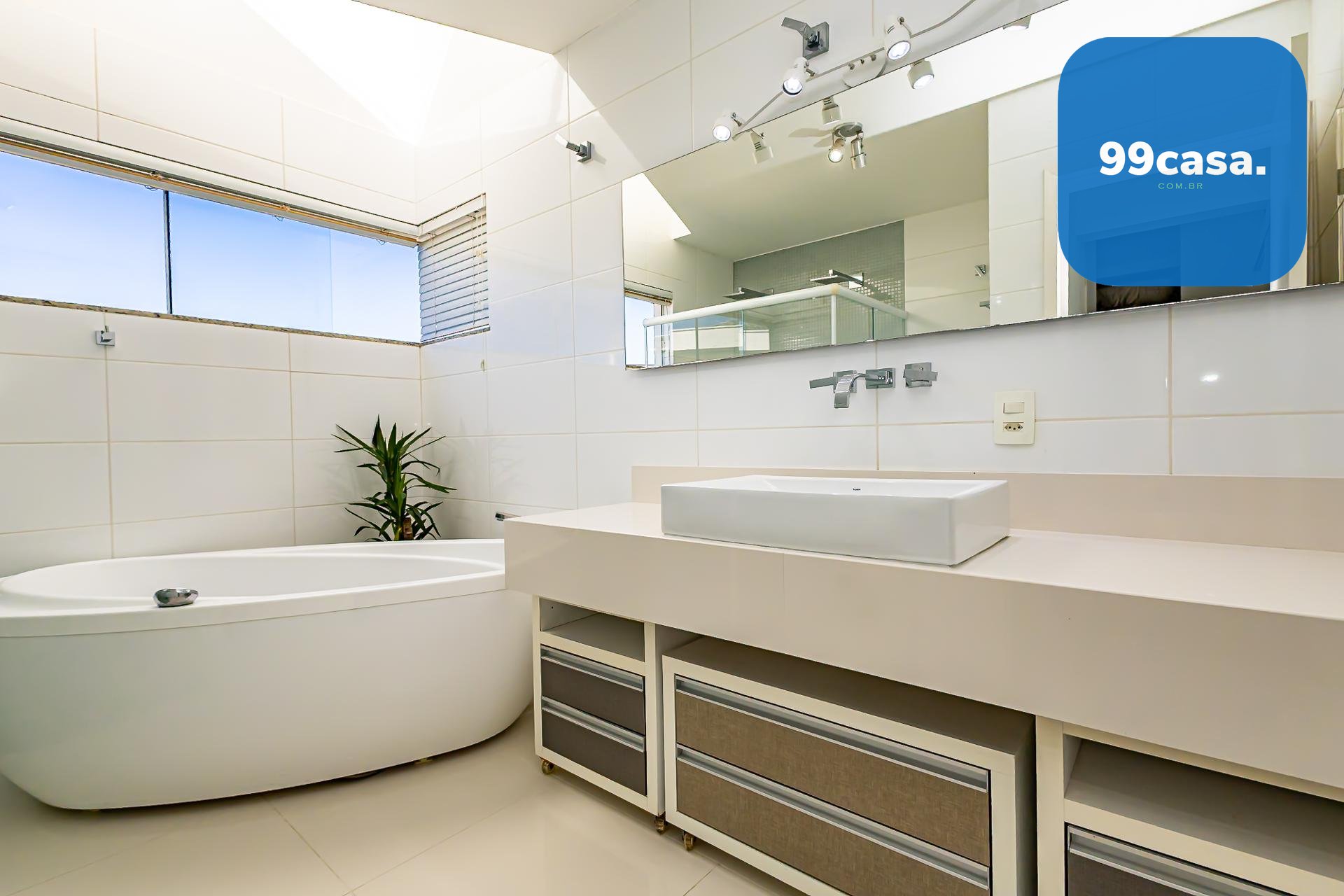 No pavimento superior também está a suíte master, que se destaca pelos dois closets independentes senhor e senhora e por um banheiro amplo, muito bem iluminado, com uma elegante banheira de imersão.