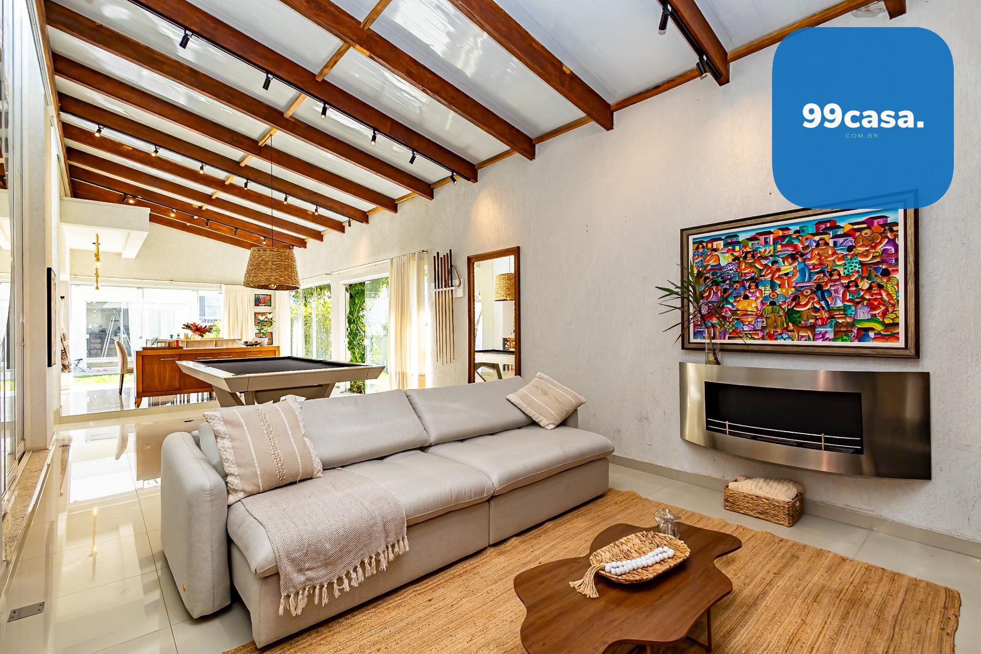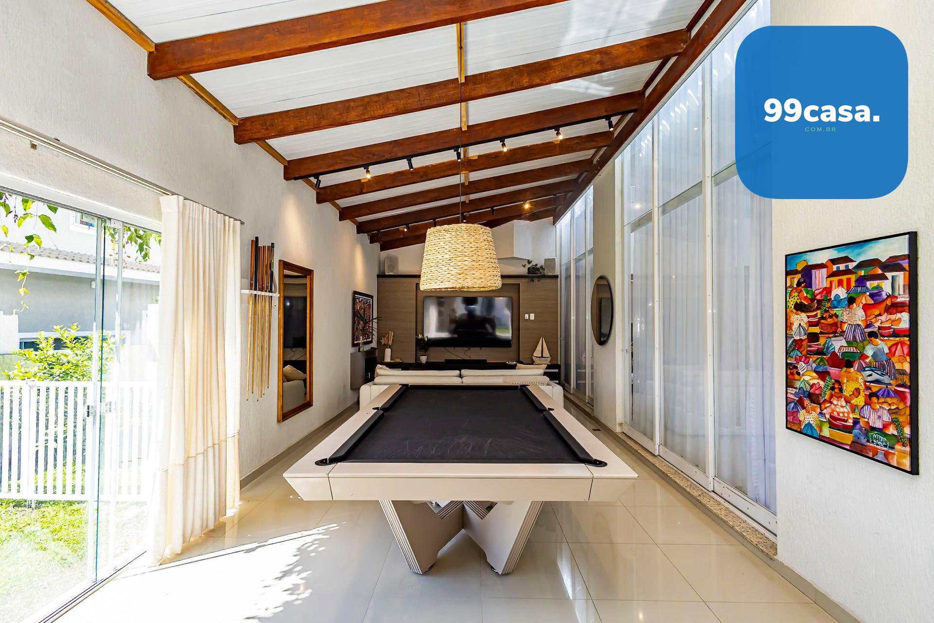 Na lateral, um ambiente especial reúne uma mesa profissional de sinuca e uma área de home para assistir televisão e relaxar, complementando a atmosfera de lazer que permeia toda a casa.