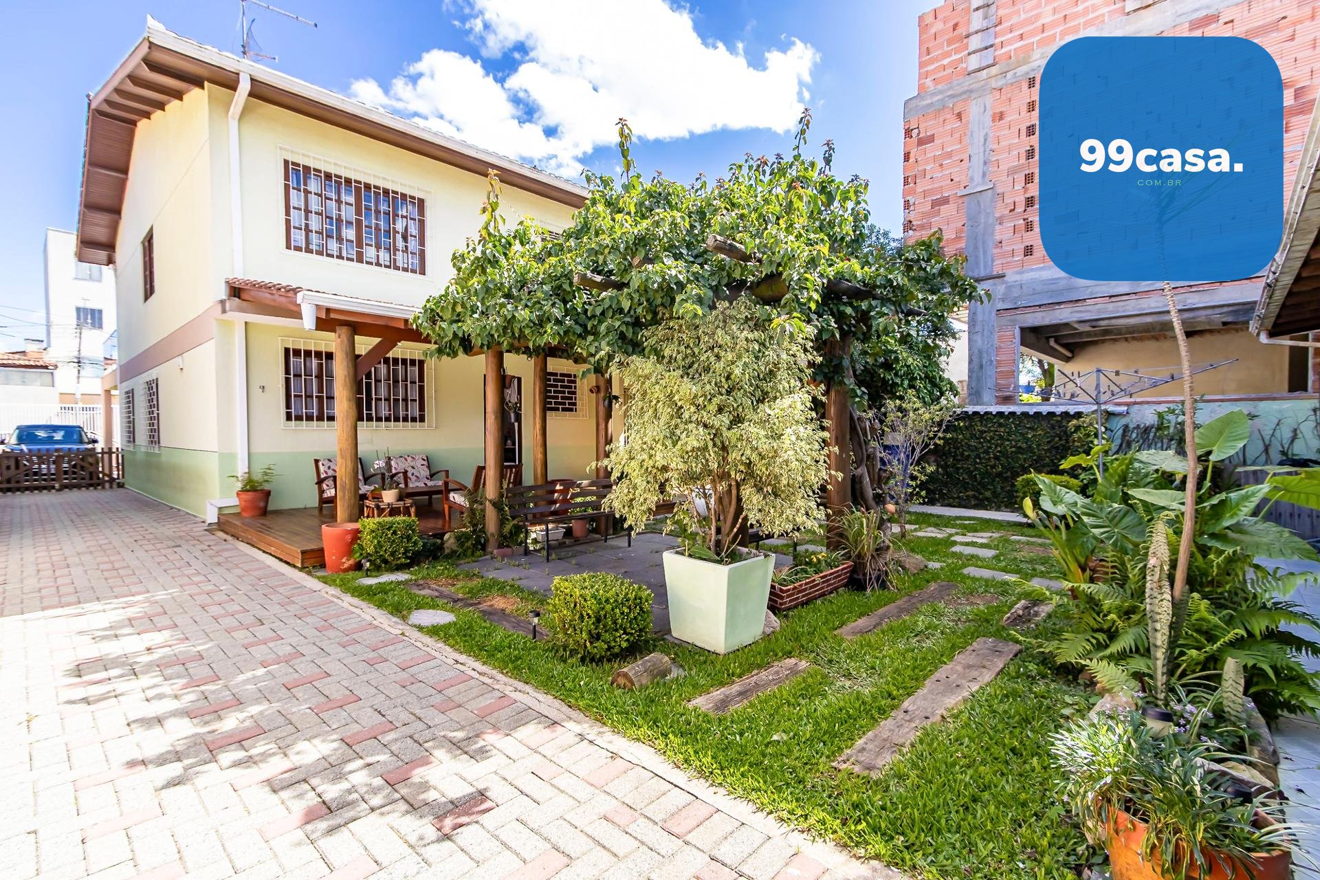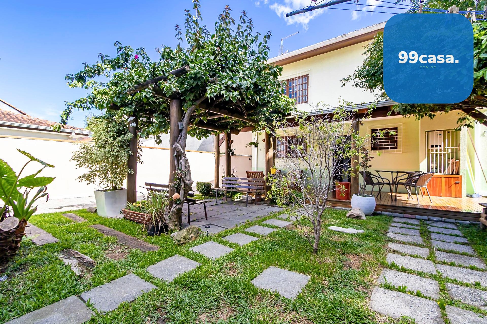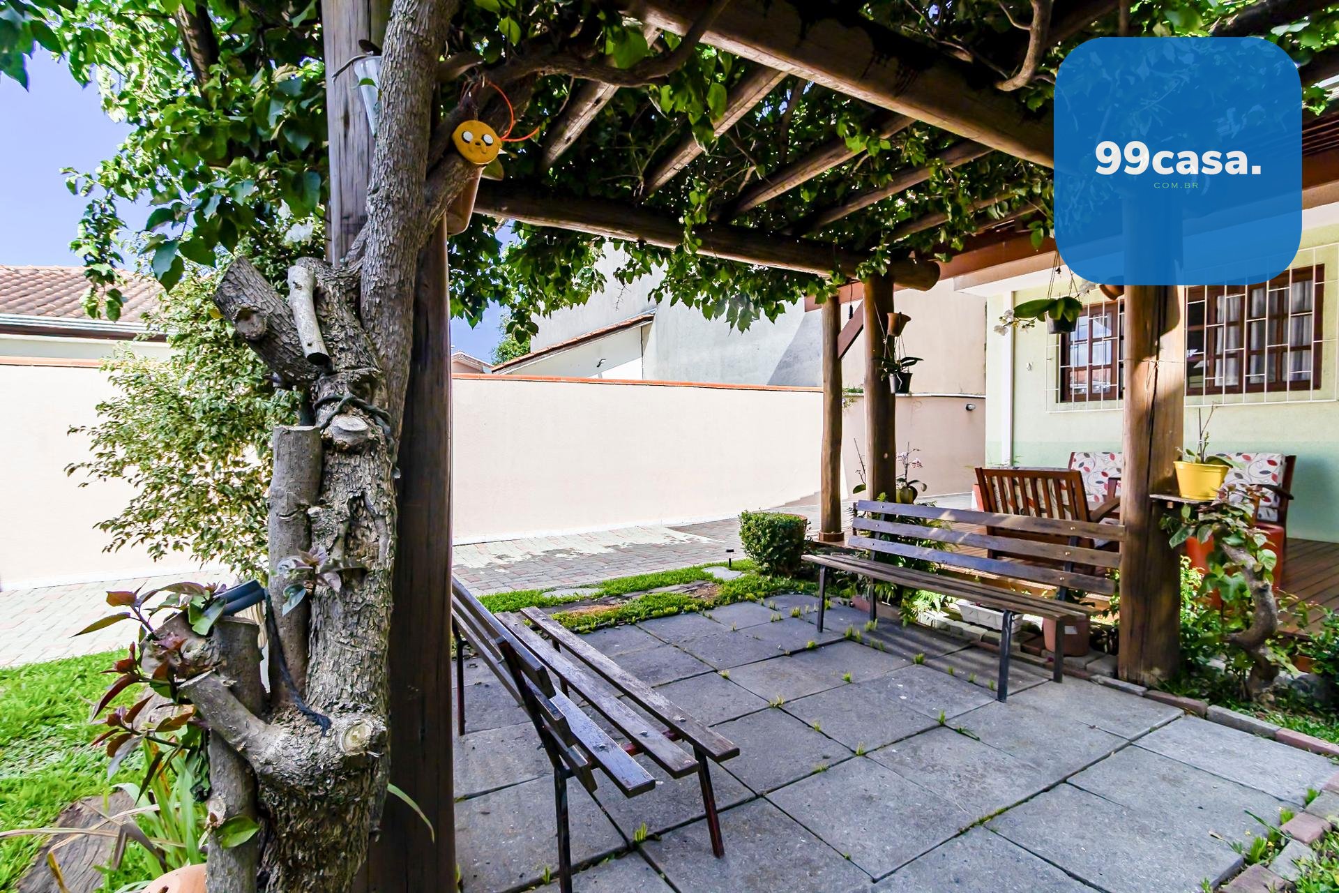 Quintal Exuberante: Destaque para a área externa, que conta com pergolado (*bougainville*), horta e diversas árvores frutíferas.