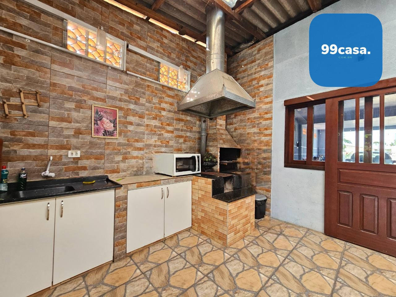 Espaço gourmet completo, com churrasqueira, fogão a lenha e bancada em granito com pia