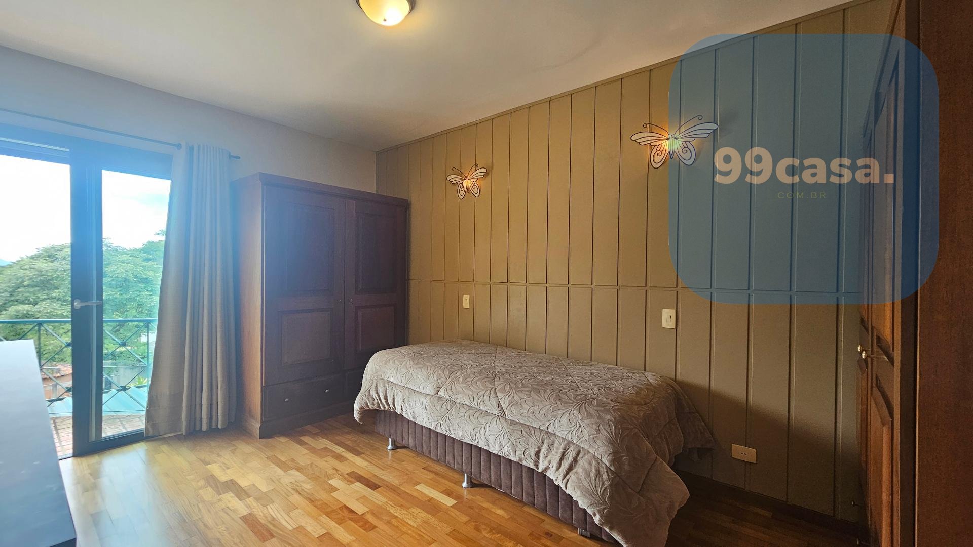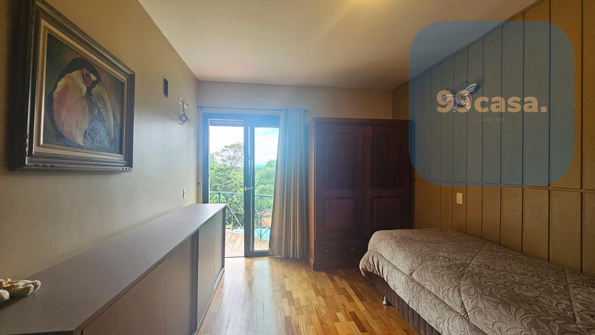 A casa tem 3 quartos, sendo 1 suíte no último andar, com closet espaçoso e banheiro com hidromassagem, com uma vista espetacular da Serra do Mar (veja o vídeo).