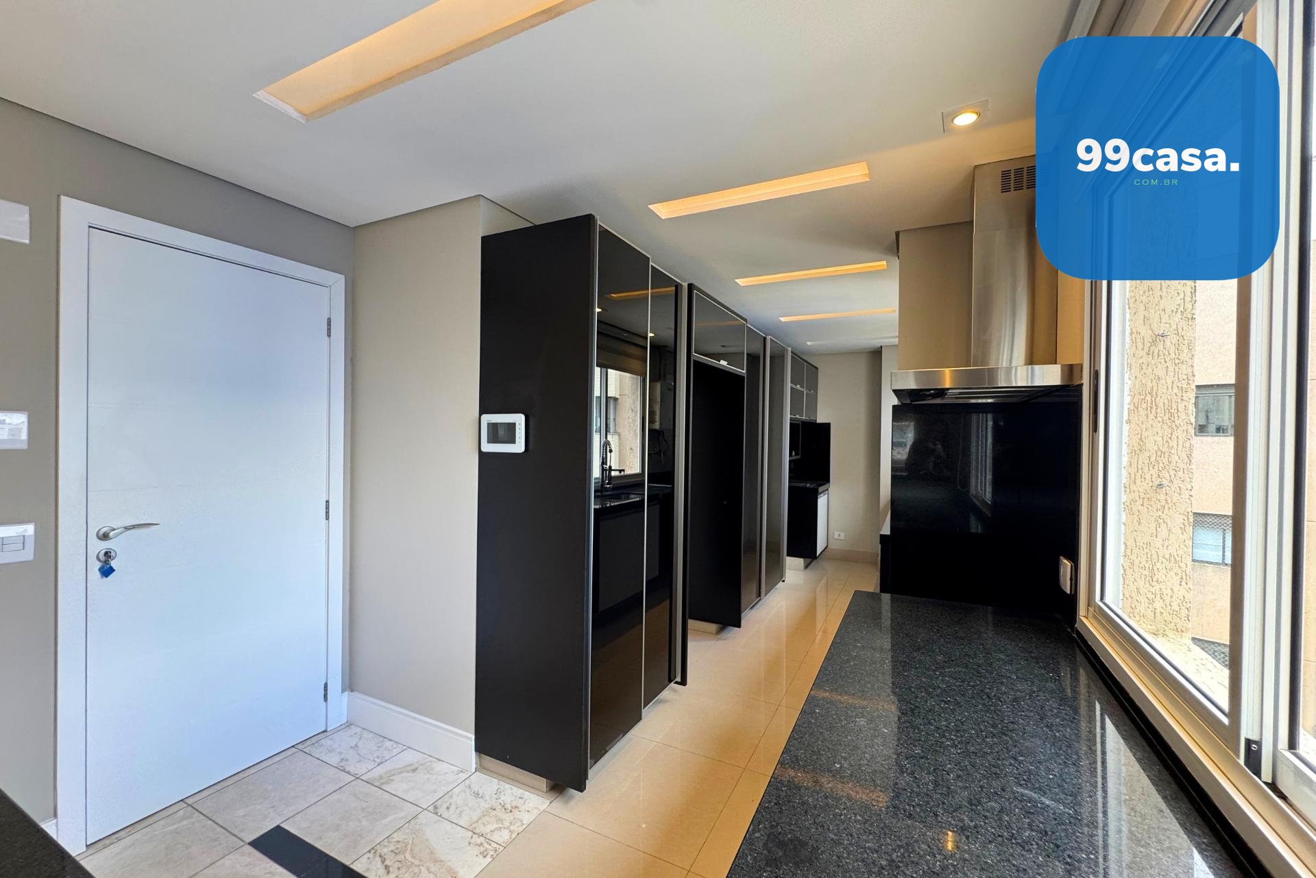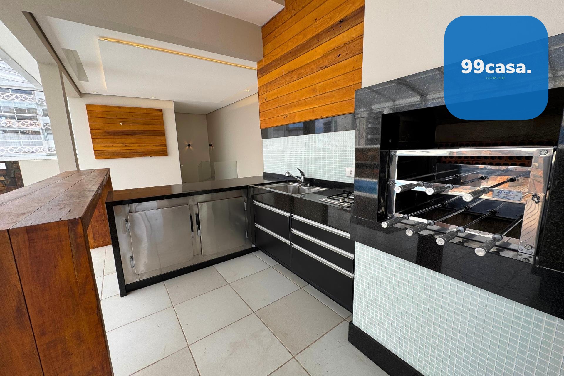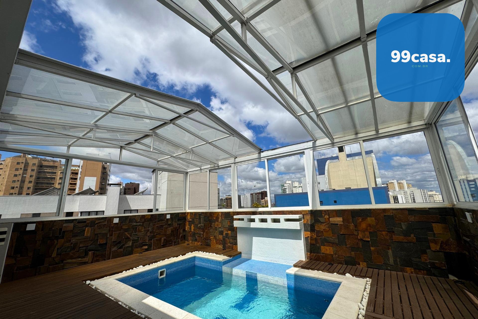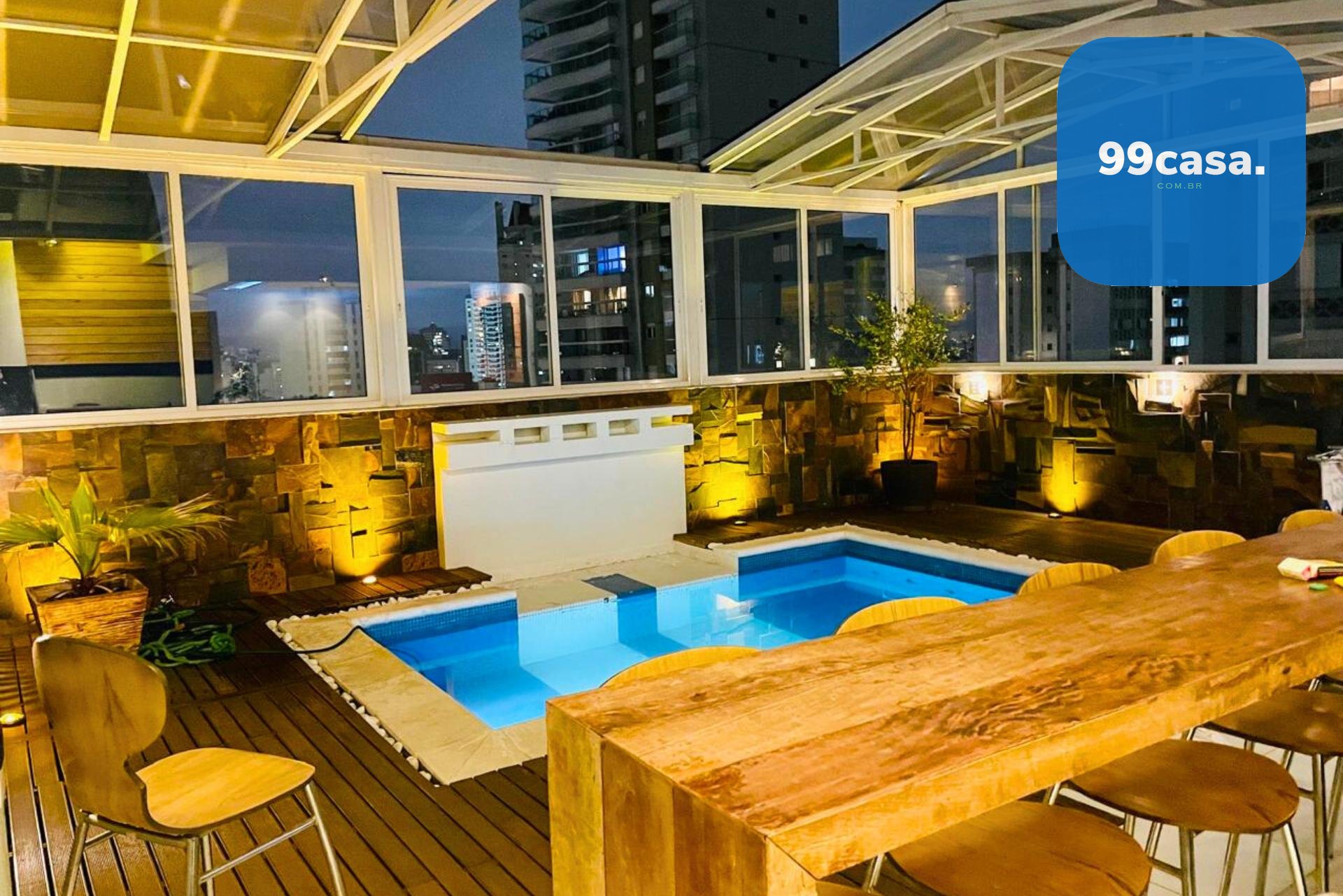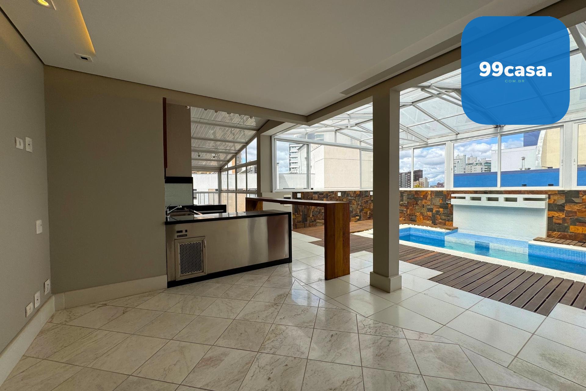 O terraço é coberto, com teto retrátil, piscina aquecida e uma churrasqueira à carvão completa para vivenciar os melhores momentos em família e amigos.