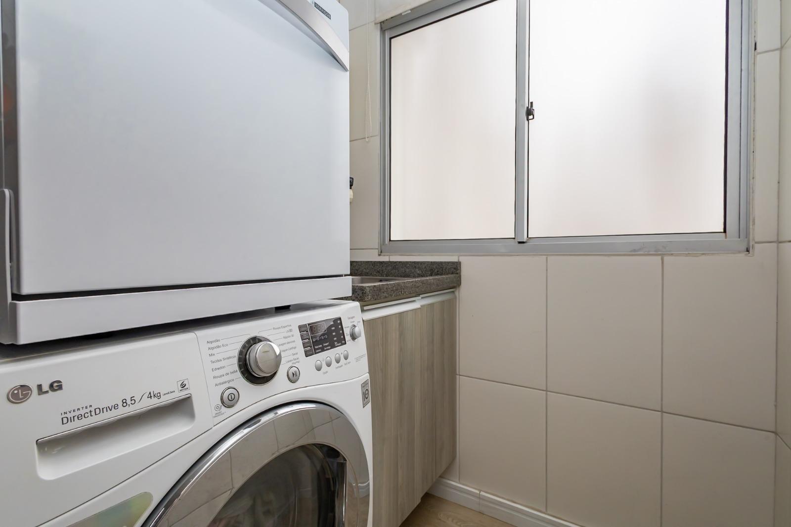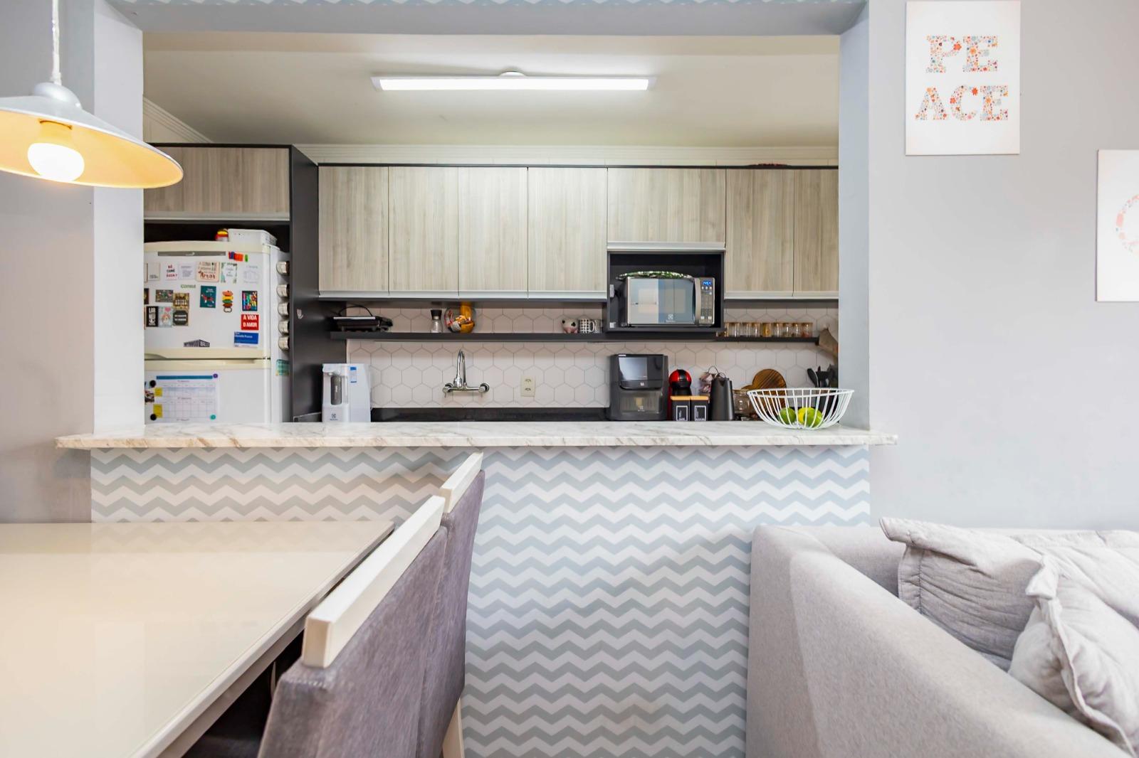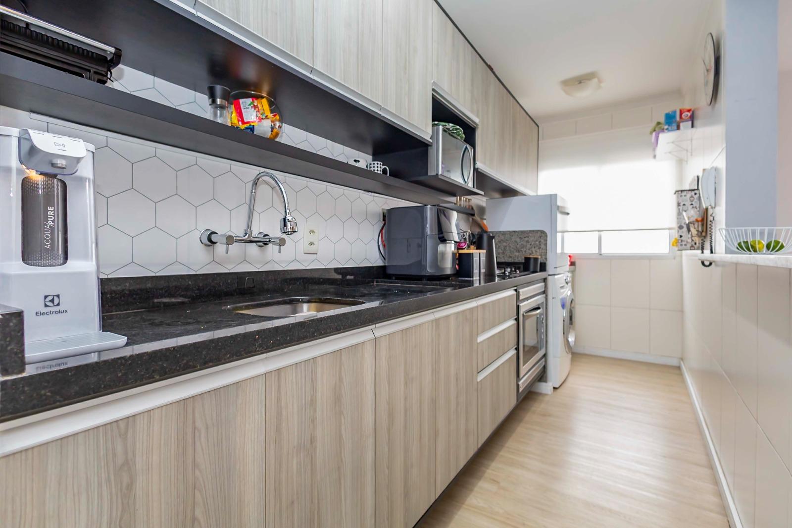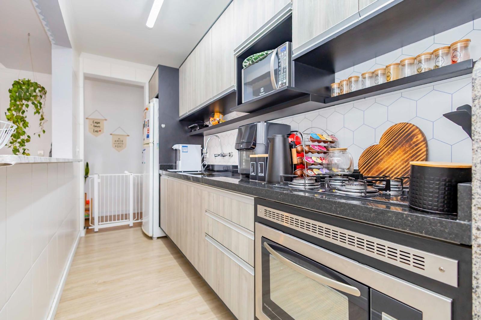Cozinha planejada e área de serviço equipadas com aquecedor a gás, forno elétrico e cooktop