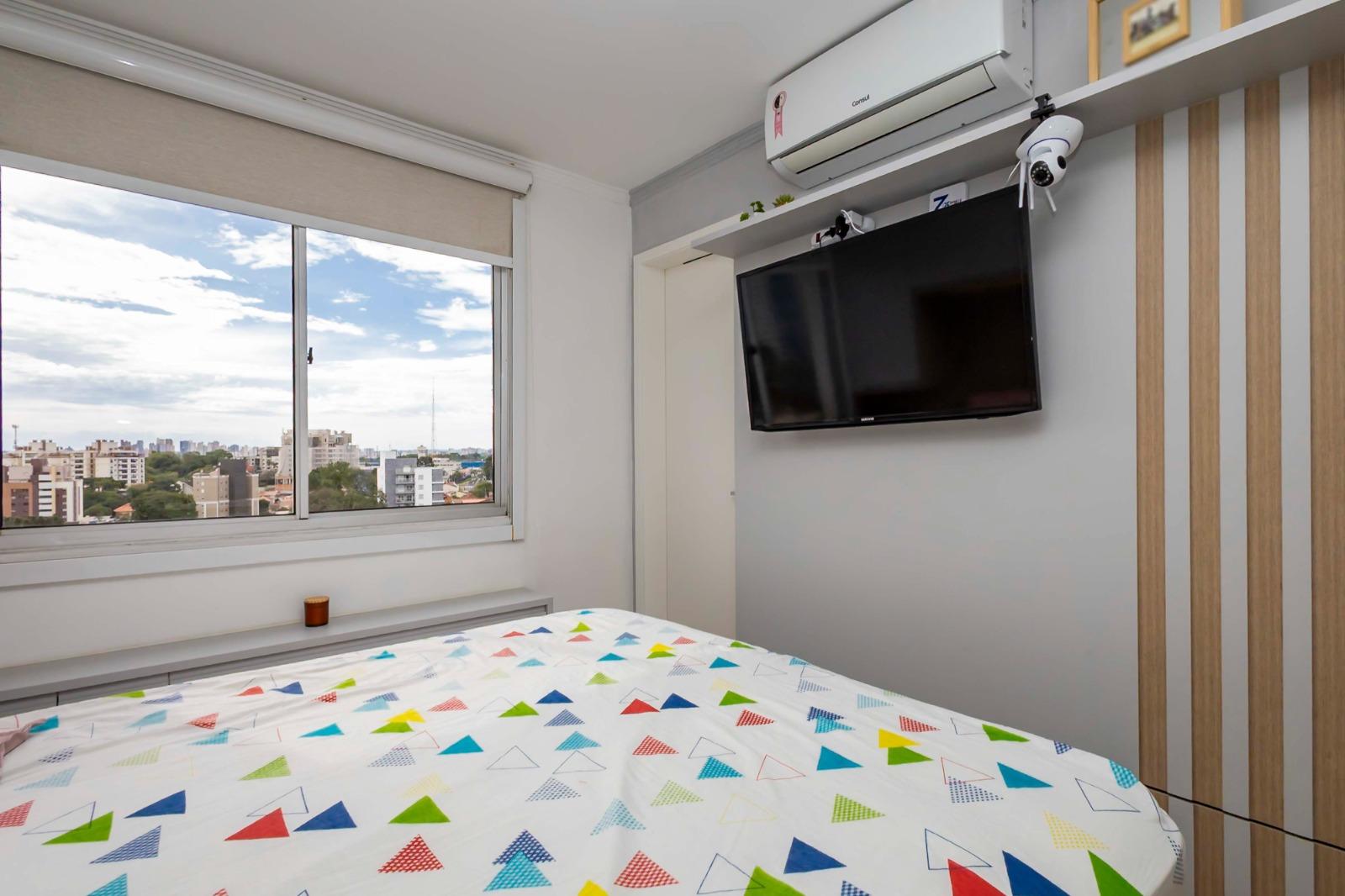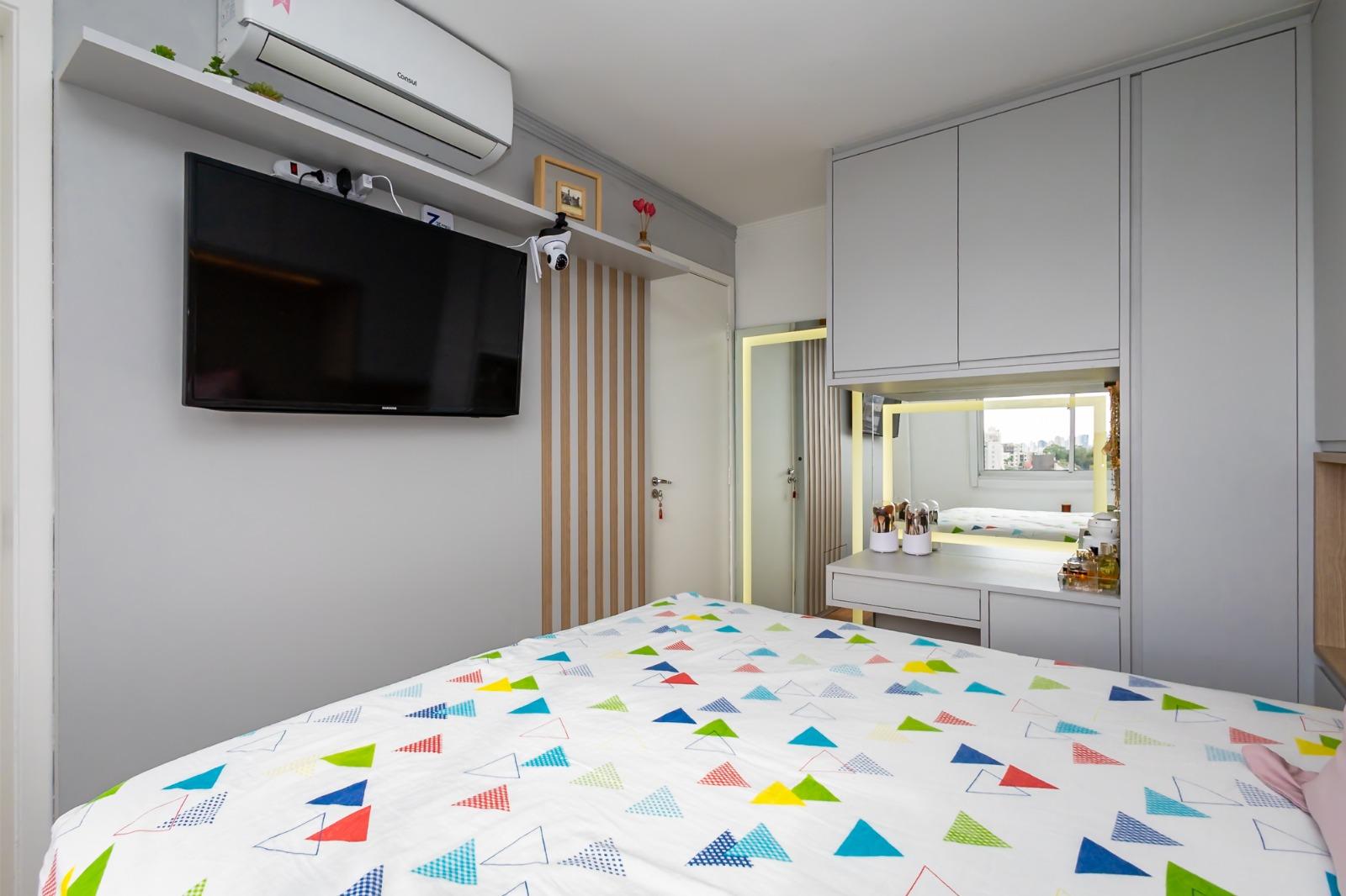 Suíte master com ar-condicionado, armários planejados, persiana blackout e banheiro reformado