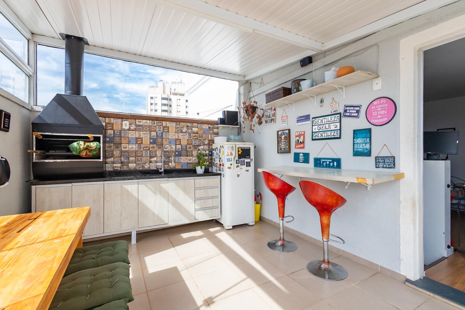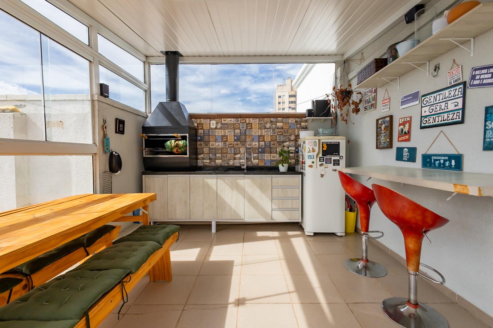 12m² cobertos com churrasqueira, pia com armário e bancada com banquetas