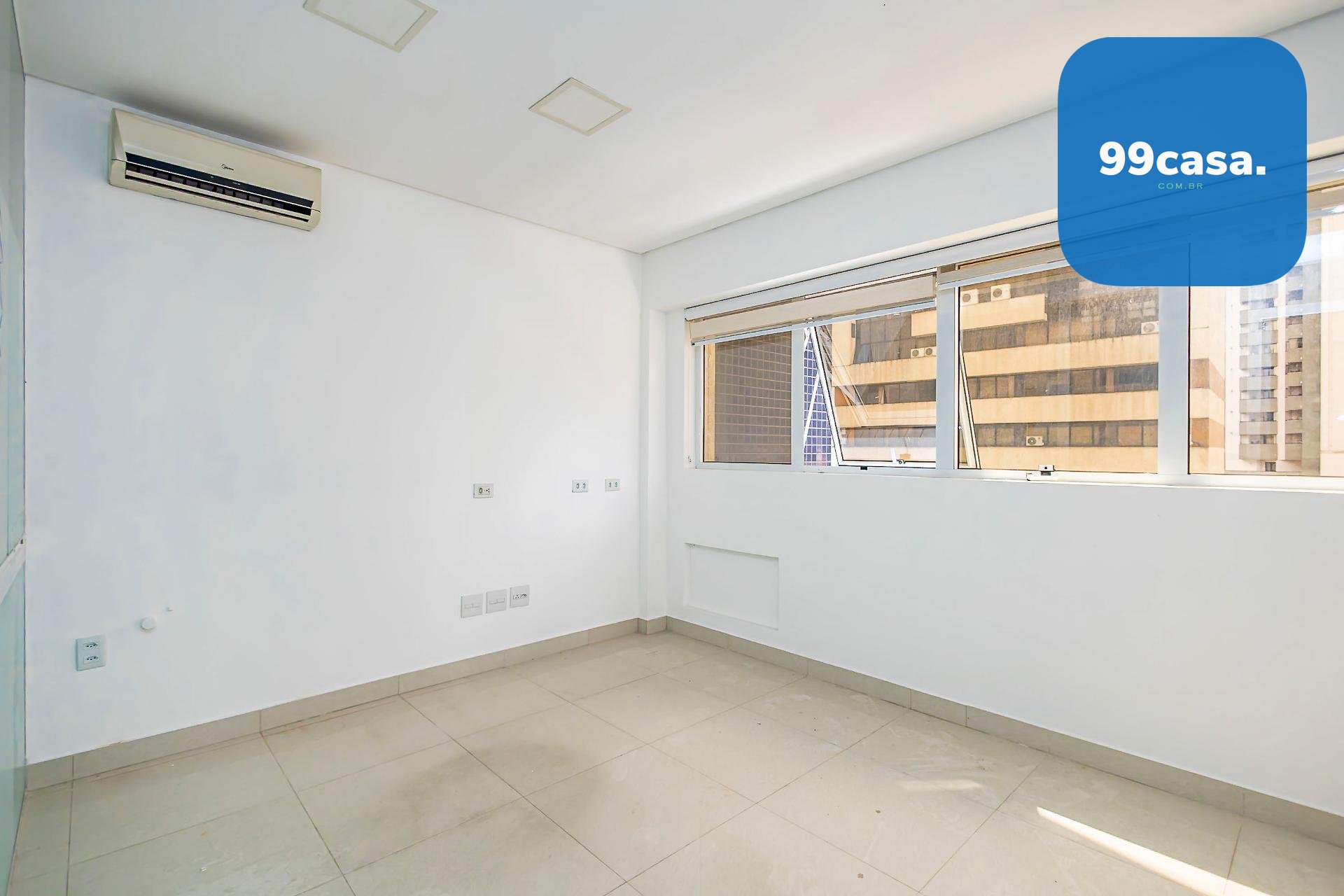 Espaço para 2 ambientes, com banheiro e ar condicionado instalado.