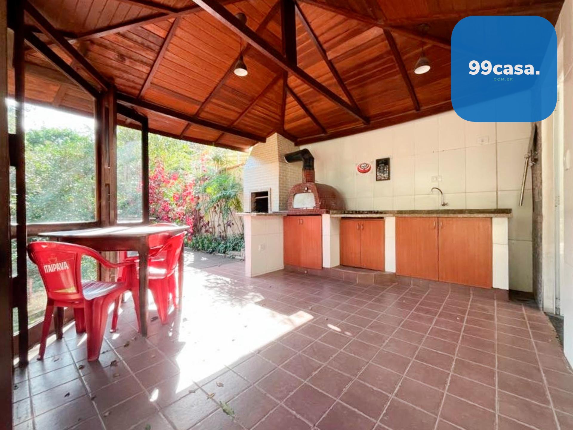 Espaço gourmet completo com churrasqueira, cooktop e forno de pizza a lenha