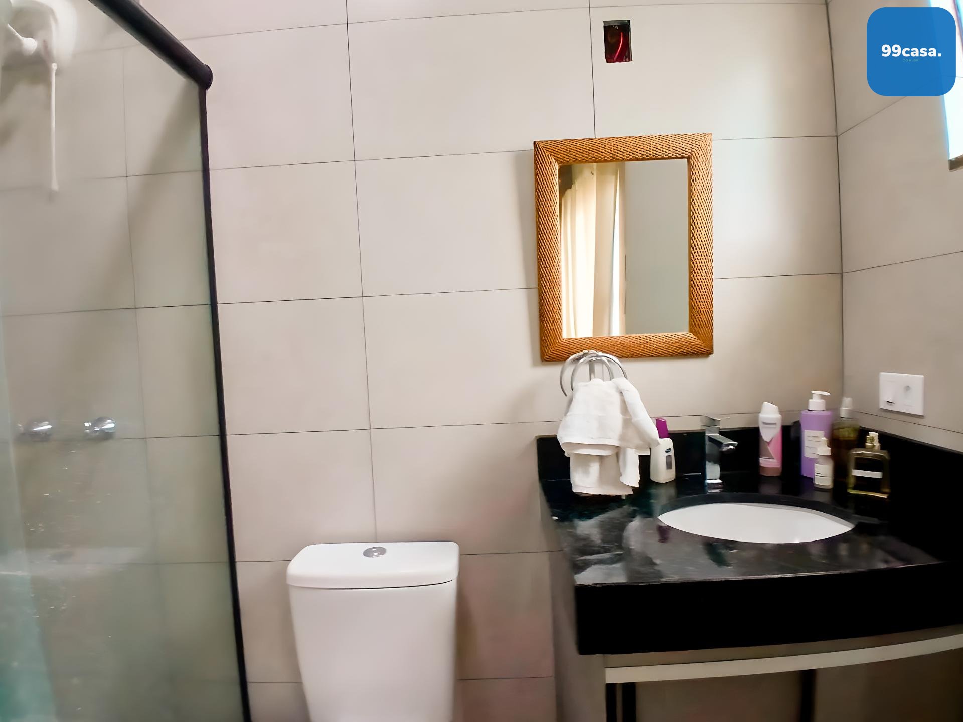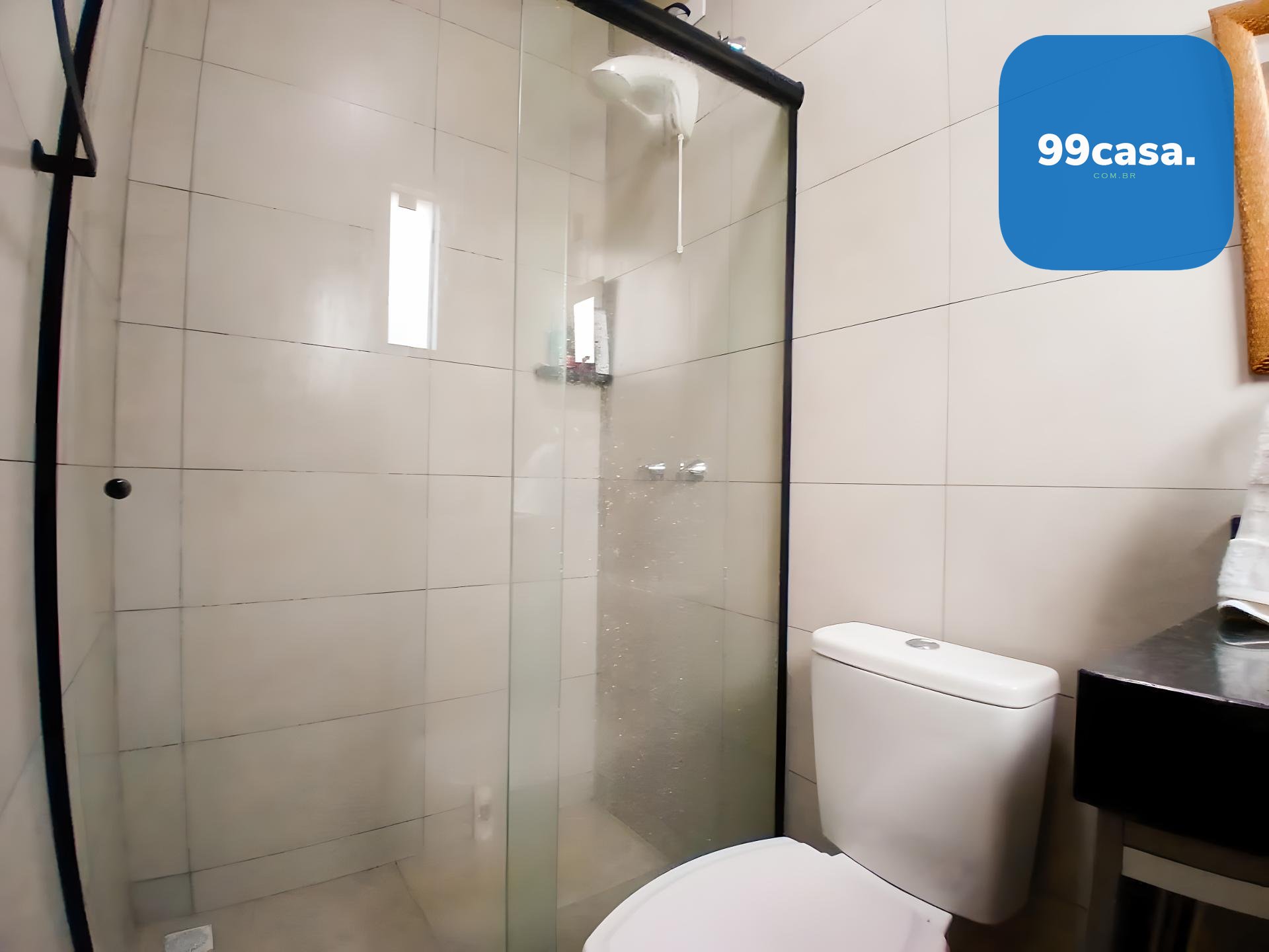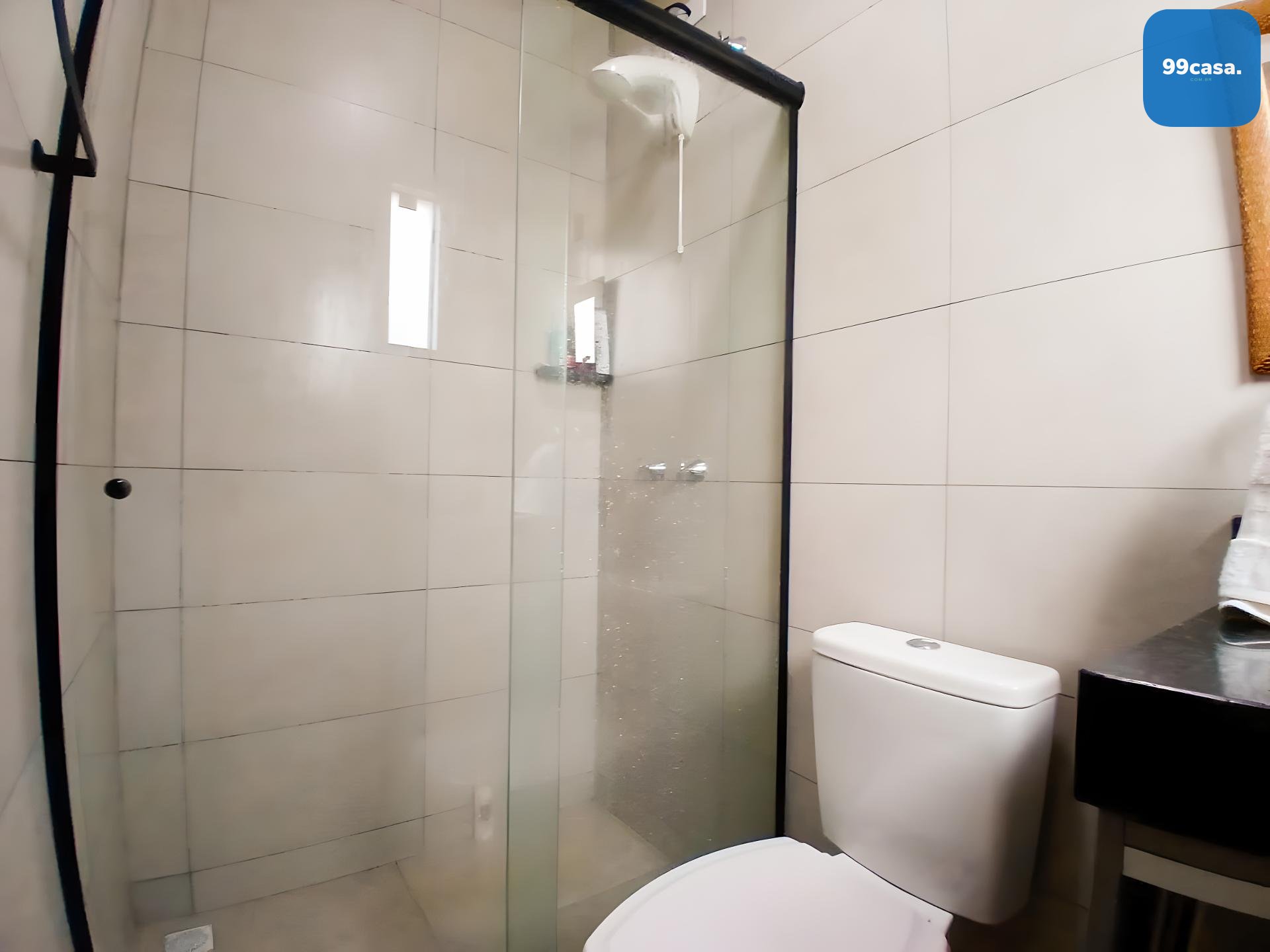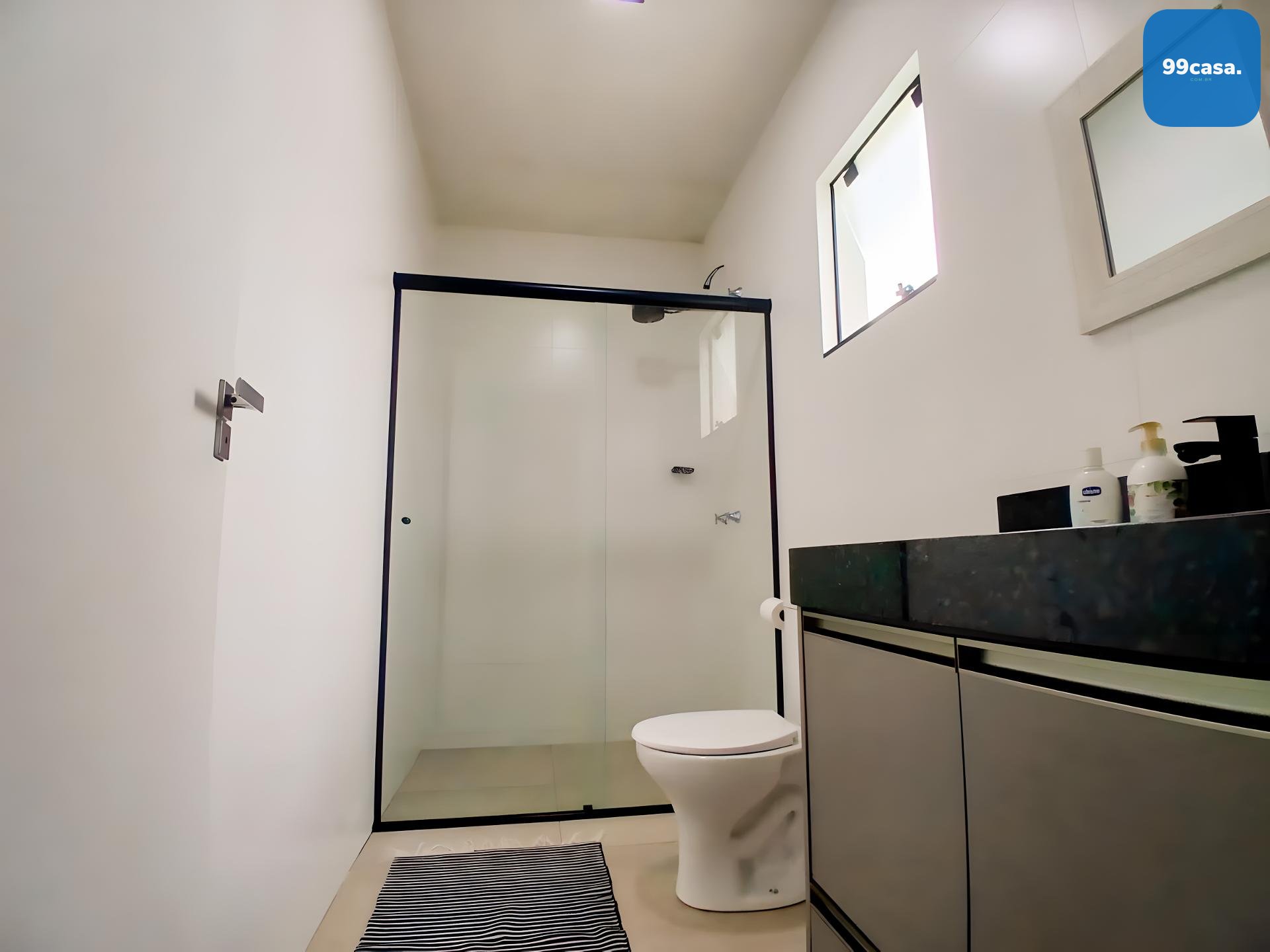 Banheiro social grande, também com armário e box.