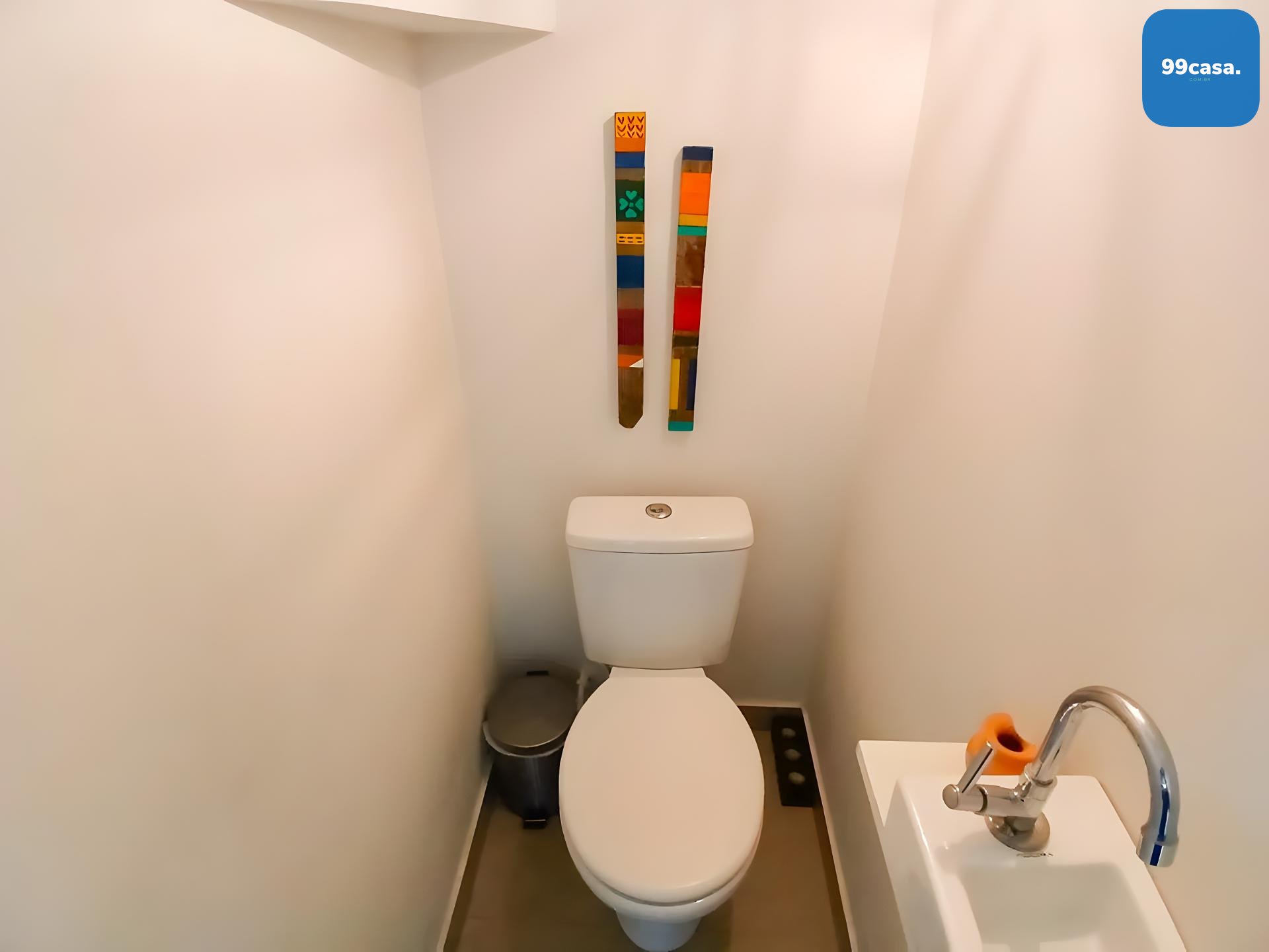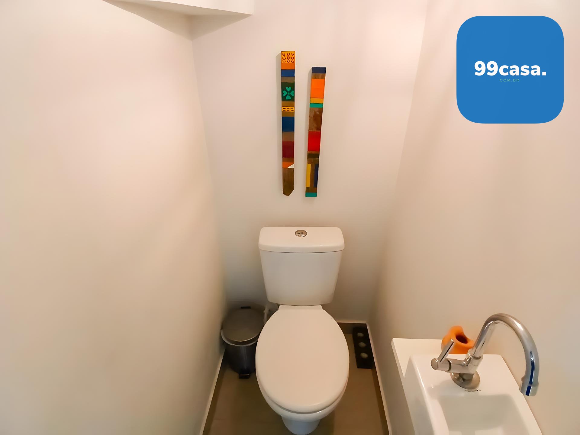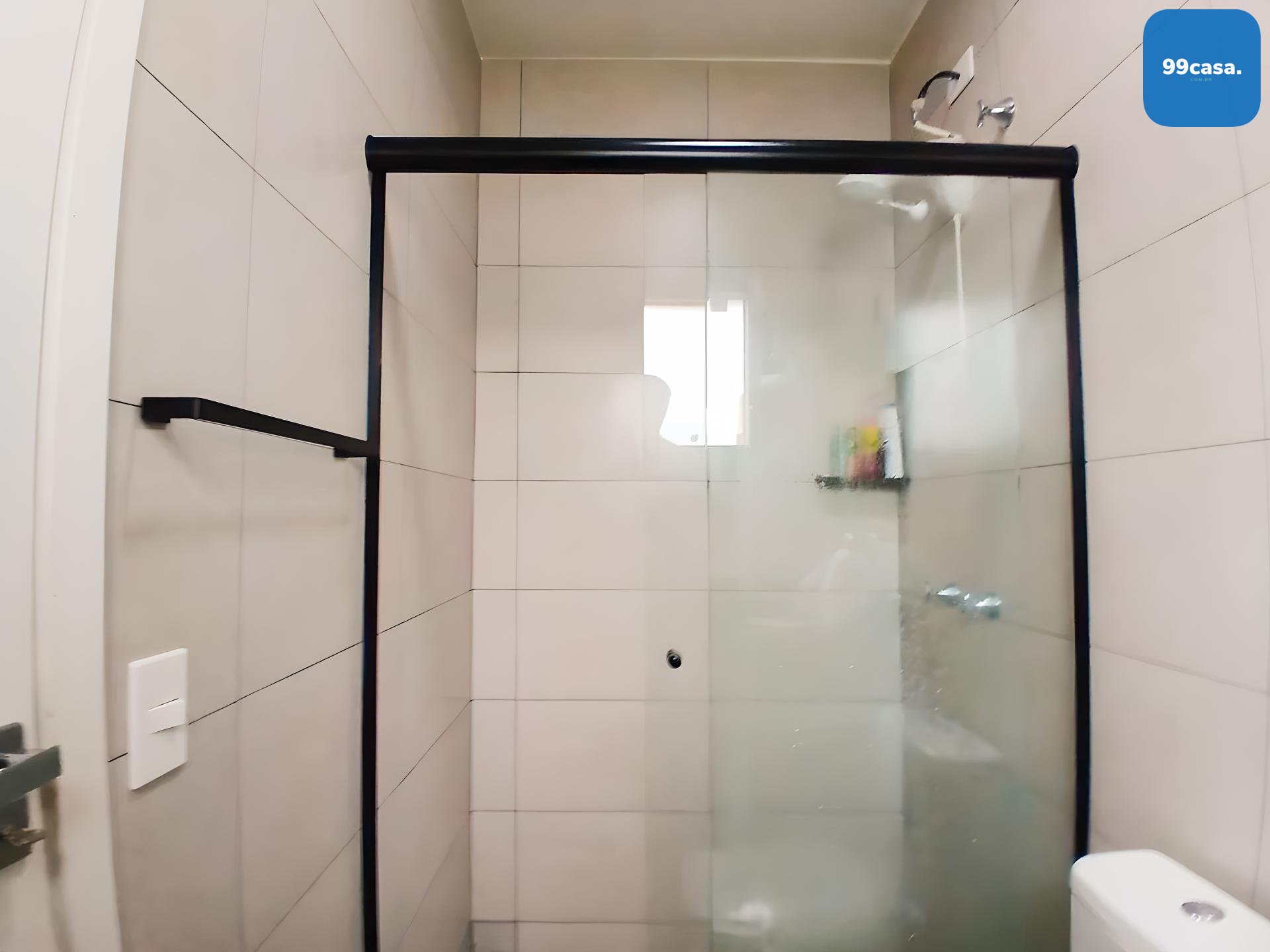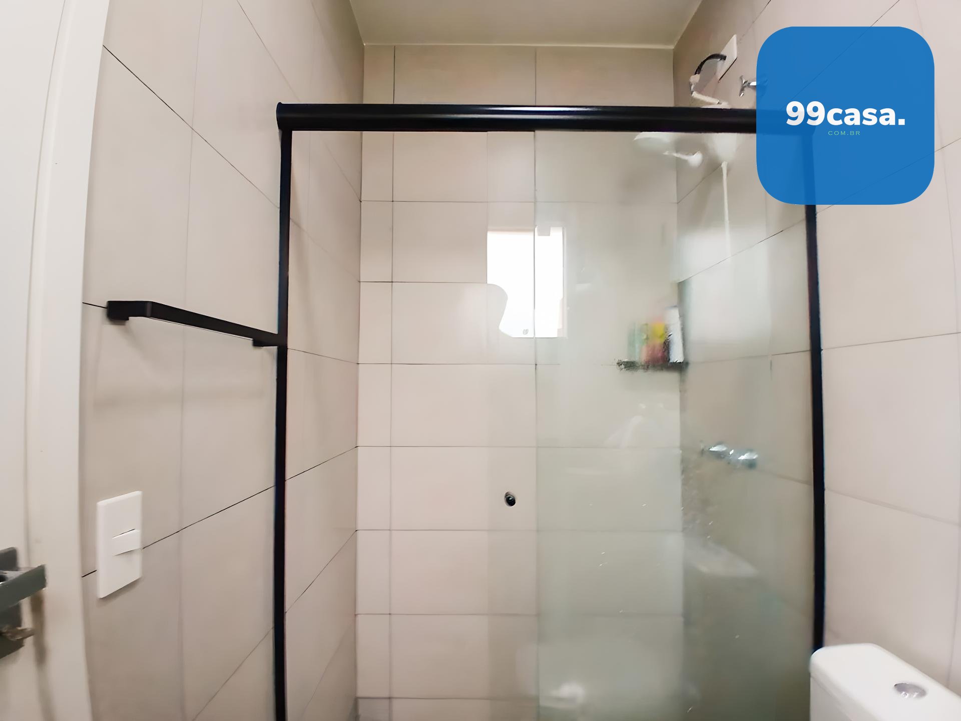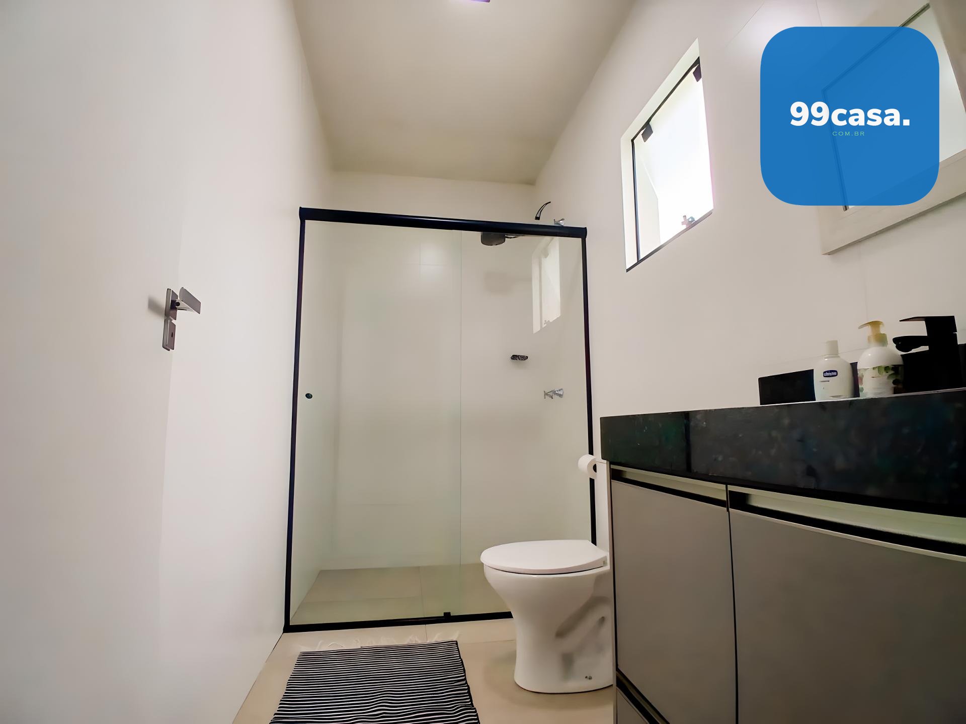 Banheiro social grande, também com armário e box.