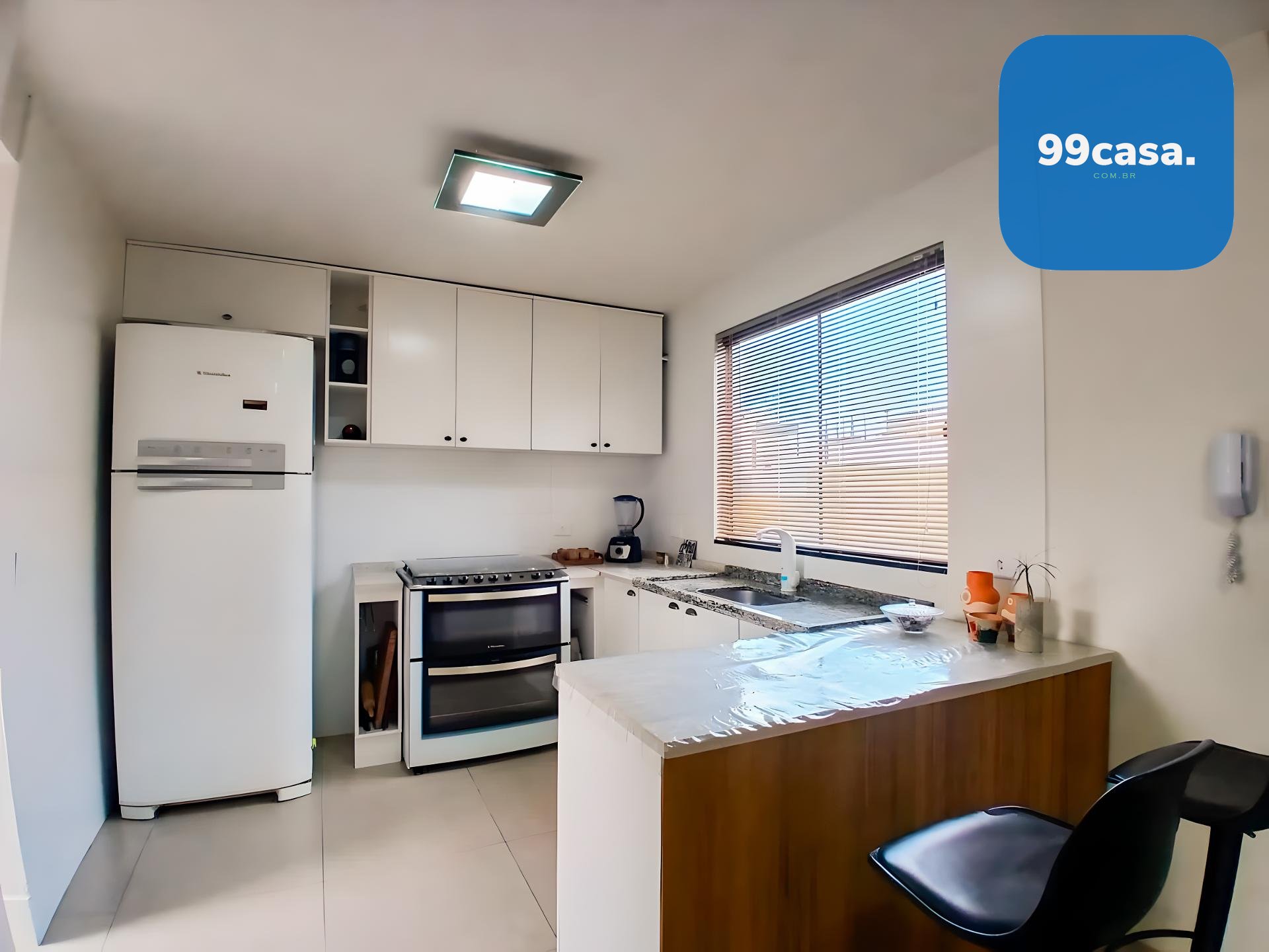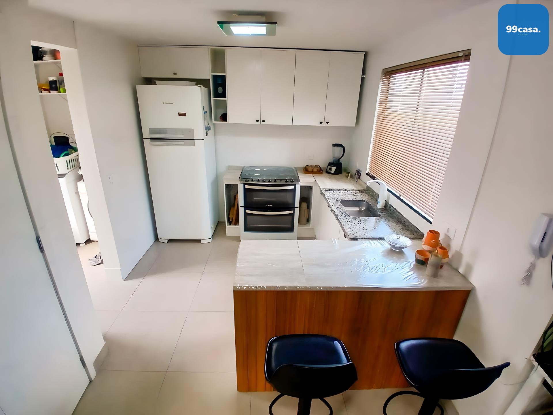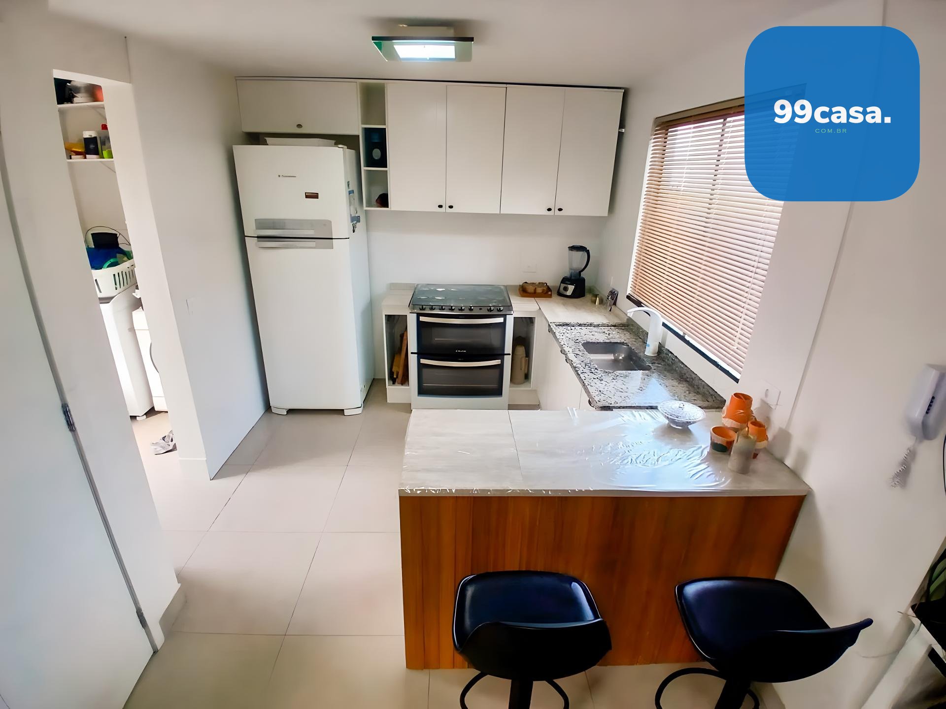 Cozinha americana com móveis planejados e bancada em granito.