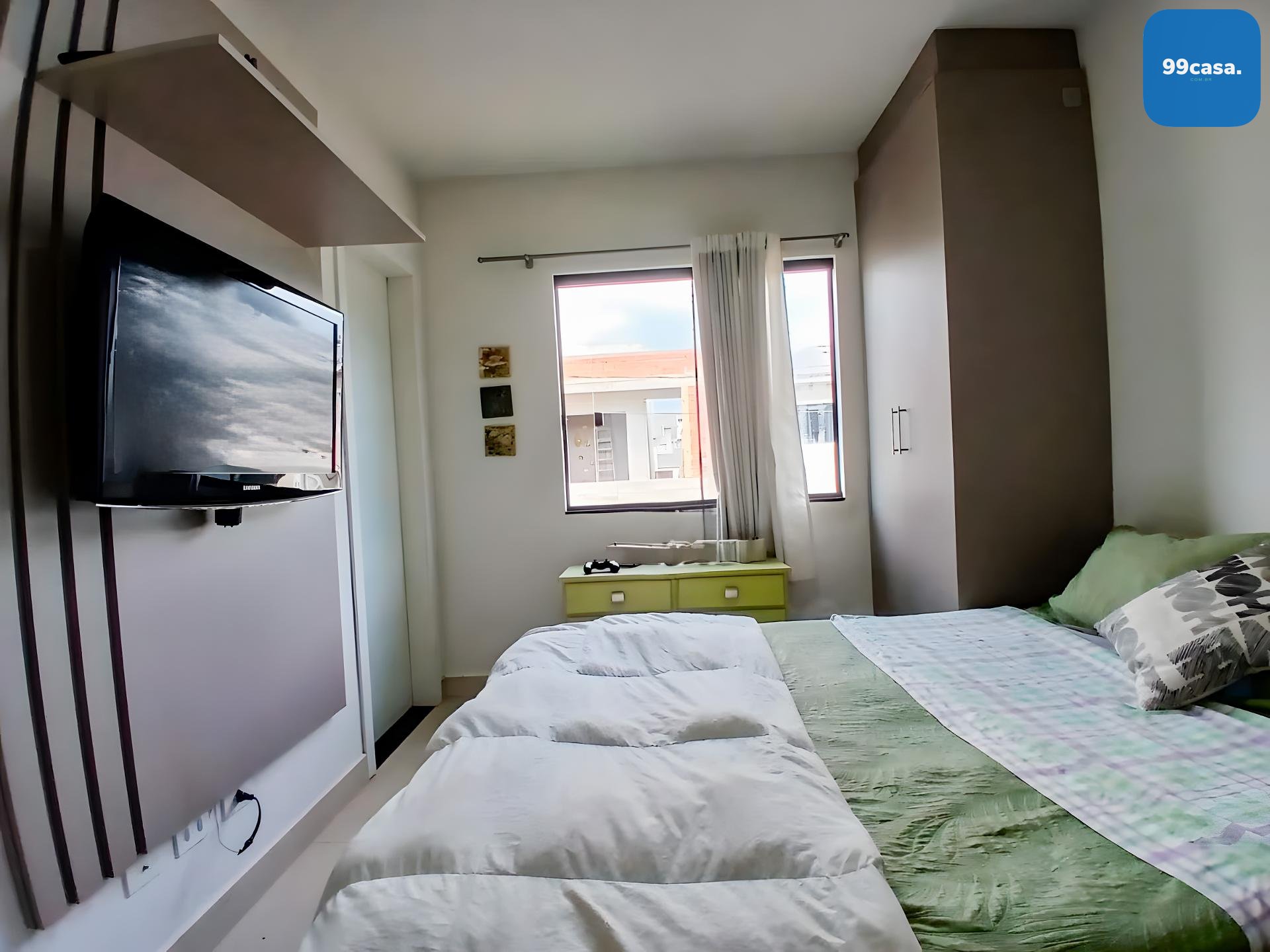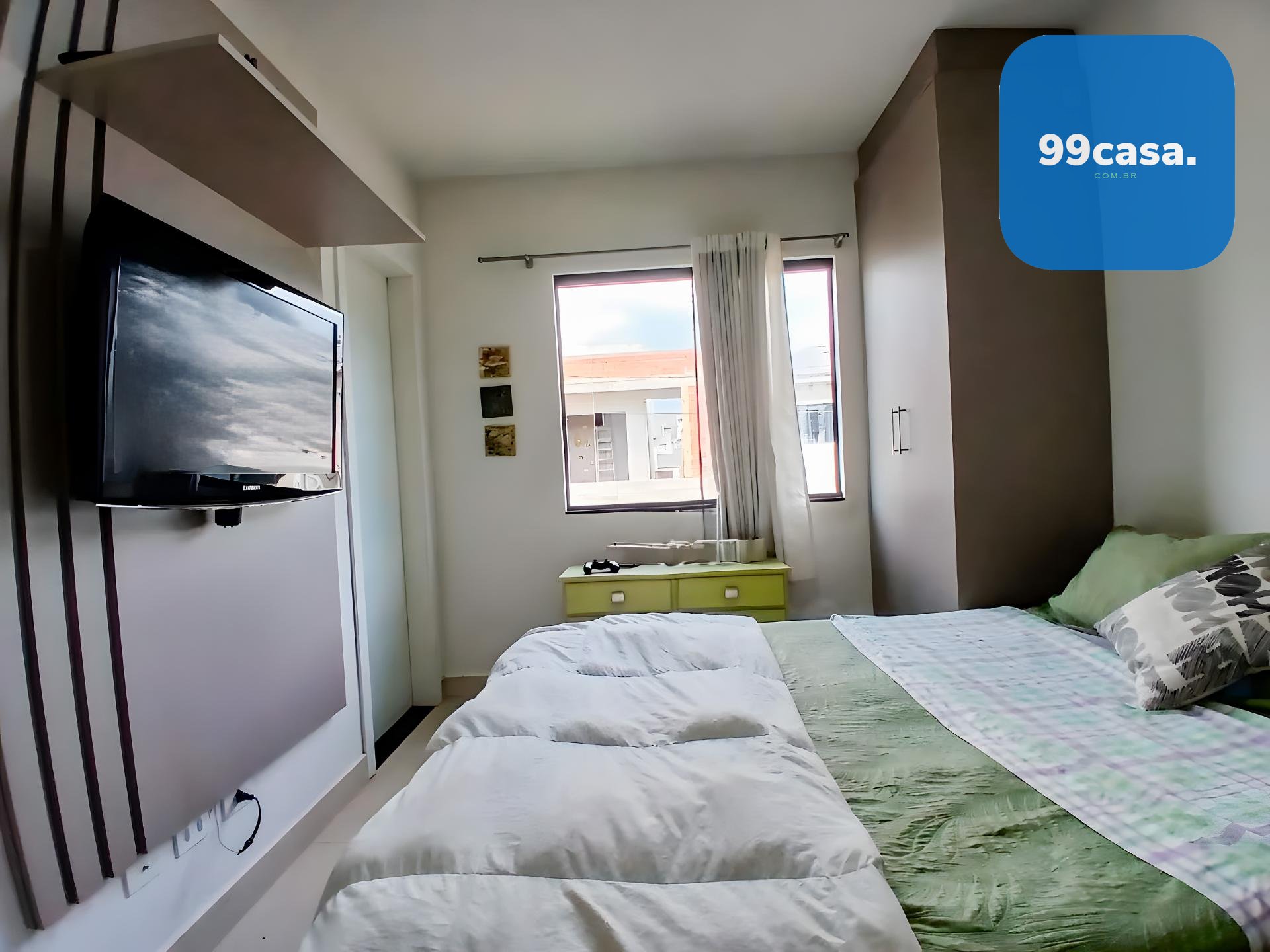 Suíte ampla com armários planejados e painel para TV.